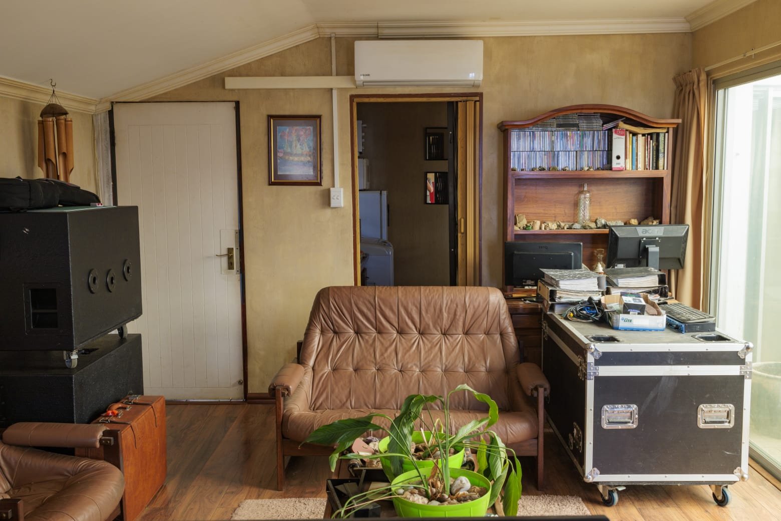 * Living room with Laminated flooring and an air conditioner with a sliding door to garden.