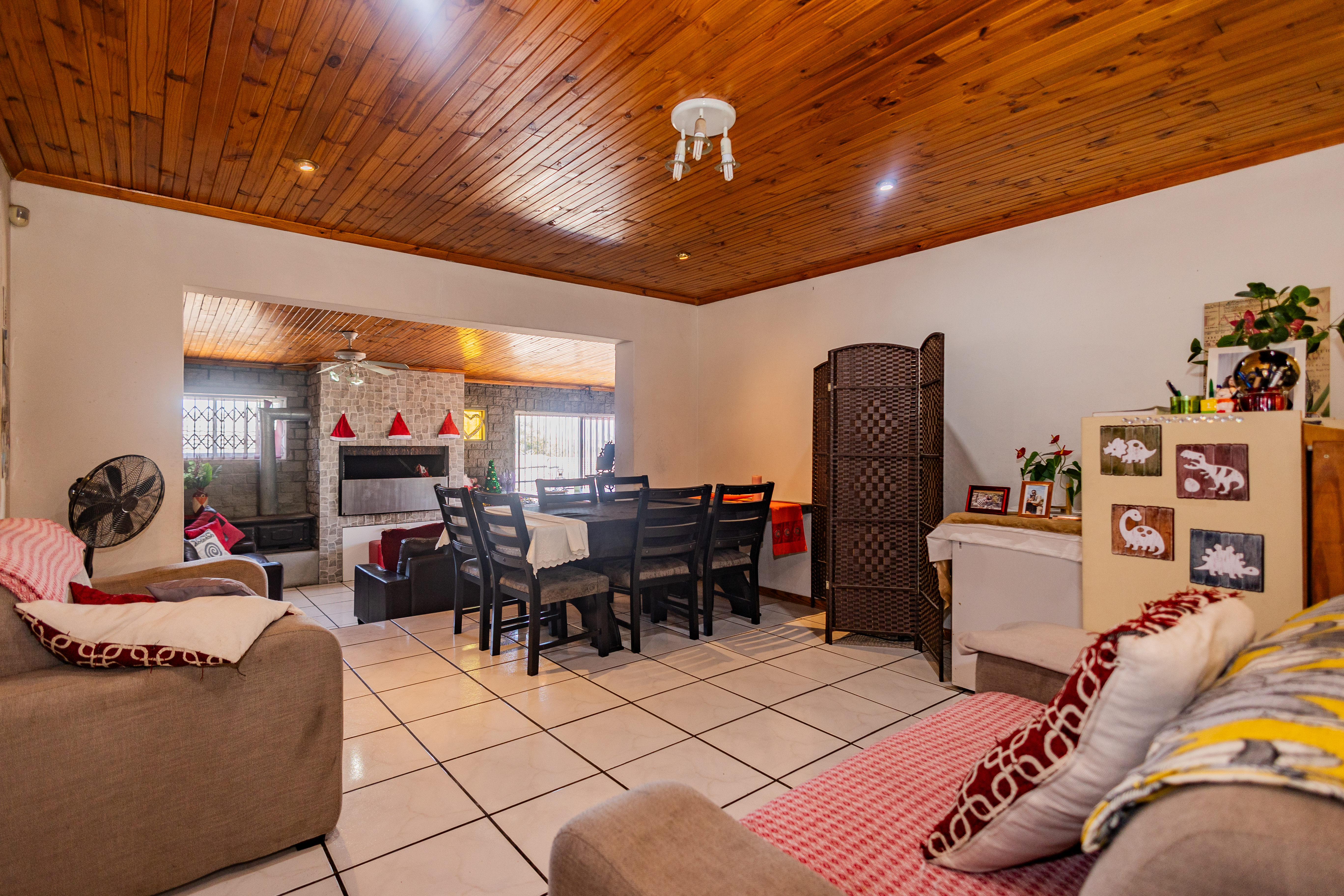 Upon entry, the home opens into four distinct living areas—an entry lounge, dining room, TV/work area, and braai room—creating a versatile and welcoming environment. The entry lounge leads into a large and inviting main lounge, setting the tone for the spacious interiors