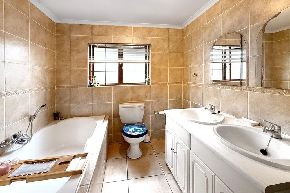 The open-plan kitchen and dining area with double volume ceilings are a chef's delight, featuring ample cupboard space and elegant granite countertops. The separate scullery adds convenience with room for two appliances and easy access to the courtyard, making meal prep and entertaining a breeze.
