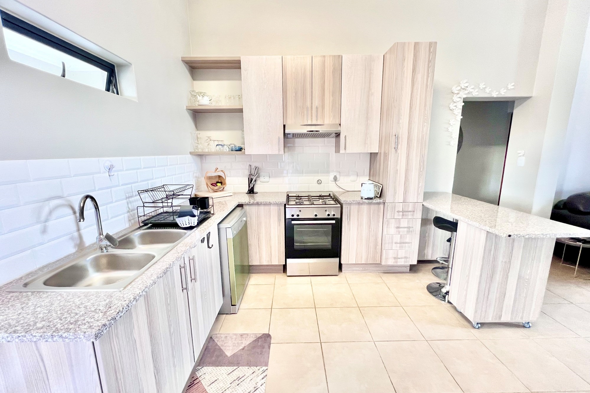 An open-plan kitchen with a gas stove and sleek countertops flows into a bright living area that opens onto a private balcony, ideal for relaxed mornings or unwinding at the end of the day.