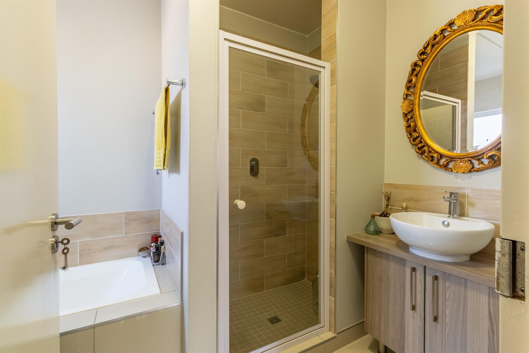 The bathroom is a tranquil haven, with a basin, bath, and shower – perfect for unwinding after a long day.