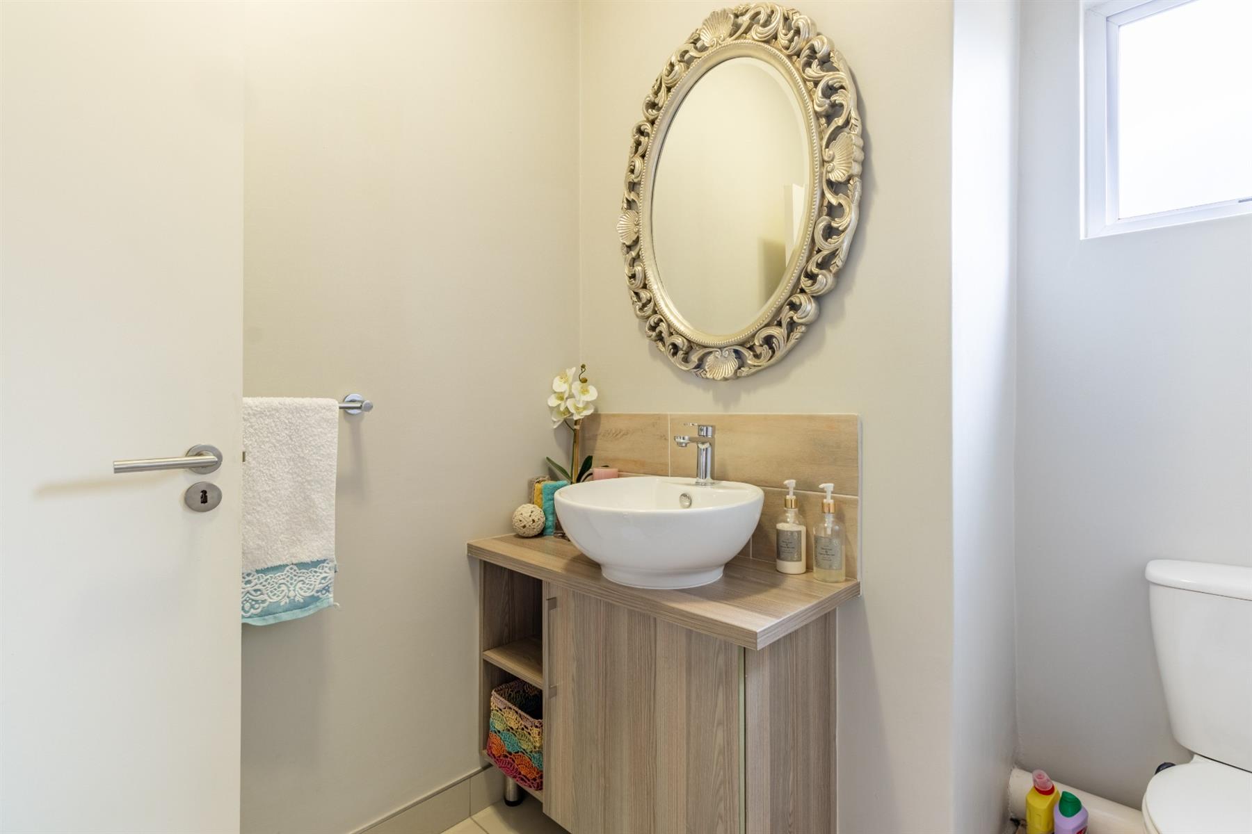 The full bathroom is beautifully designed with fixtures. The landscaped surroundings add to the overall aesthetic of the property, creating a tranquil and picturesque environment.