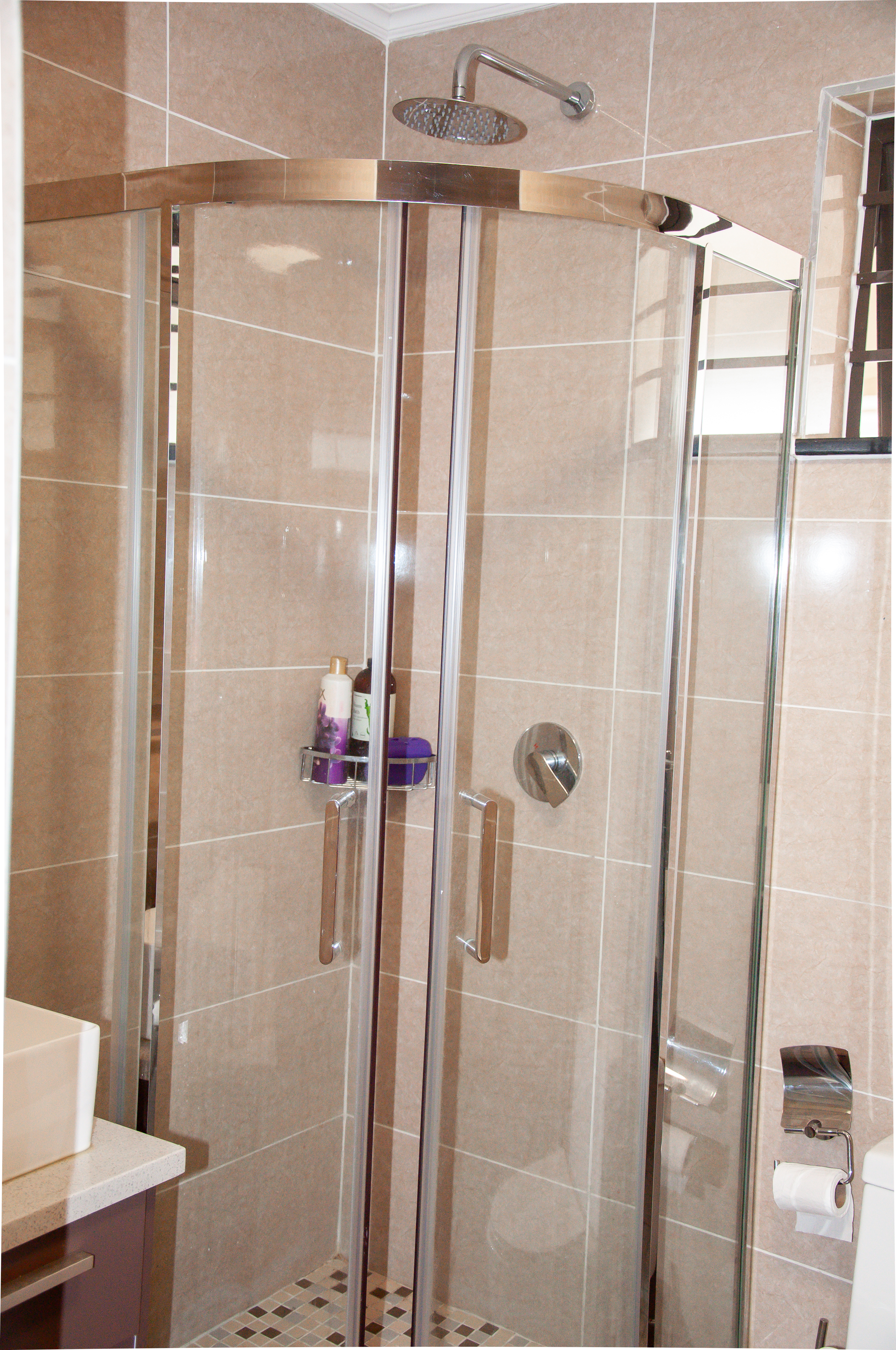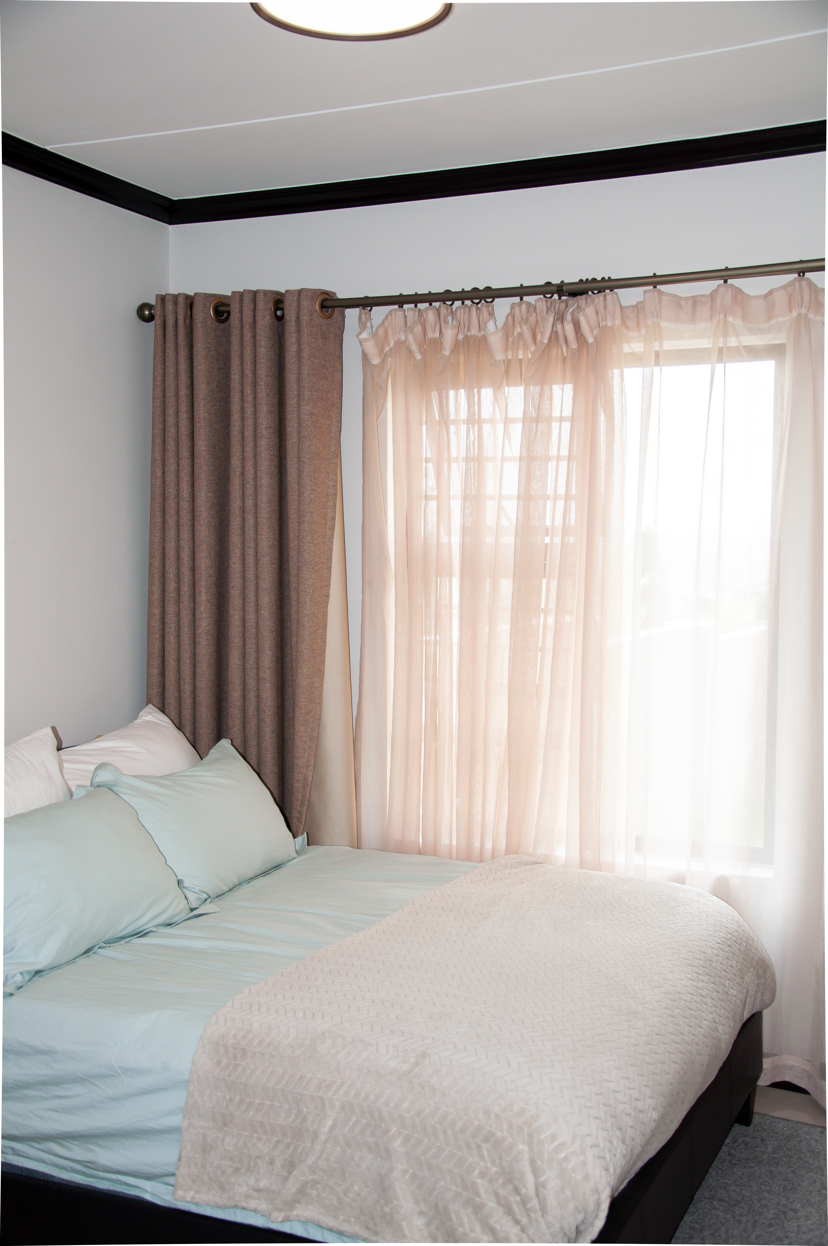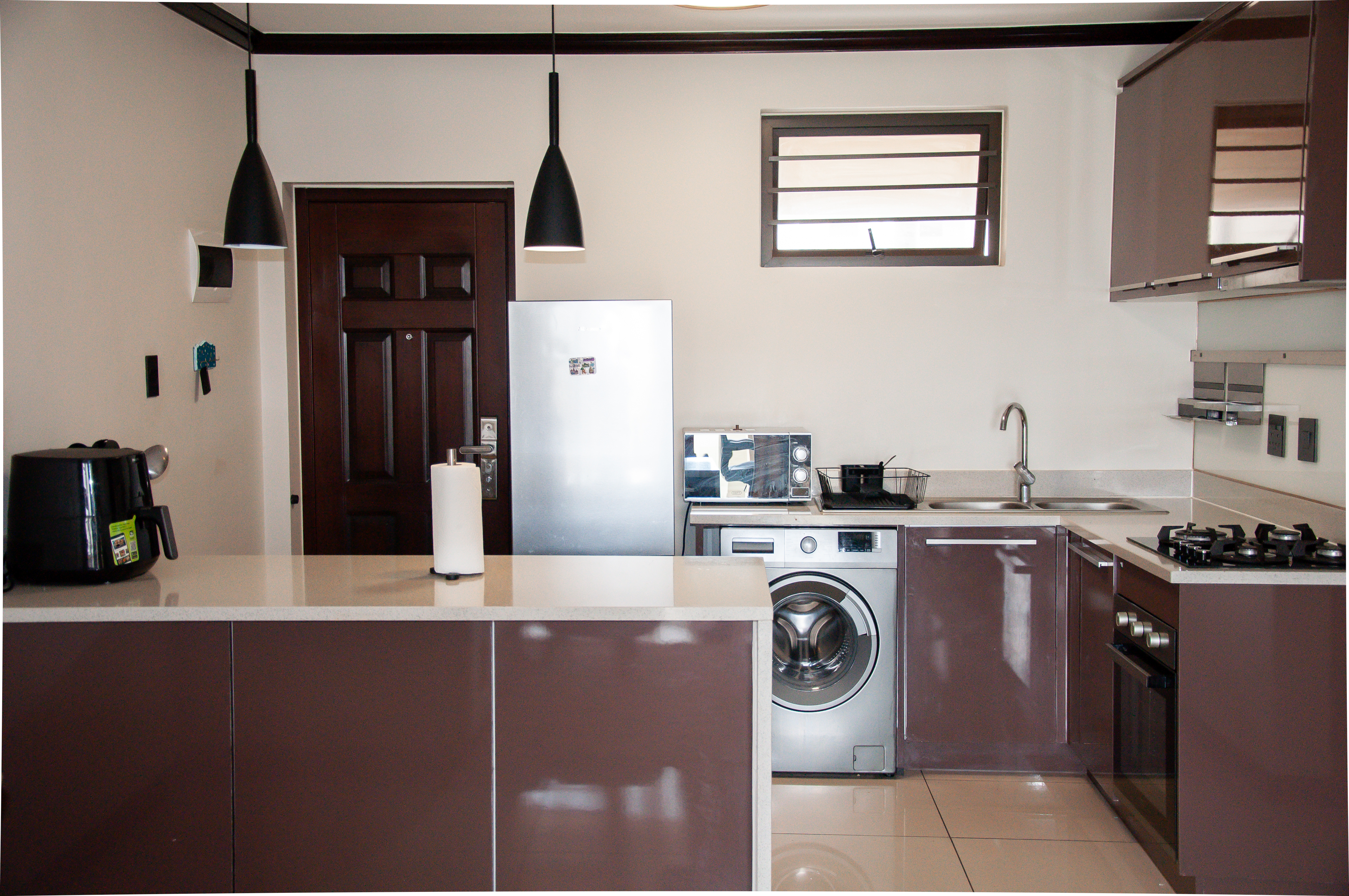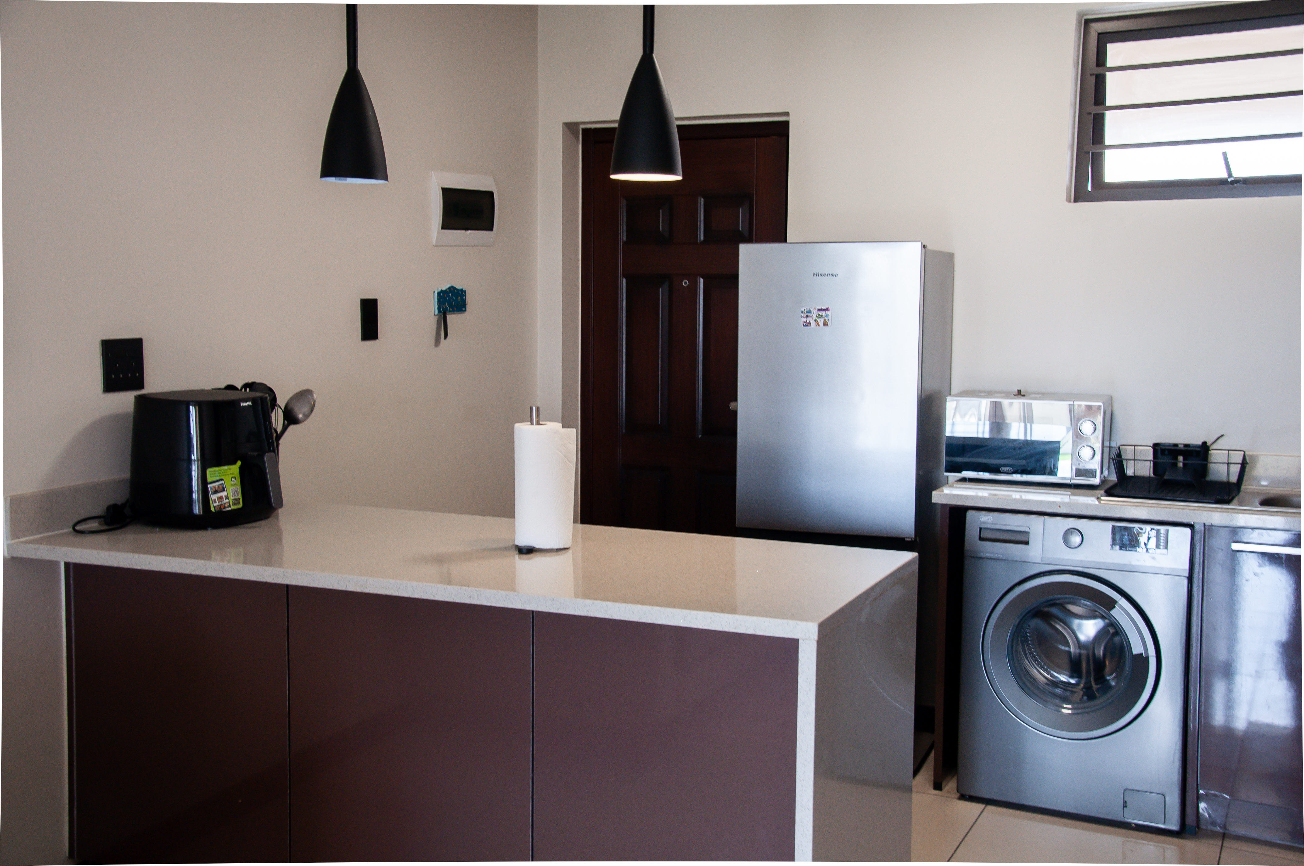 Upon entering, you’re welcomed by a sleek and contemporary kitchen featuring a gas hob—perfect for efficiency and uninterrupted cooking during loadshedding. The light stone countertops and breakfast nook create a stylish yet functional space for preparing and enjoying meals with loved ones.