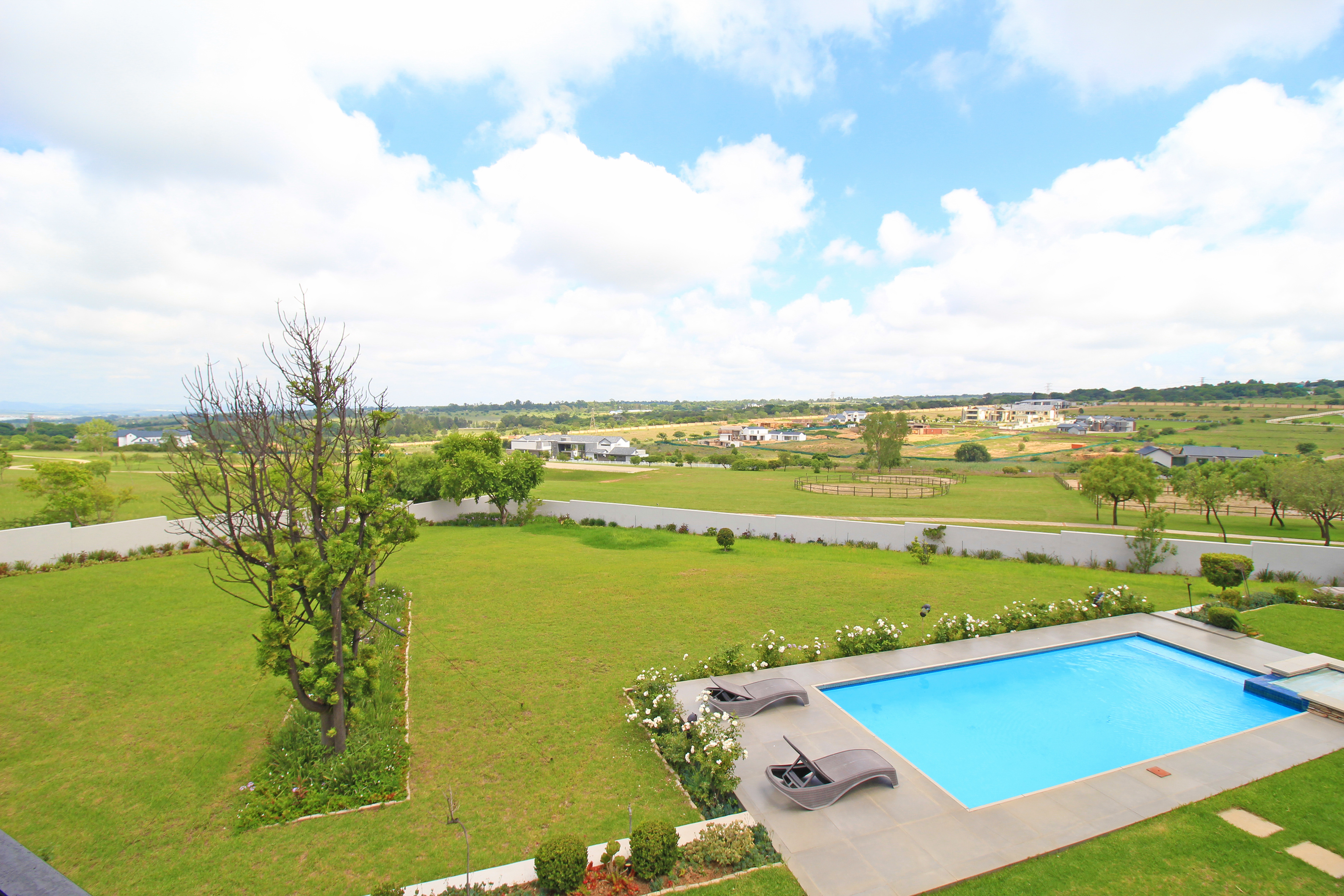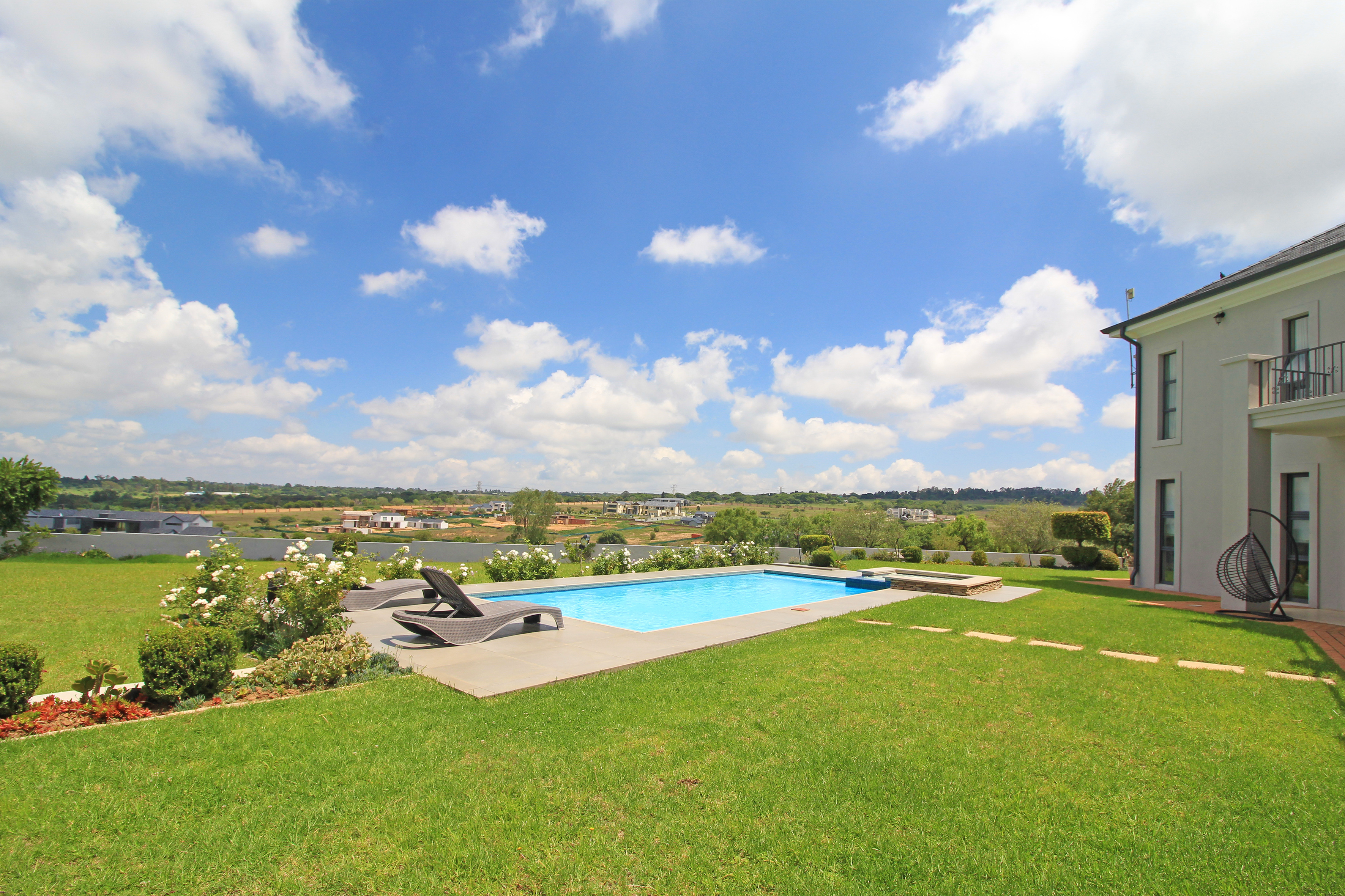 A 5000-square-meter landscaped garden, meticulously designed with lush greenery, winding pathways, and tranquil spaces for relaxation. Sparkling pool, perfect for lazing around on those hot summer days.