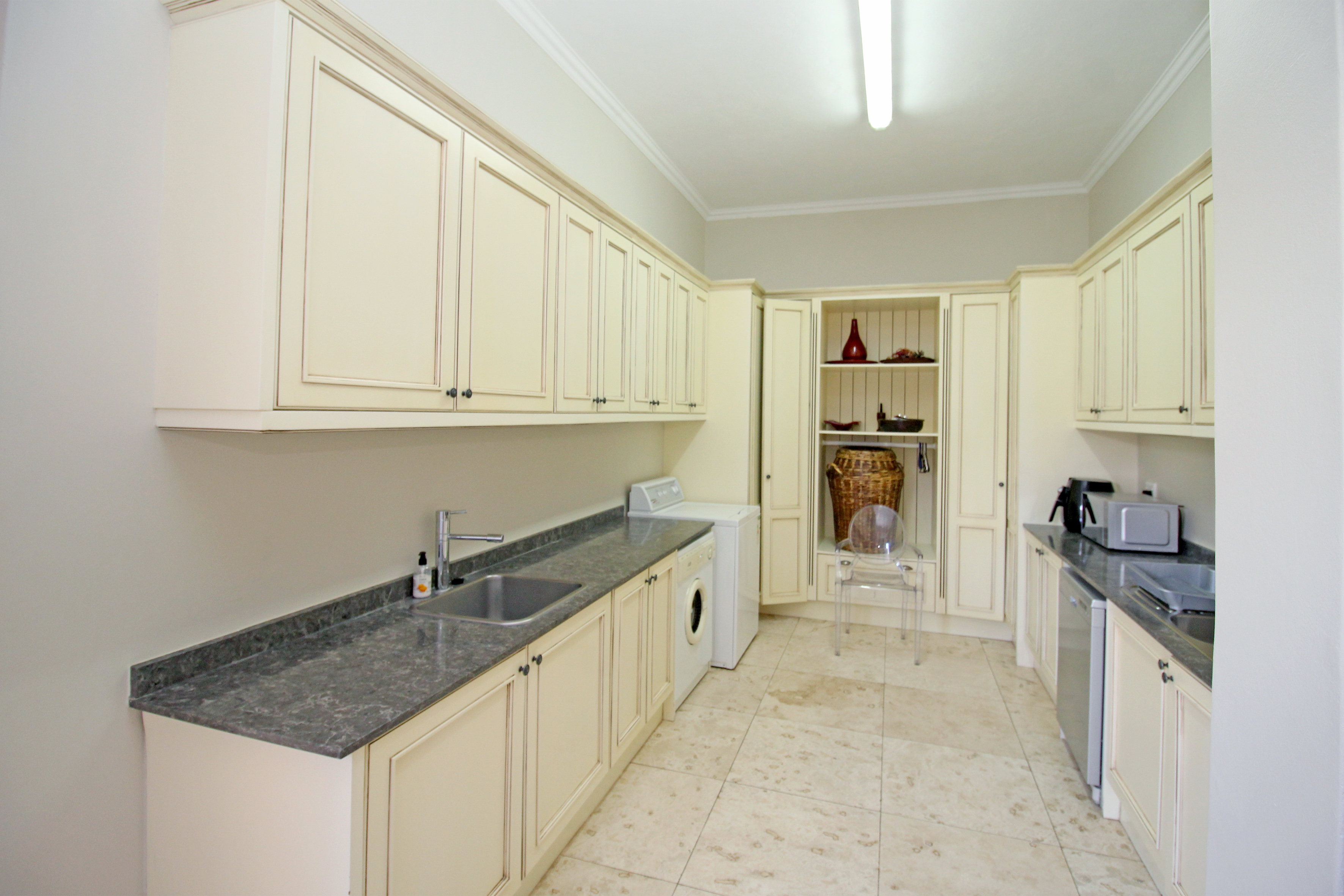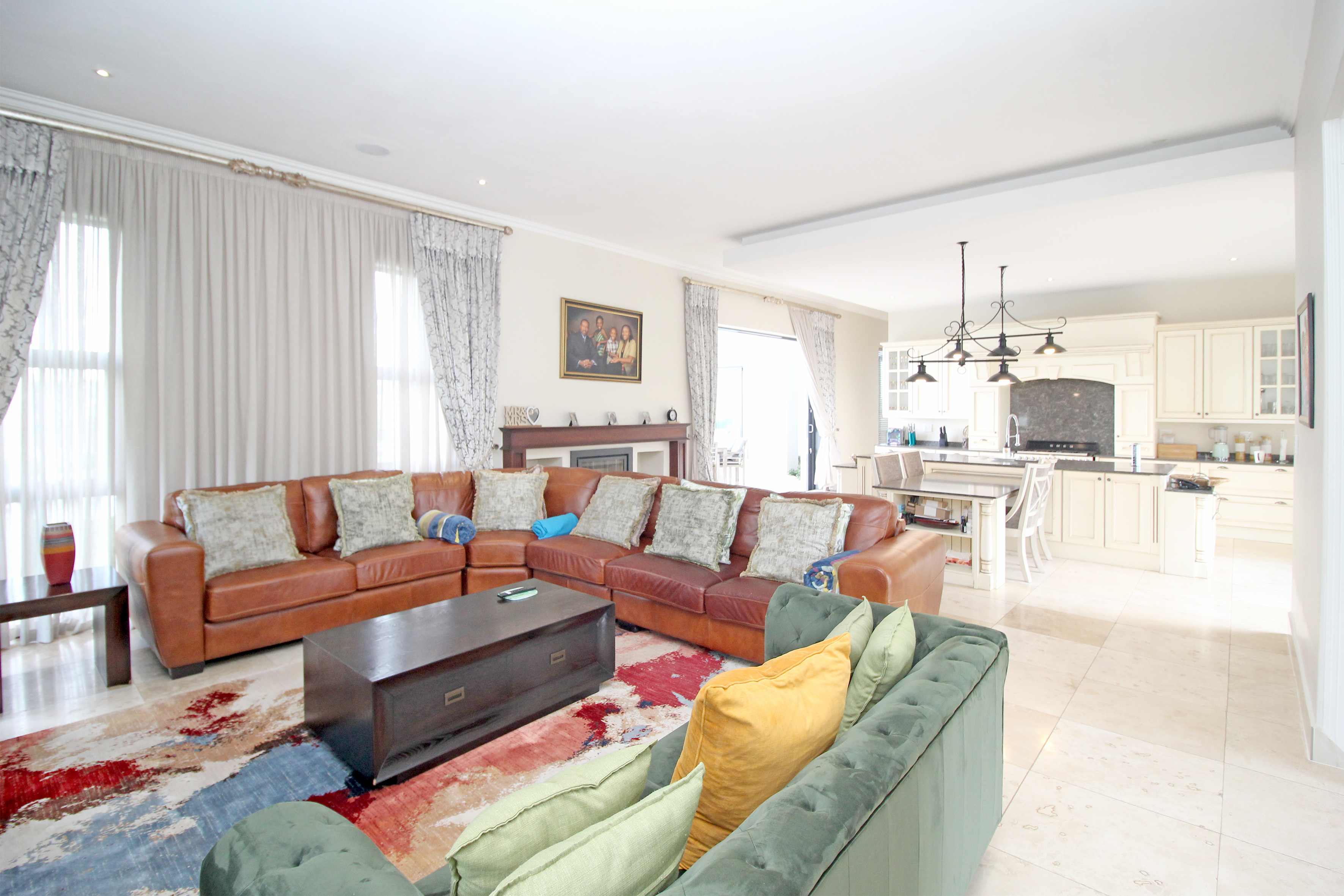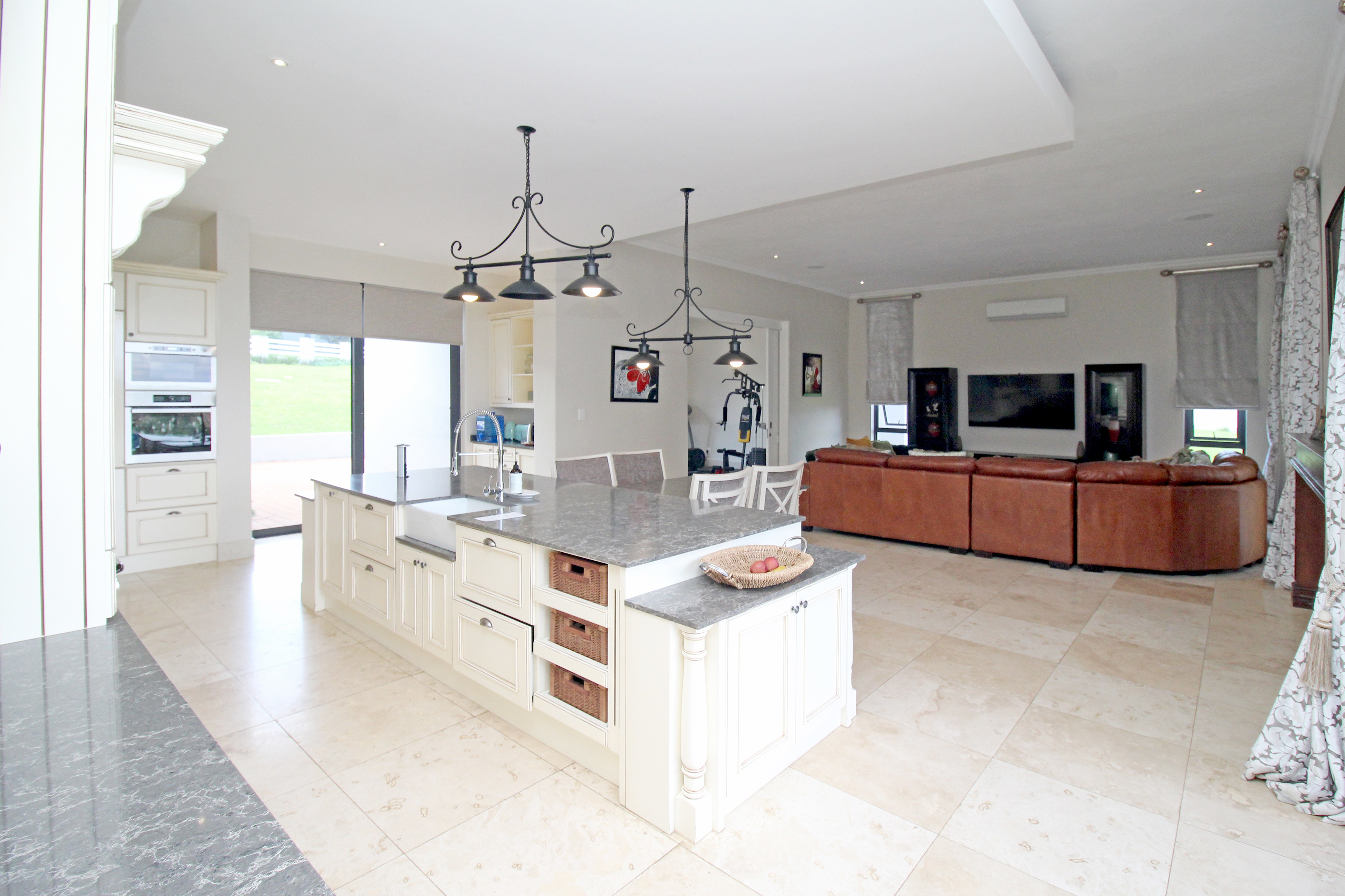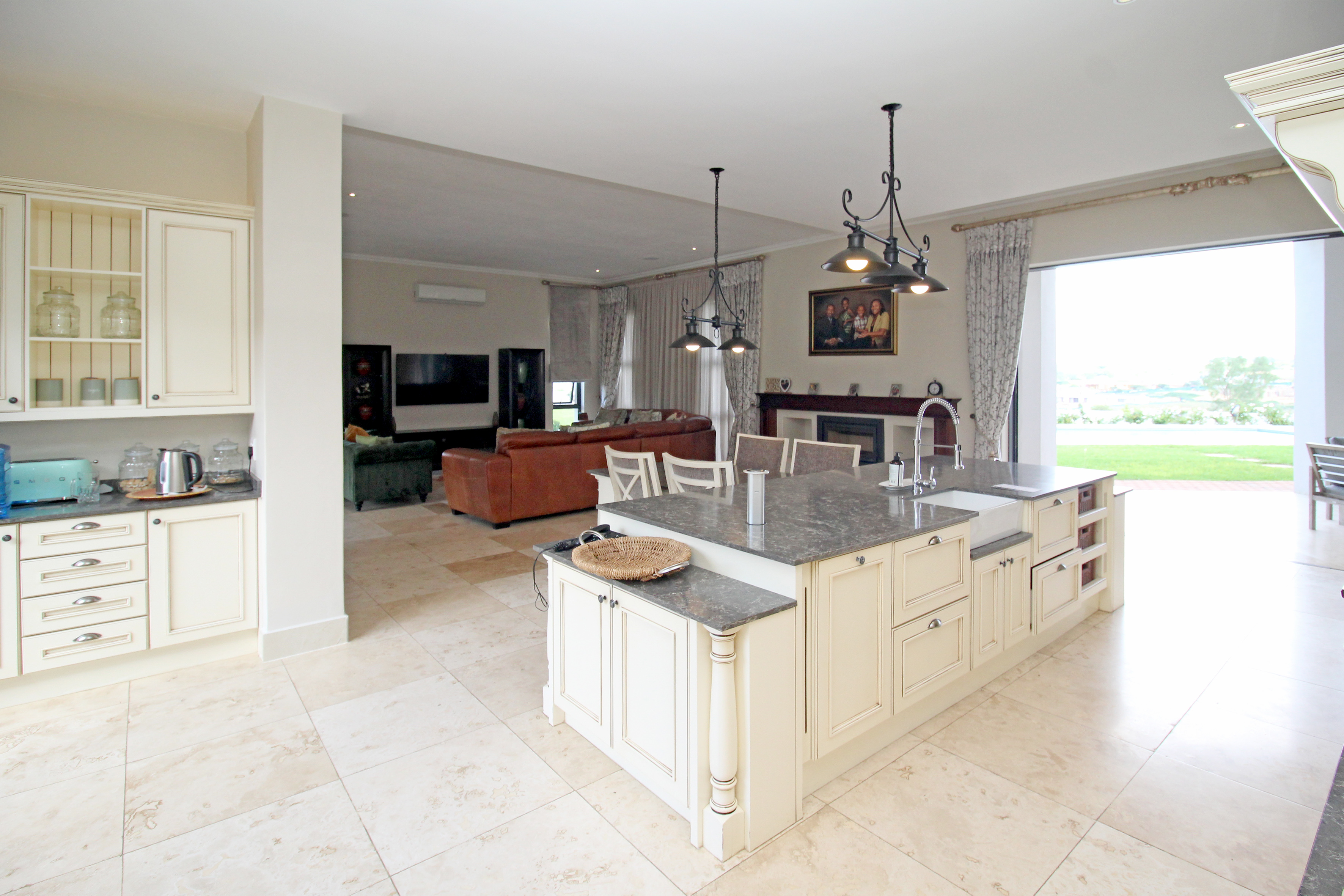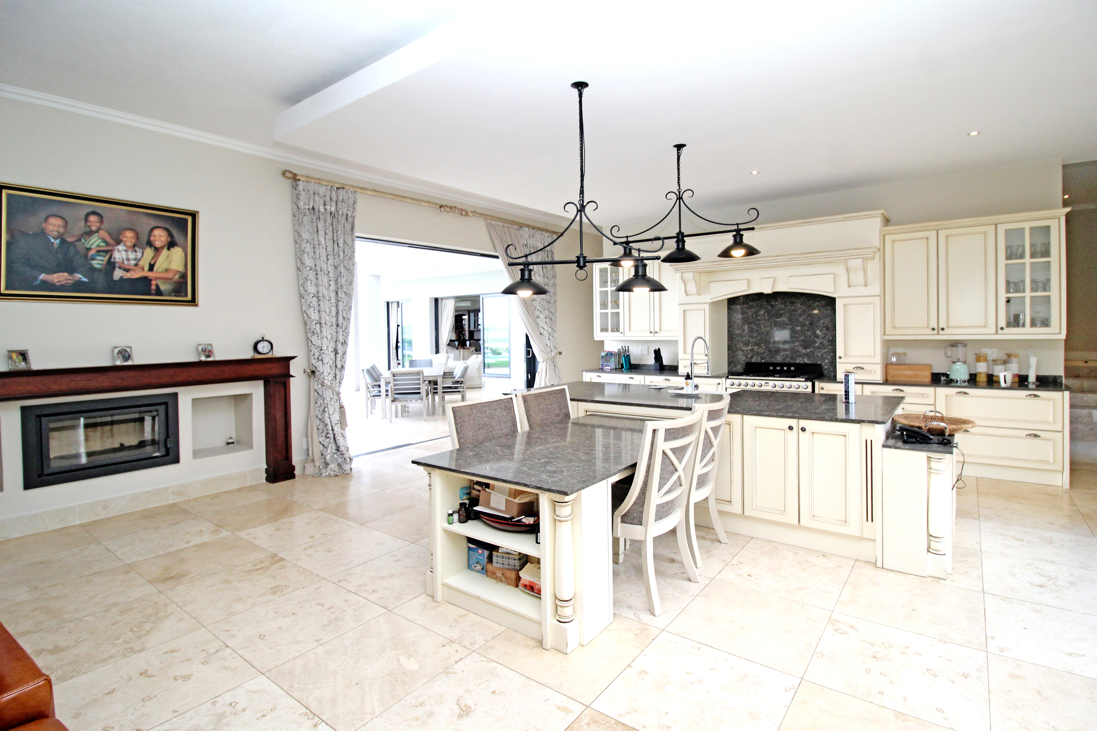 A state-of-the-art gourmet kitchen with top-of-the-line appliances, gas hob, walk in pantry, eat in breakfast nook, a large central island, large separate scullery and laundry space, perfect for both family meals and entertaining. Tv lounge open plan to the kitchen with wood burning fire place and all opening out to the divine patio with built in braai.
