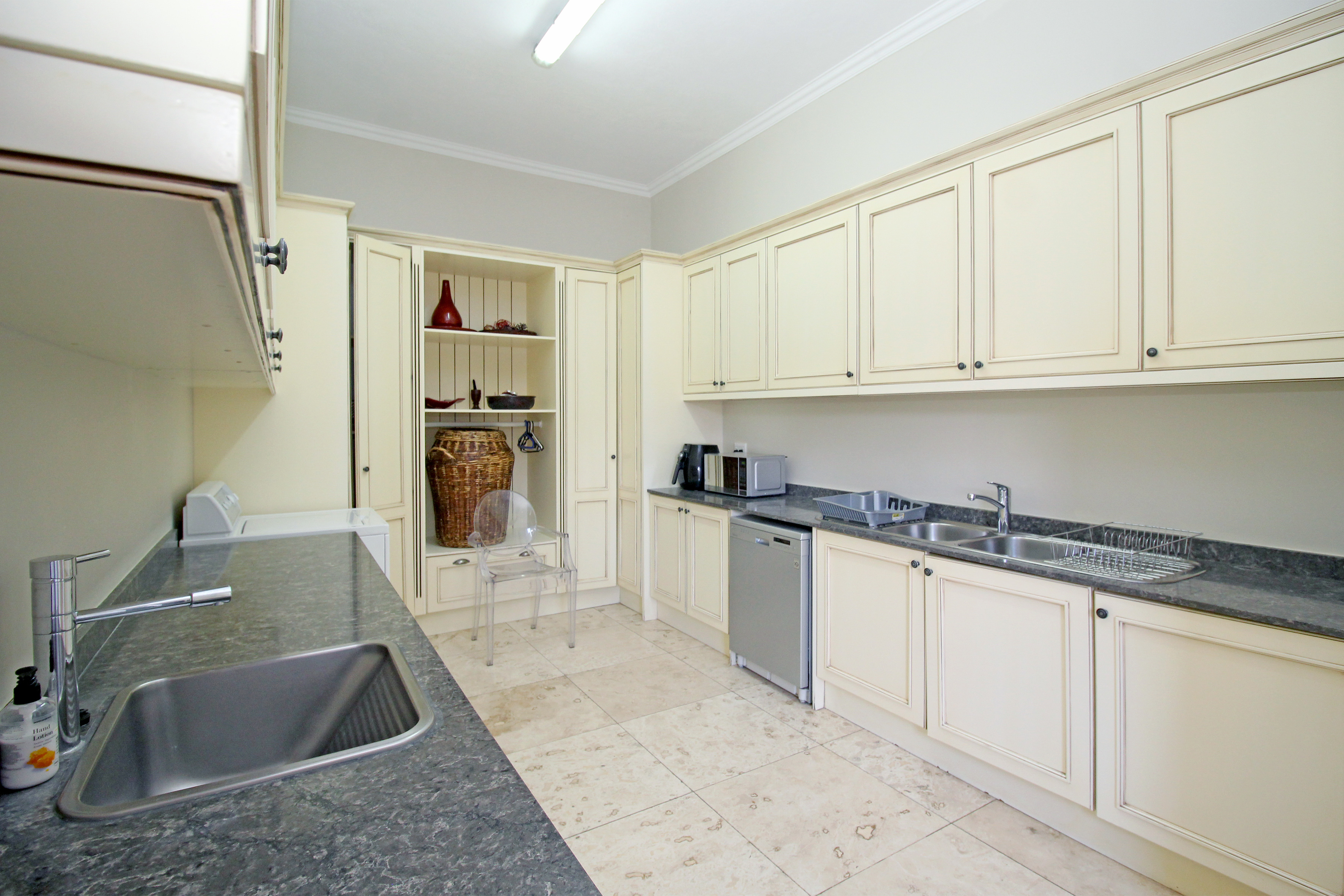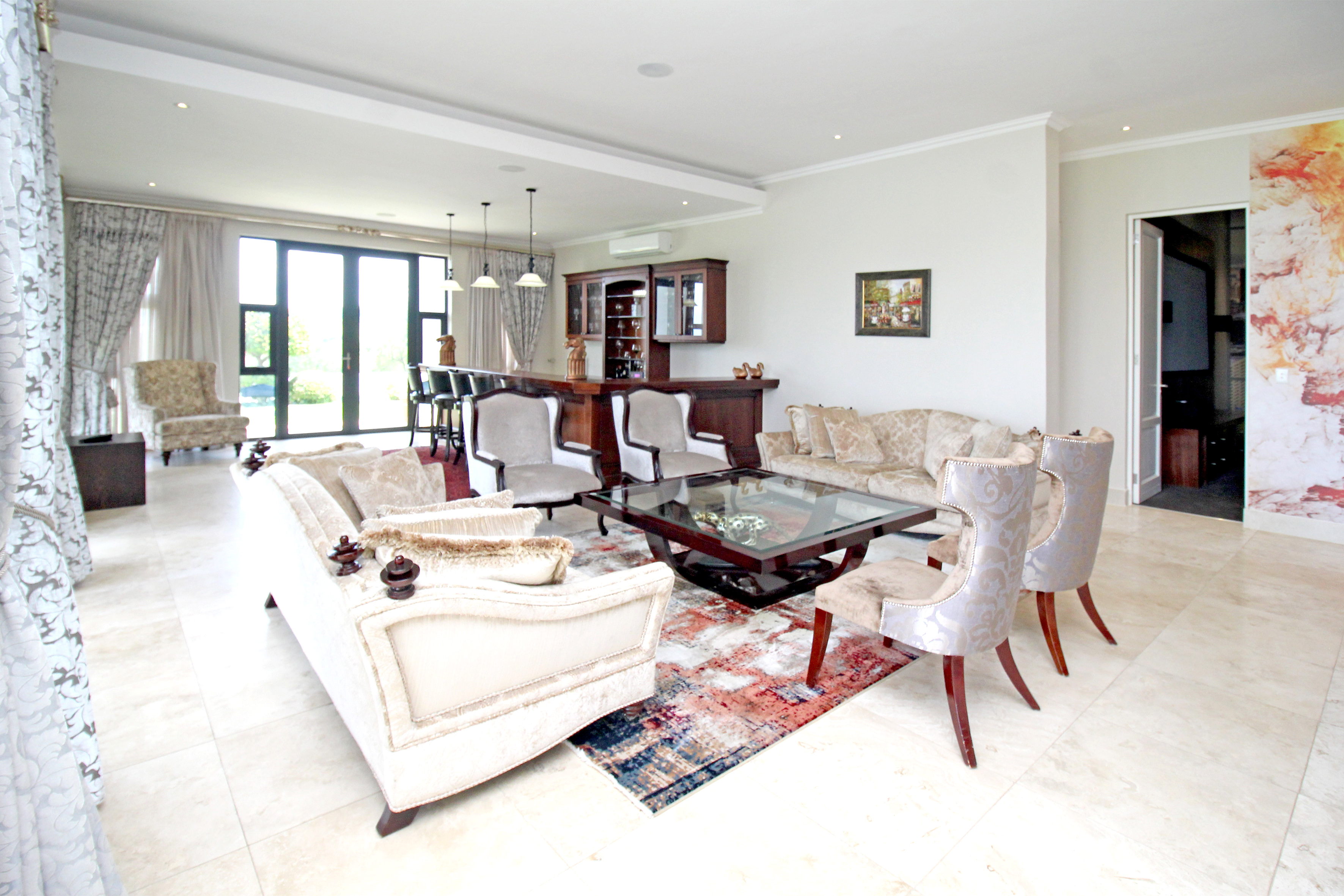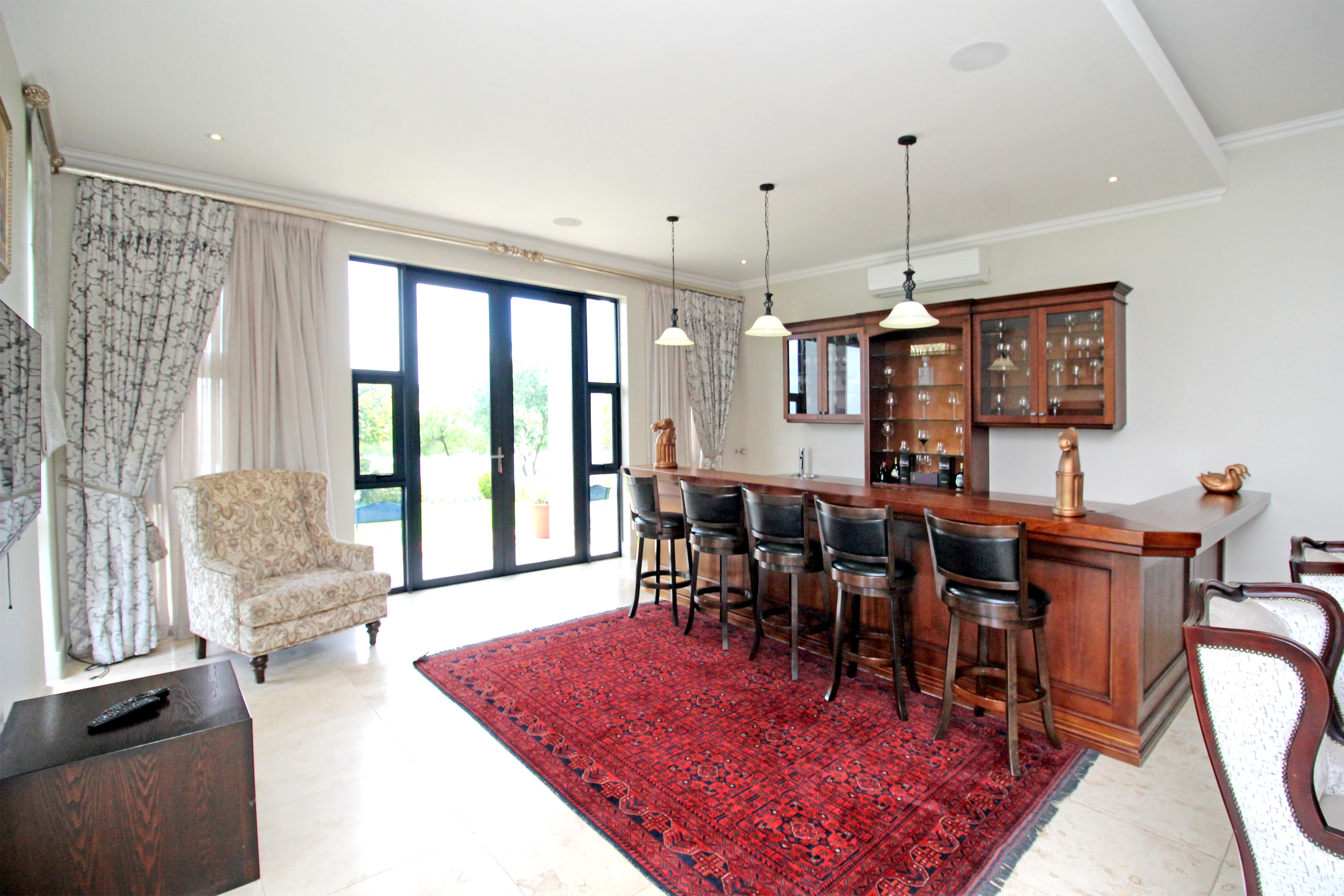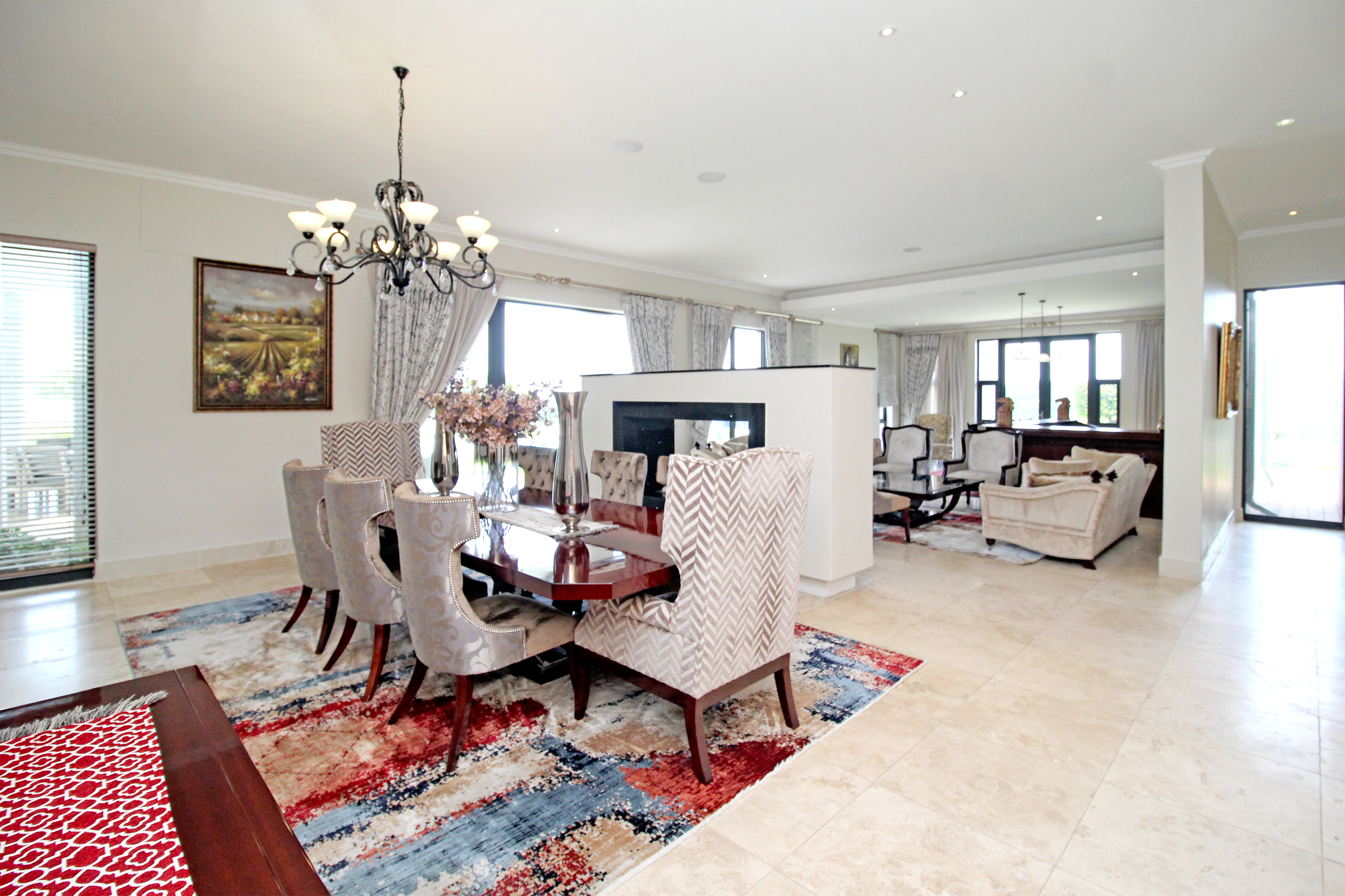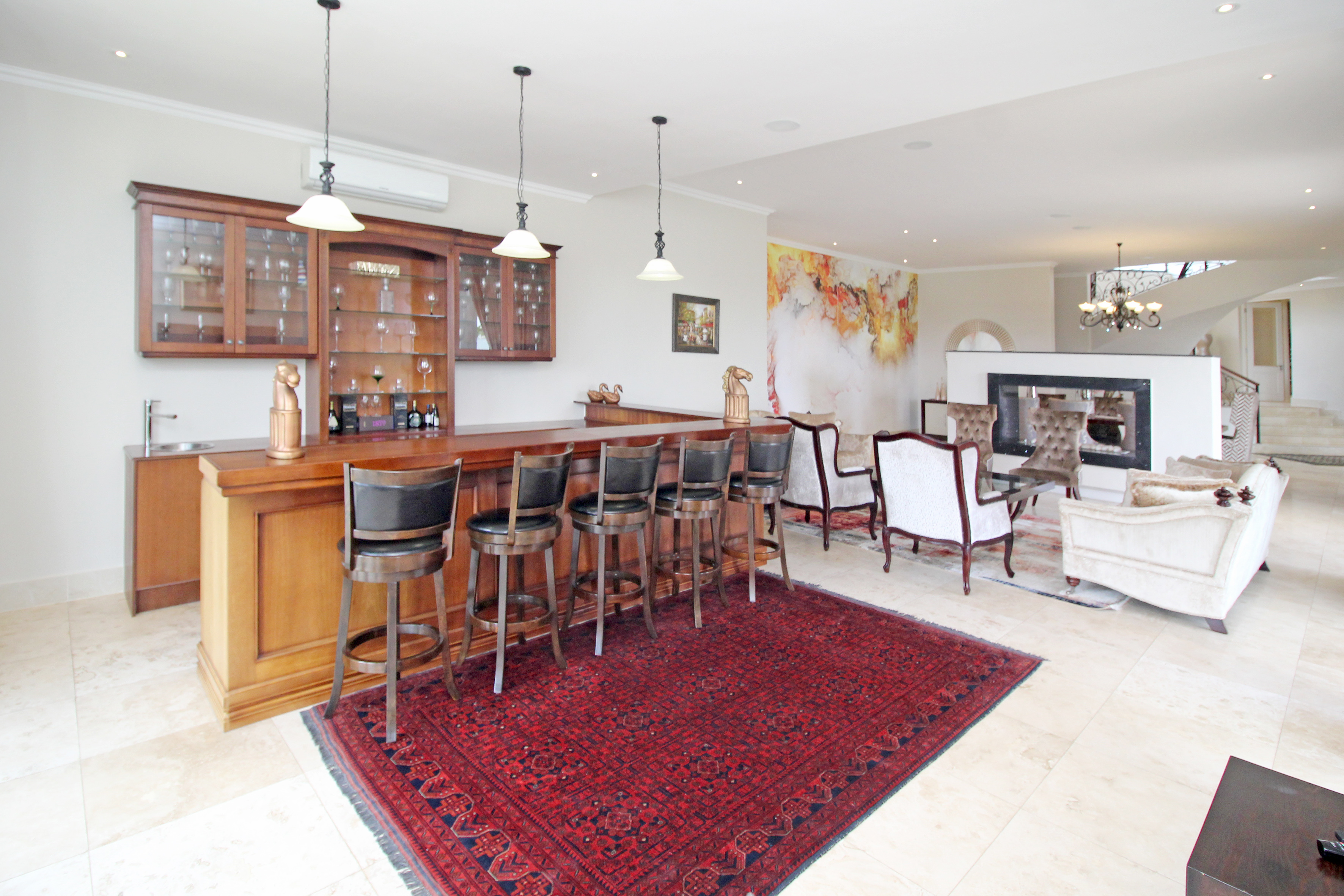 A state-of-the-art gourmet kitchen with top-of-the-line appliances, gas hob, walk in pantry, eat in breakfast nook, a large central island, large separate scullery and laundry space, perfect for both family meals and entertaining. Tv lounge open plan to the kitchen with wood burning fire place and all opening out to the divine patio with built in braai.