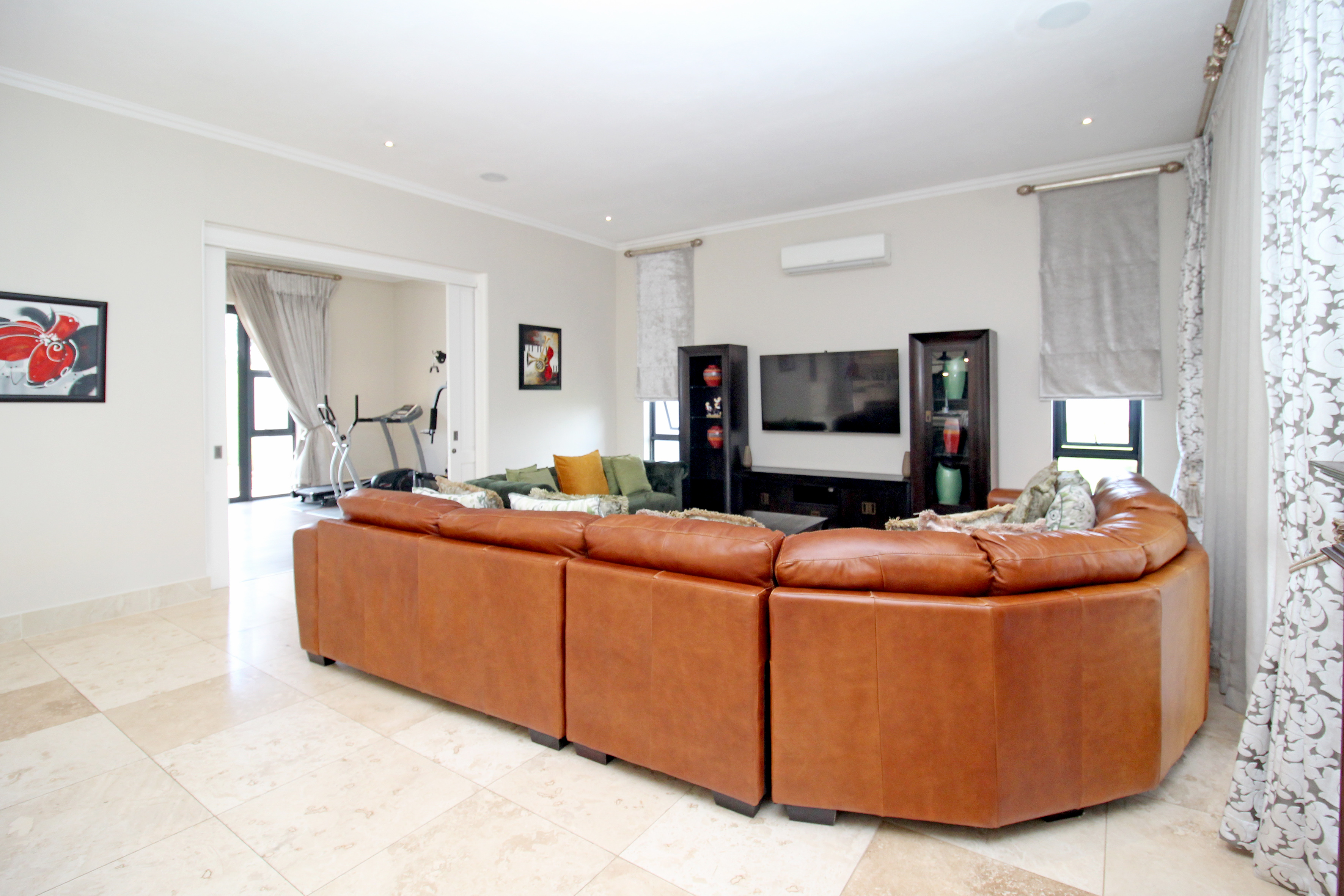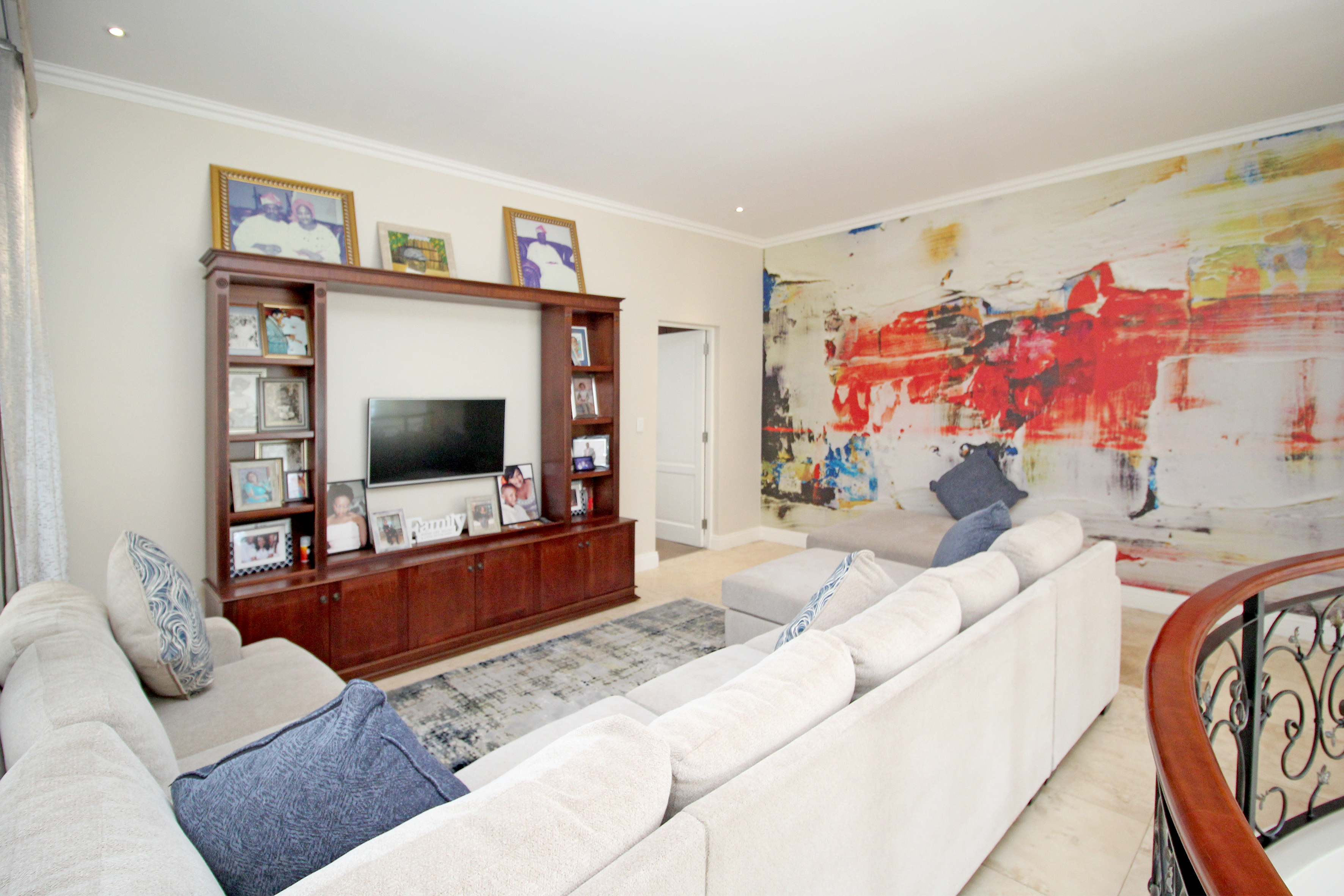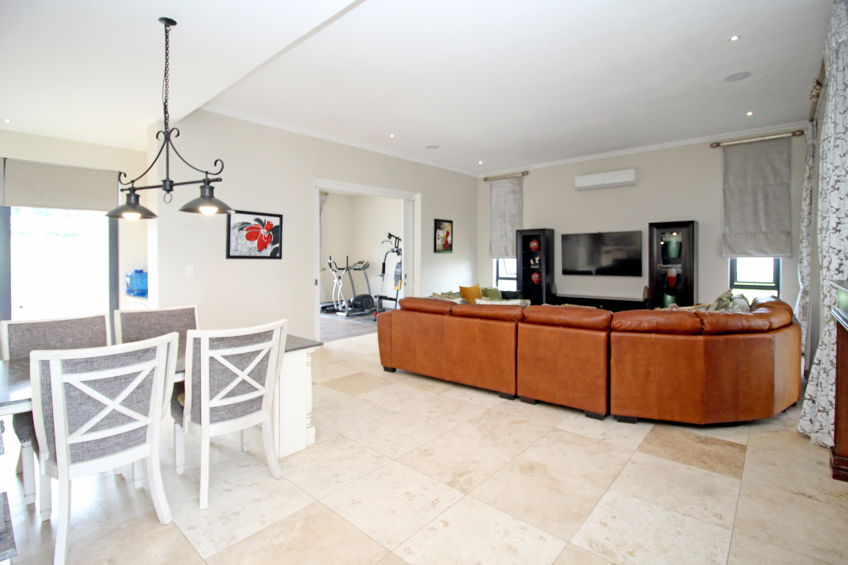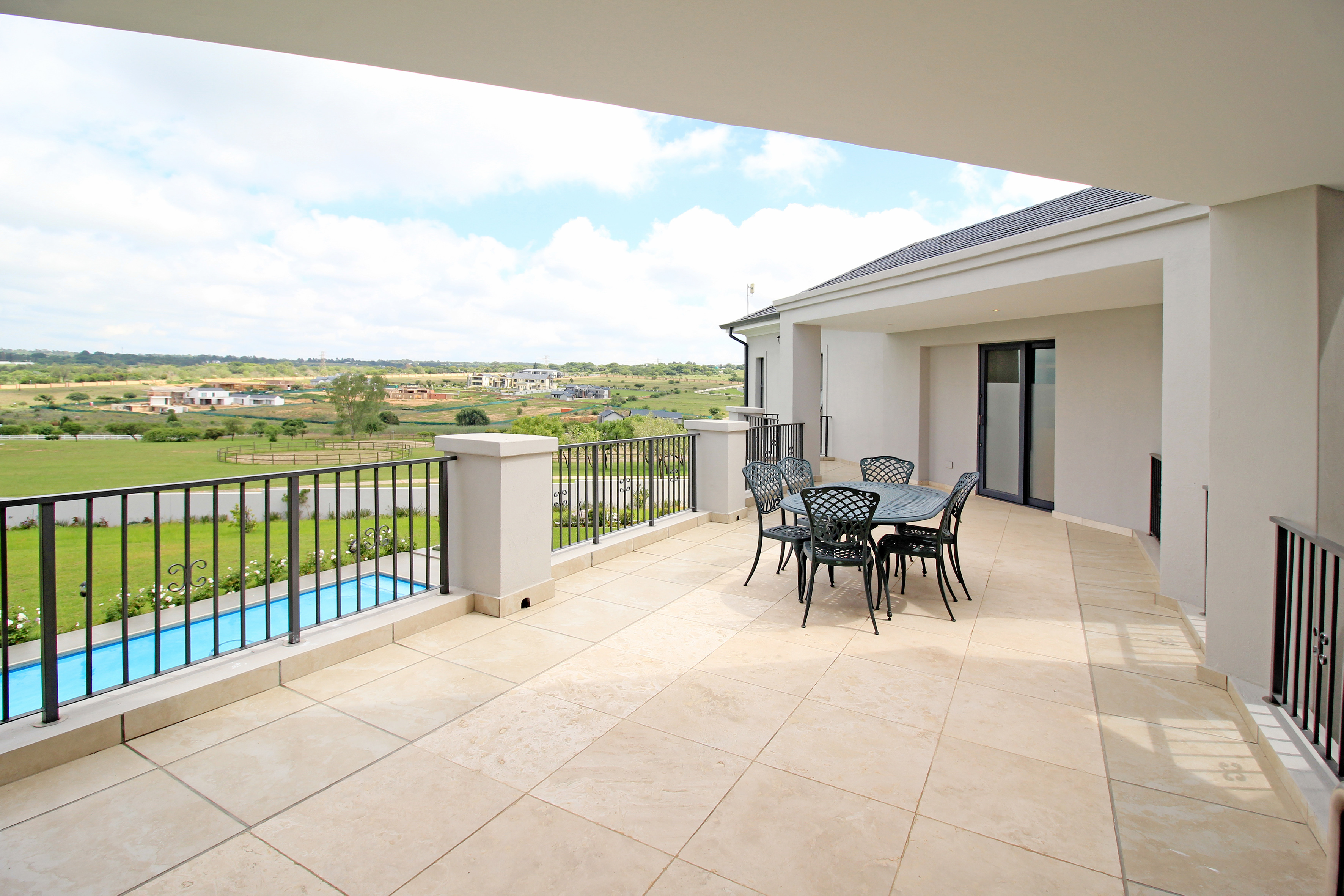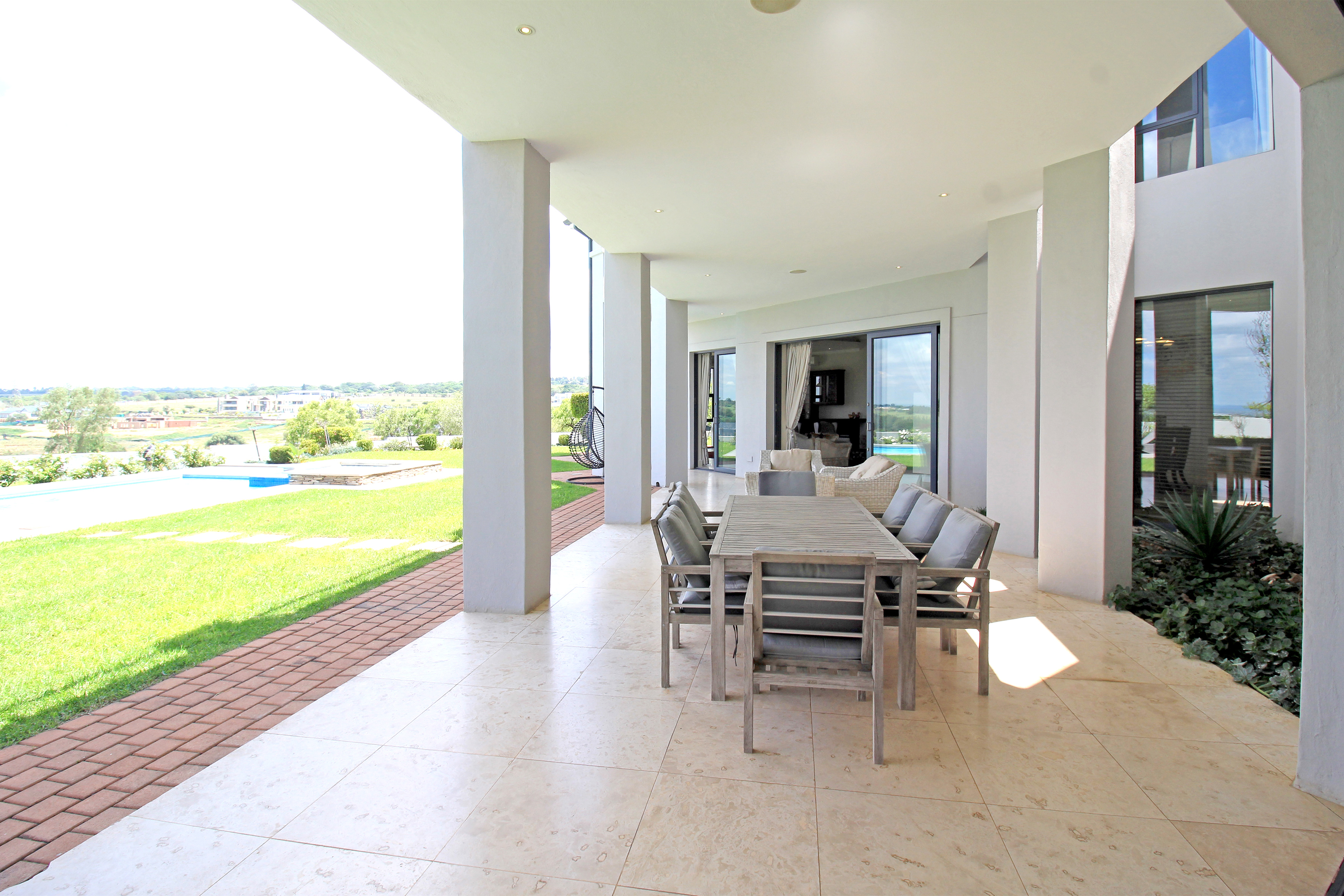 A state-of-the-art gourmet kitchen with top-of-the-line appliances, gas hob, walk in pantry, eat in breakfast nook, a large central island, large separate scullery and laundry space, perfect for both family meals and entertaining. Tv lounge open plan to the kitchen with wood burning fire place and all opening out to the divine patio with built in braai.