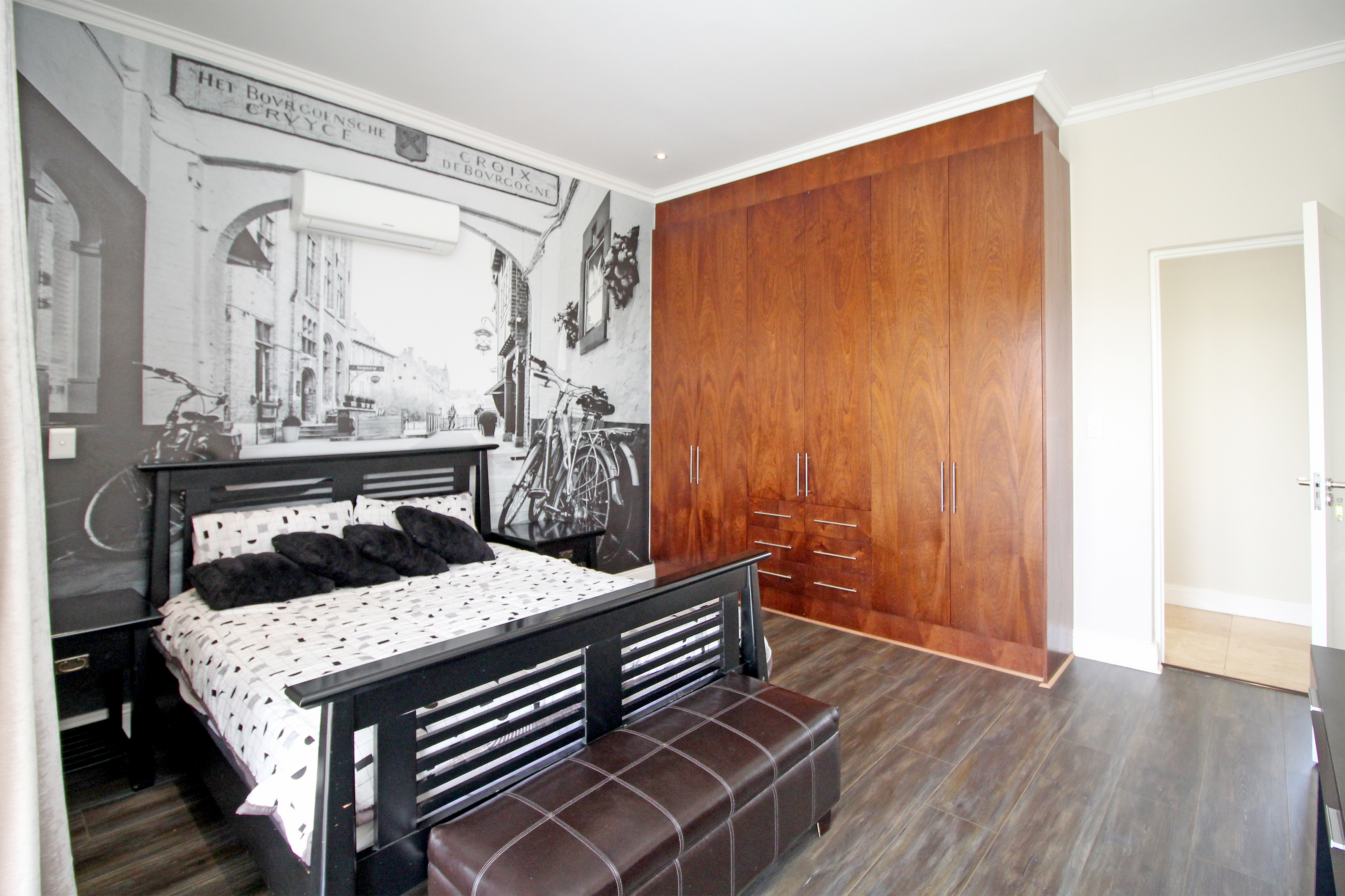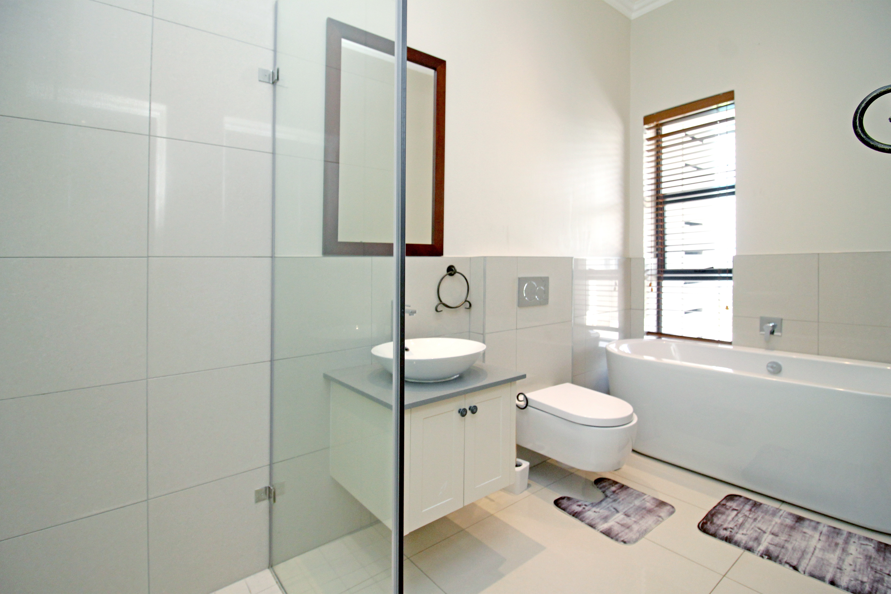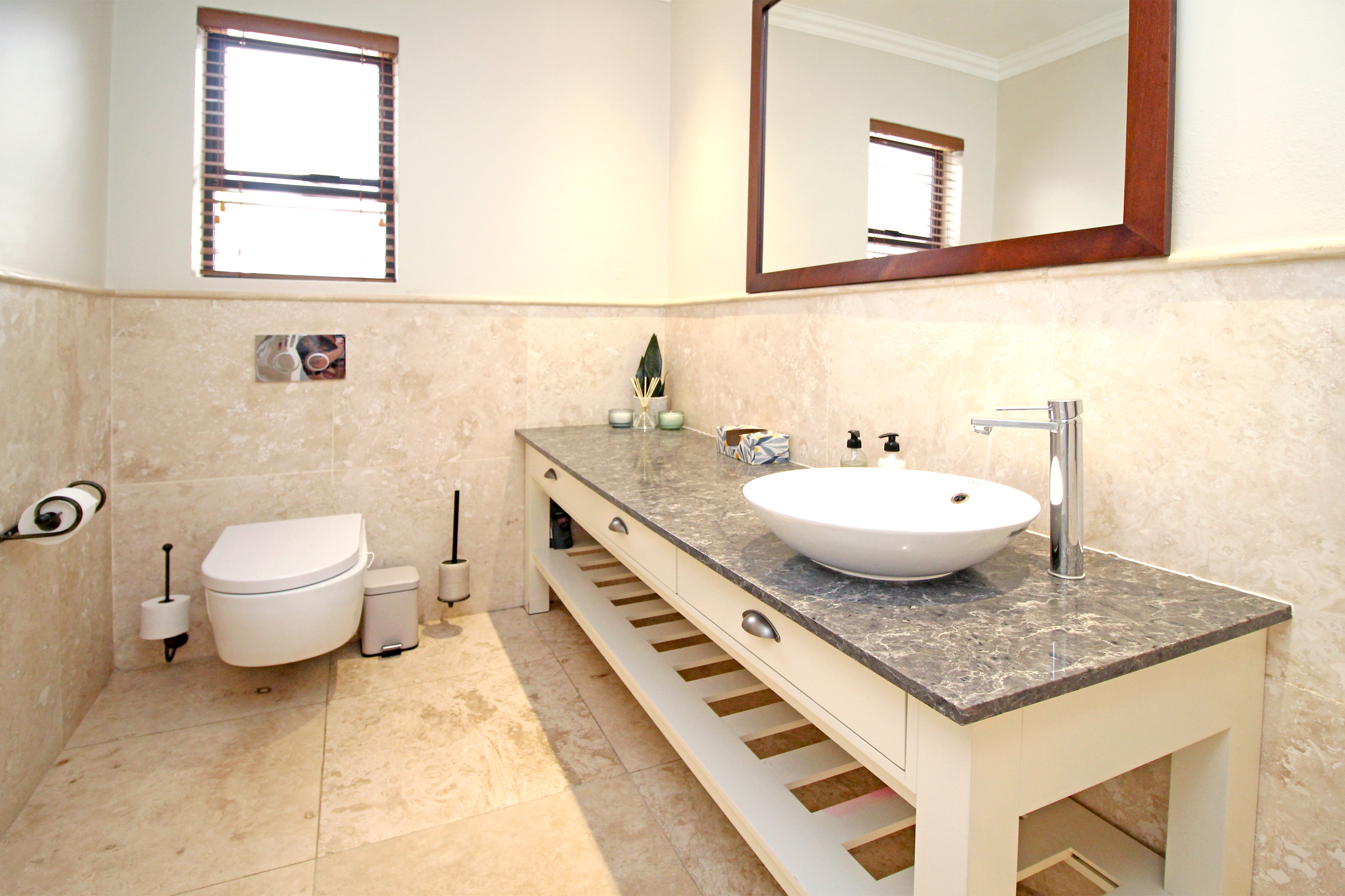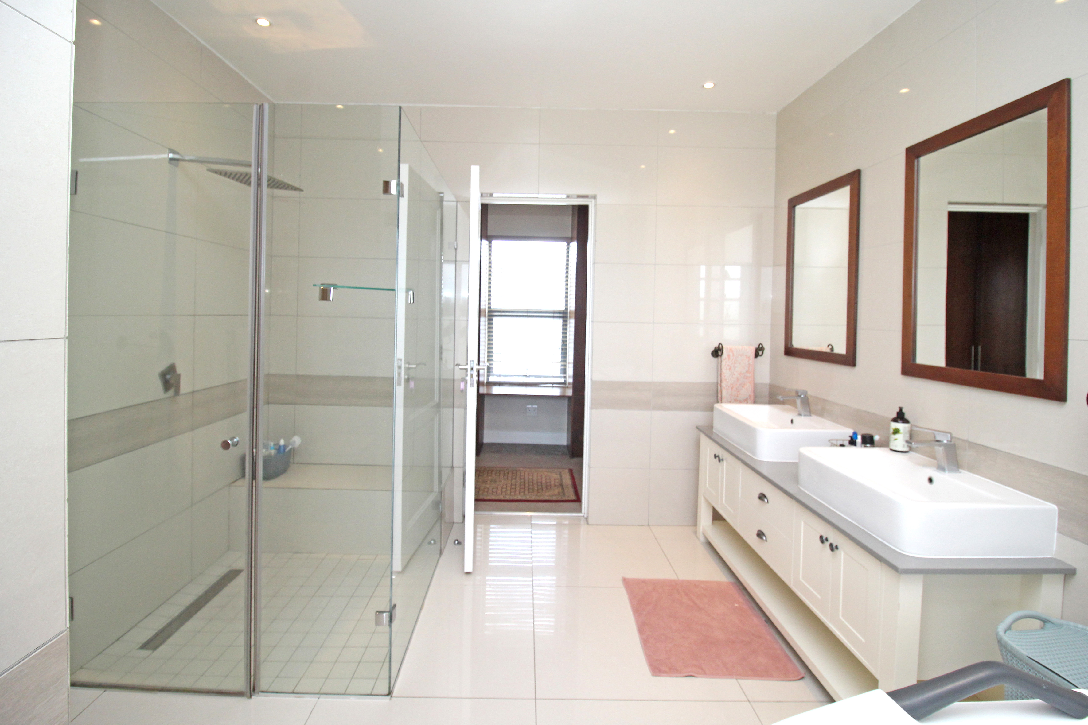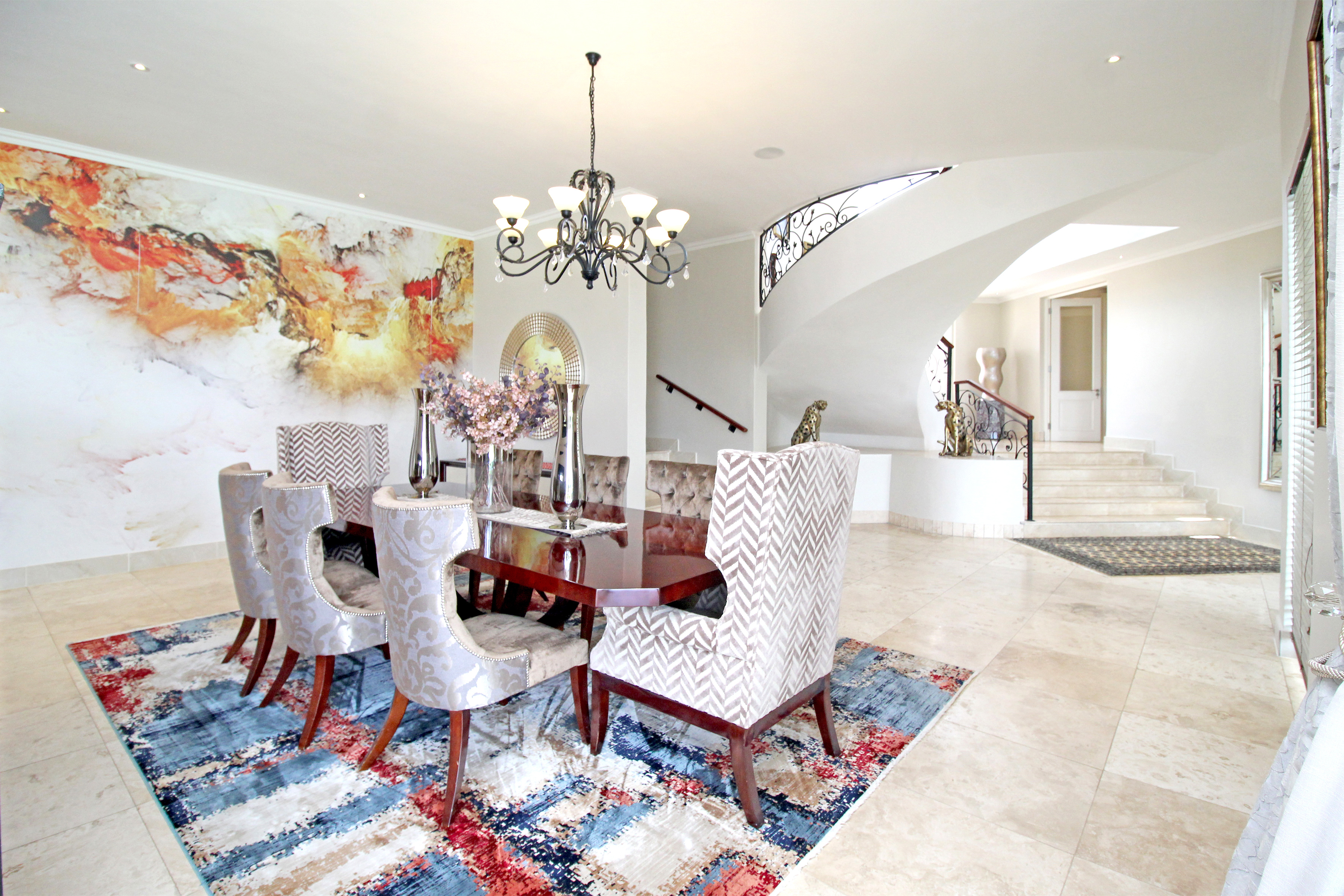 A state-of-the-art gourmet kitchen with top-of-the-line appliances, gas hob, walk in pantry, eat in breakfast nook, a large central island, large separate scullery and laundry space, perfect for both family meals and entertaining. Tv lounge open plan to the kitchen with wood burning fire place and all opening out to the divine patio with built in braai.