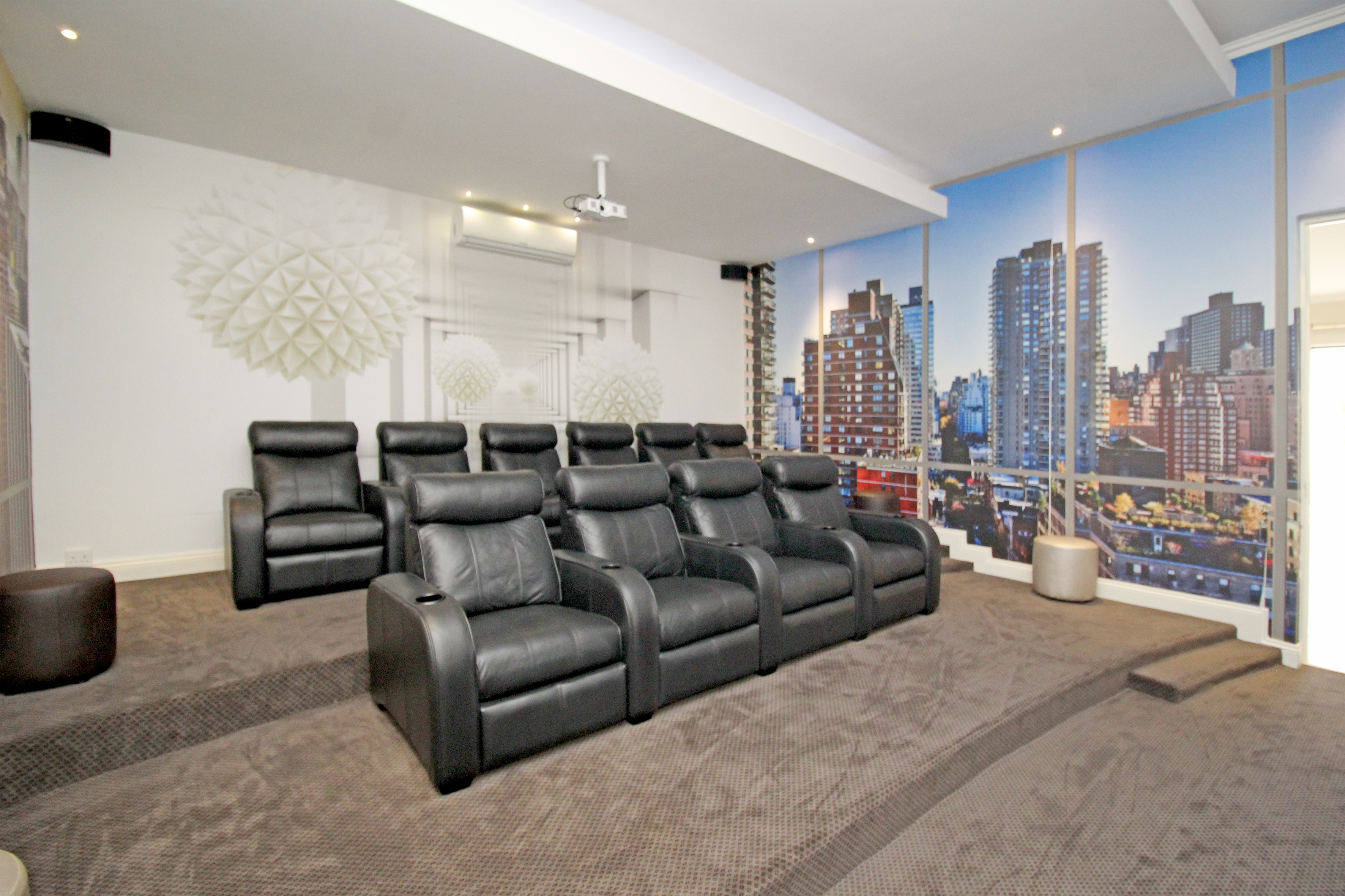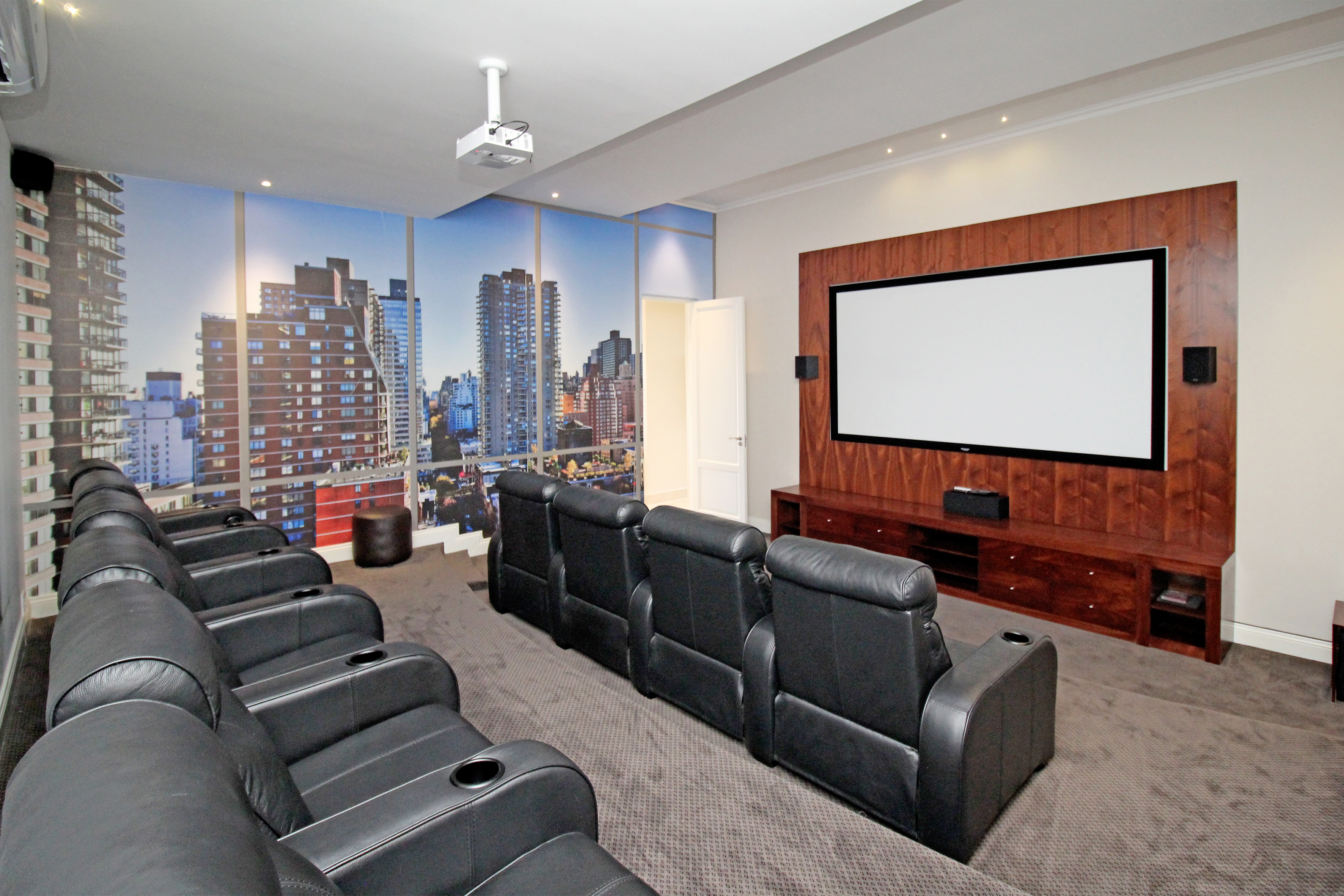 A private home cinema with plush seating and cutting-edge audiovisual technology for the ultimate movie nights.