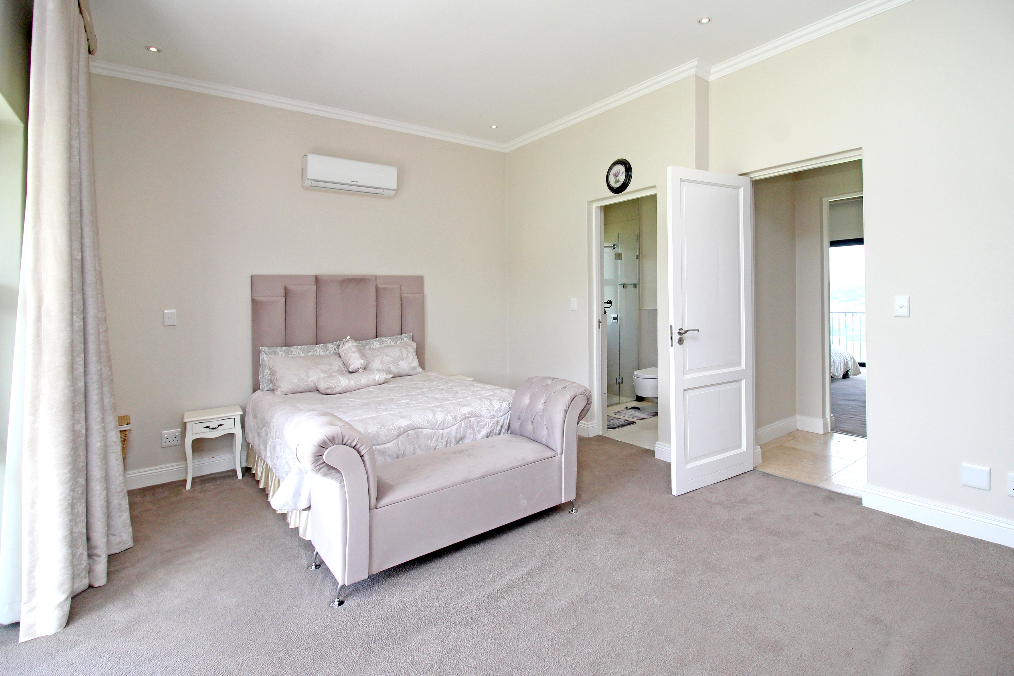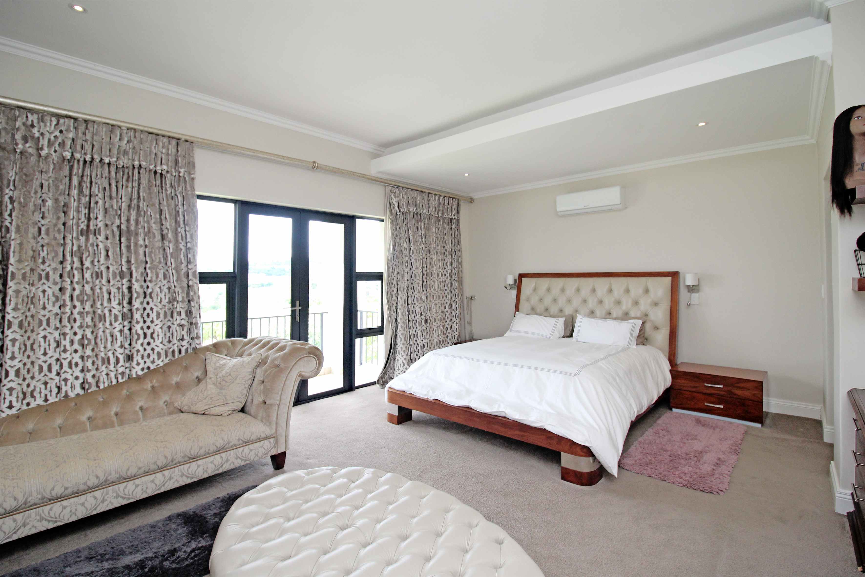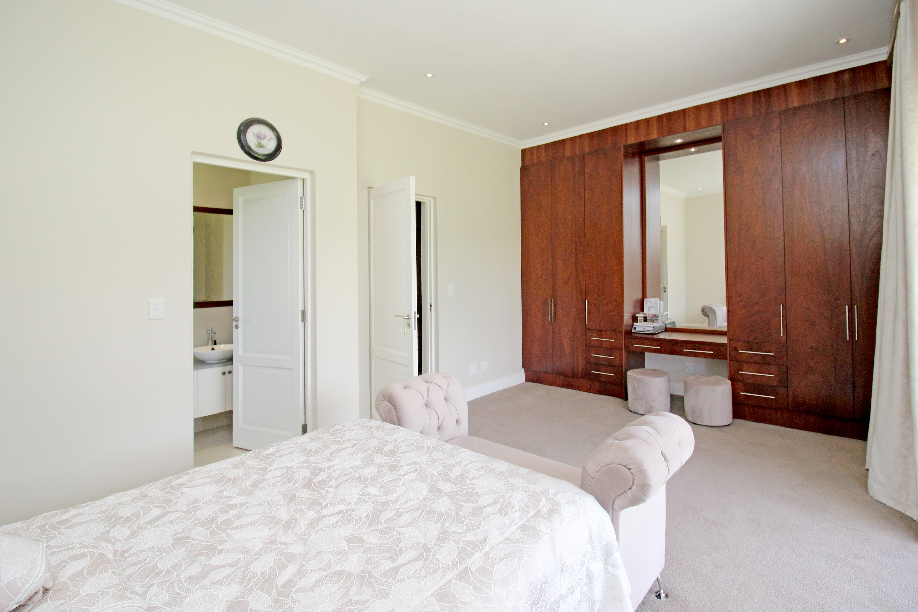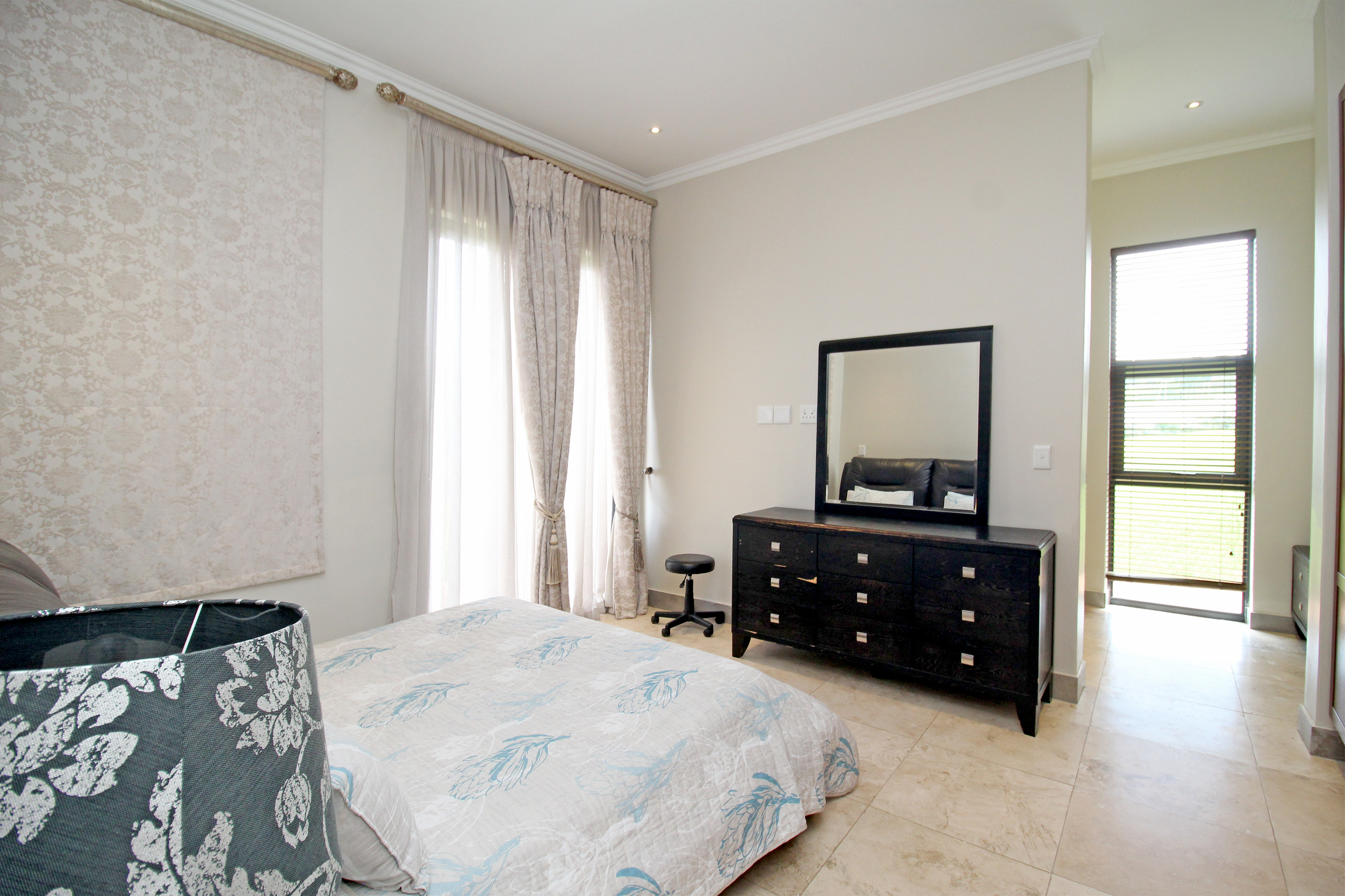 Five spacious, sunlit and air conditioned bedrooms, each thoughtfully designed with en-suite bathrooms and built in wardrobes wardrobes. The master suite features a his and hers cupboard with ample space, a fitted dresser, a spa-inspired bathroom with a double seater jacuzzi bath, and a balcony overlooking the lush gardens.