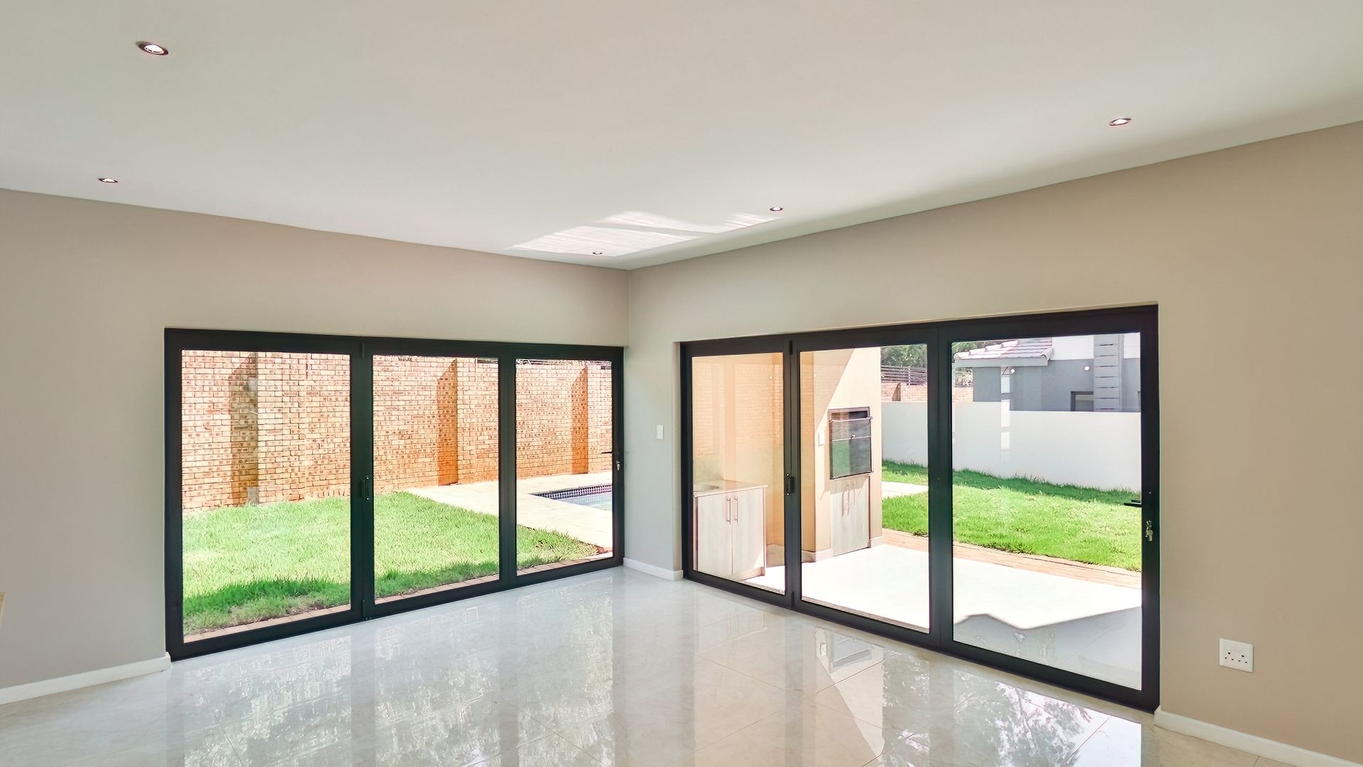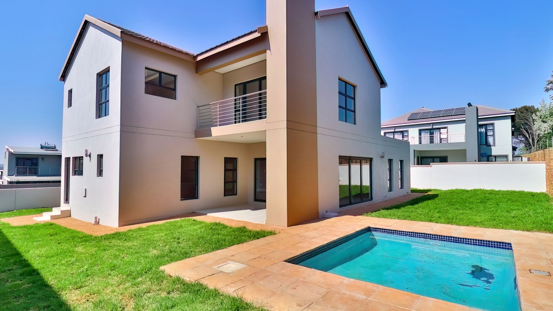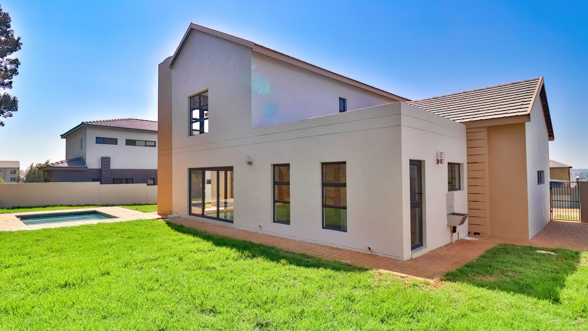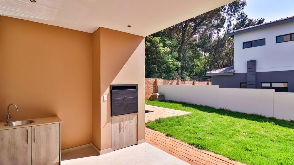 The home extends seamlessly into the outdoors, where the covered patio, complete with a built-in braai, opens up to a pristine garden and sparkling swimming pool. This outdoor oasis offers the perfect backdrop for al fresco dining and relaxation. The generously sized yard is equipped with an automated irrigation system, ensuring that the landscape remains lush and vibrant with minimal effort.