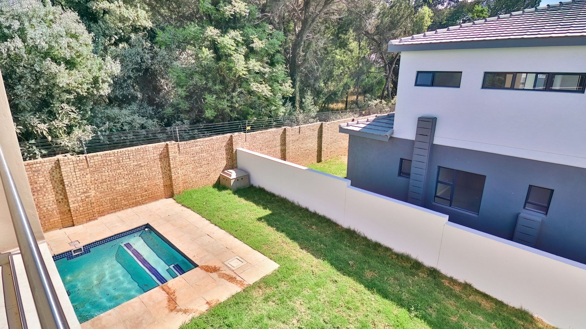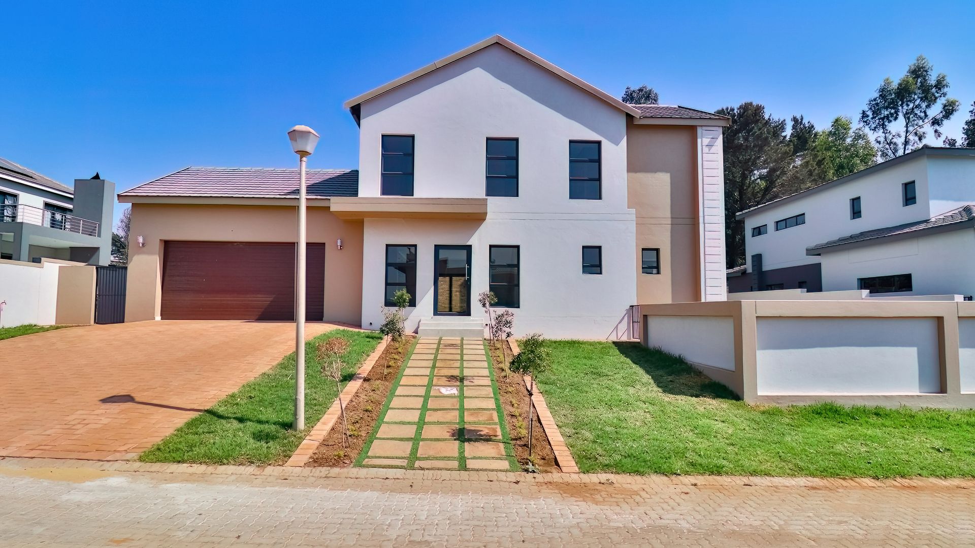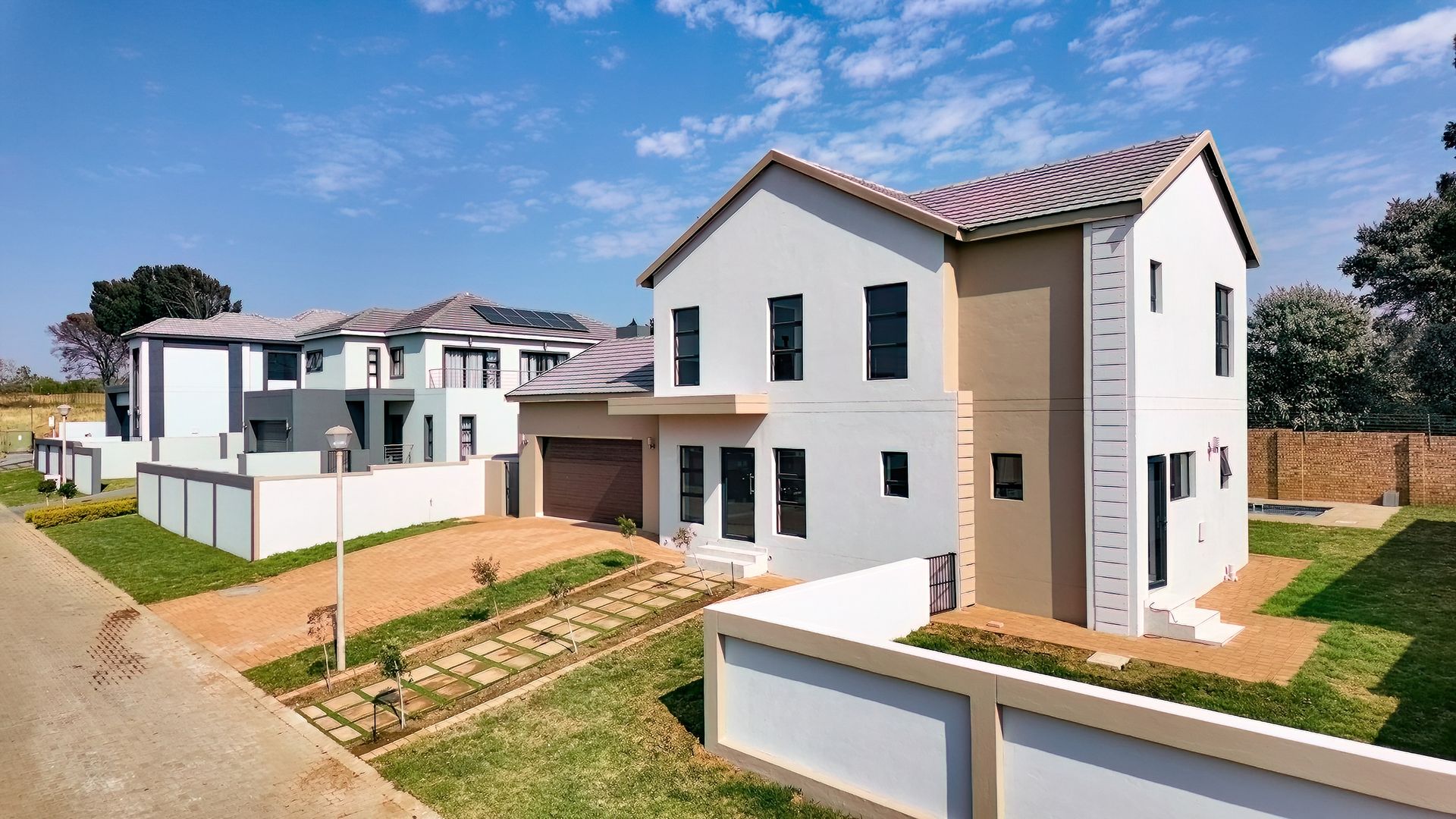 The home extends seamlessly into the outdoors, where the covered patio, complete with a built-in braai, opens up to a pristine garden and sparkling swimming pool. This outdoor oasis offers the perfect backdrop for al fresco dining and relaxation. The generously sized yard is equipped with an automated irrigation system, ensuring that the landscape remains lush and vibrant with minimal effort.