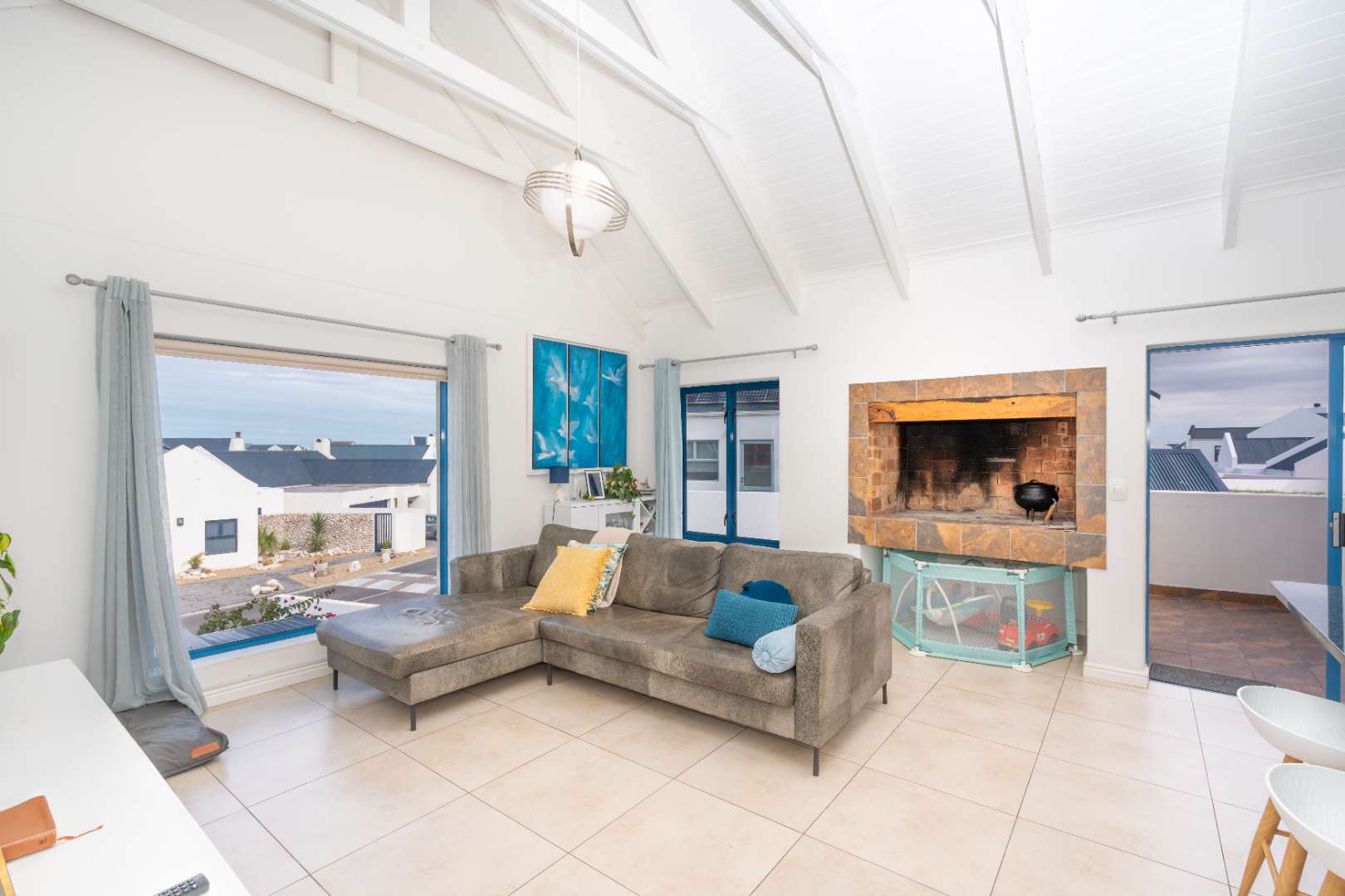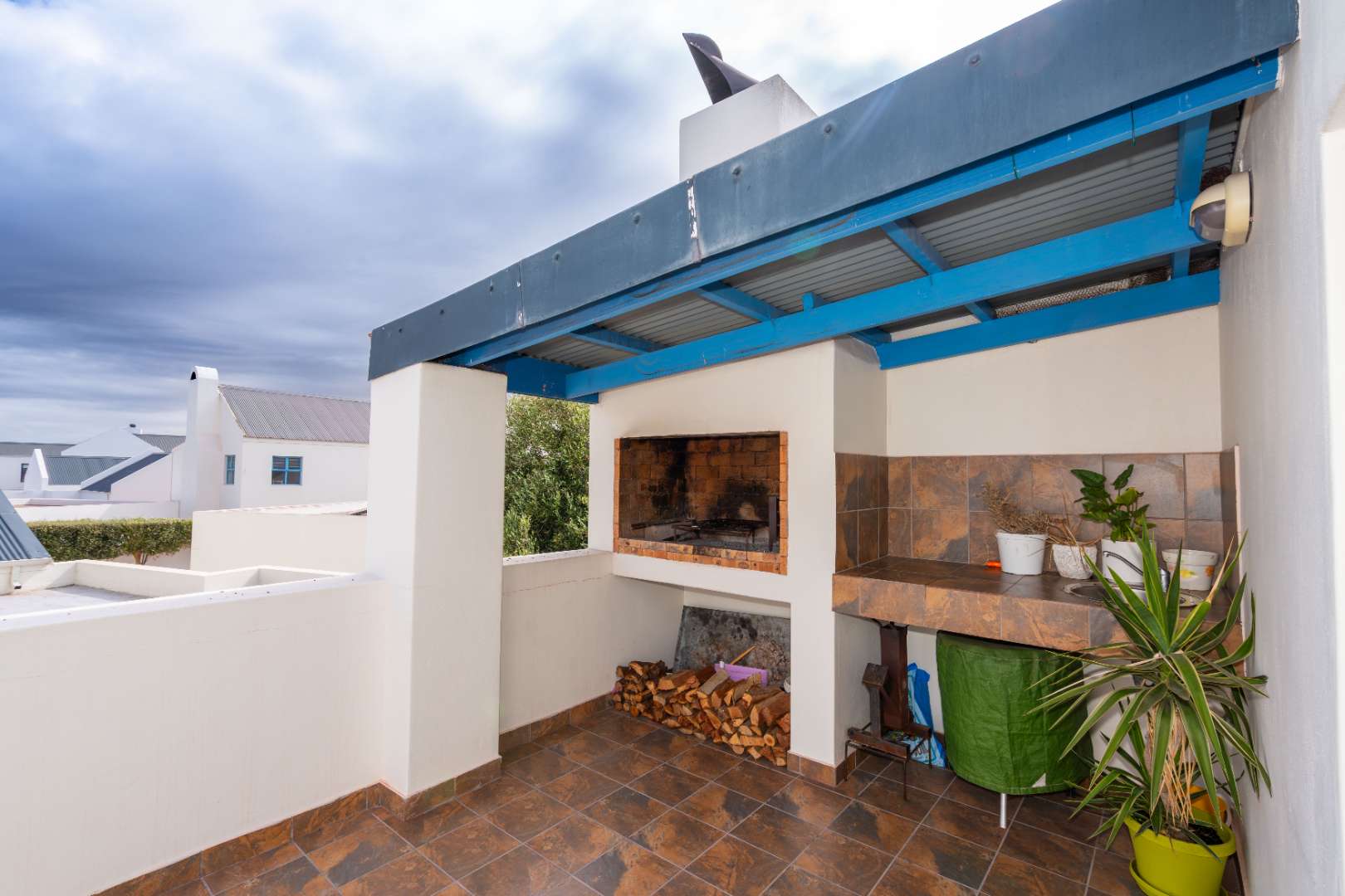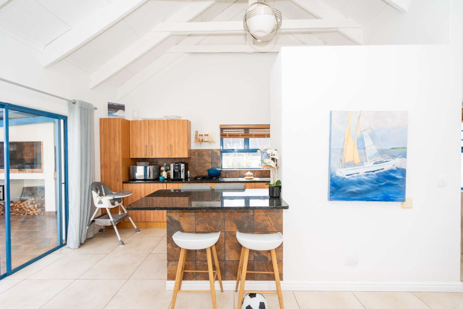The upper level consists of a bright open-plan lounge and kitchen. The kitchen offers ample cupboard space and a peninsula island that works well as a breakfast nook. The lounge includes a built-in braai that also functions as a fireplace for cooler days and opens onto a north-facing patio with an additional built-in braai — ideal for year-round entertaining. A guest toilet is also located on this level.