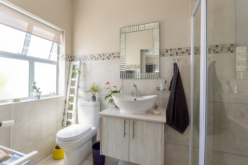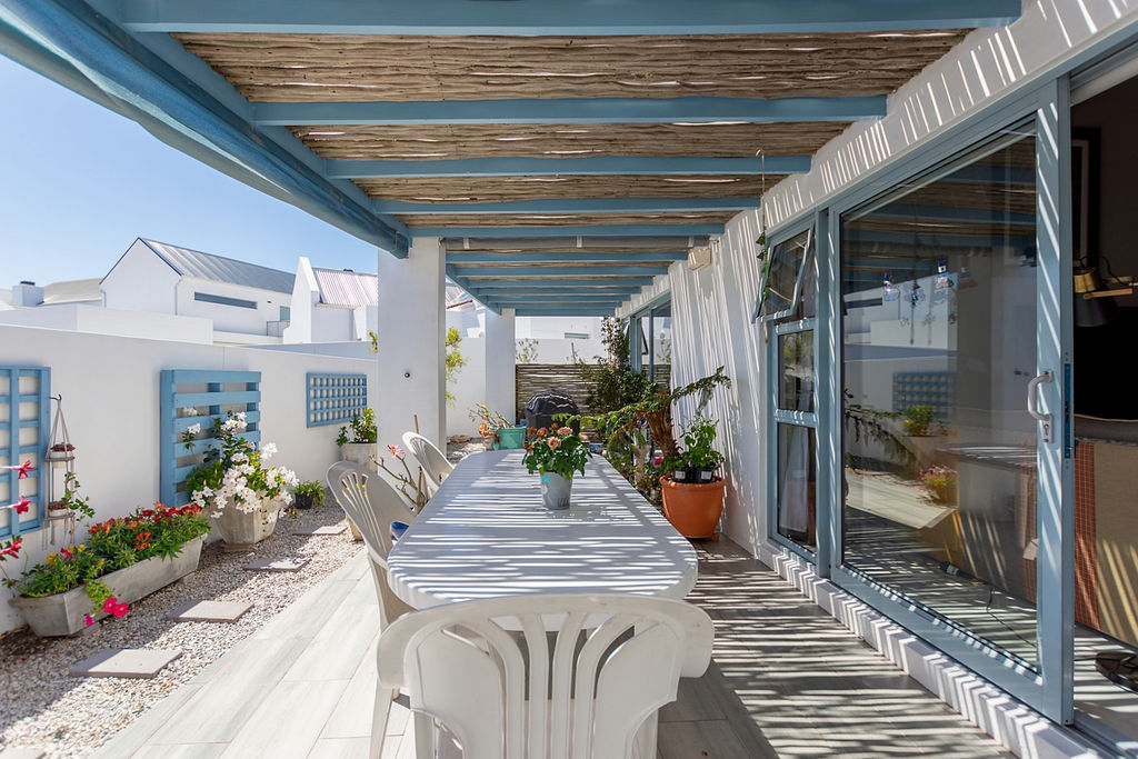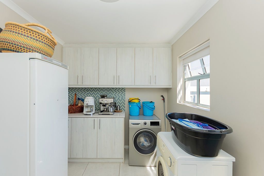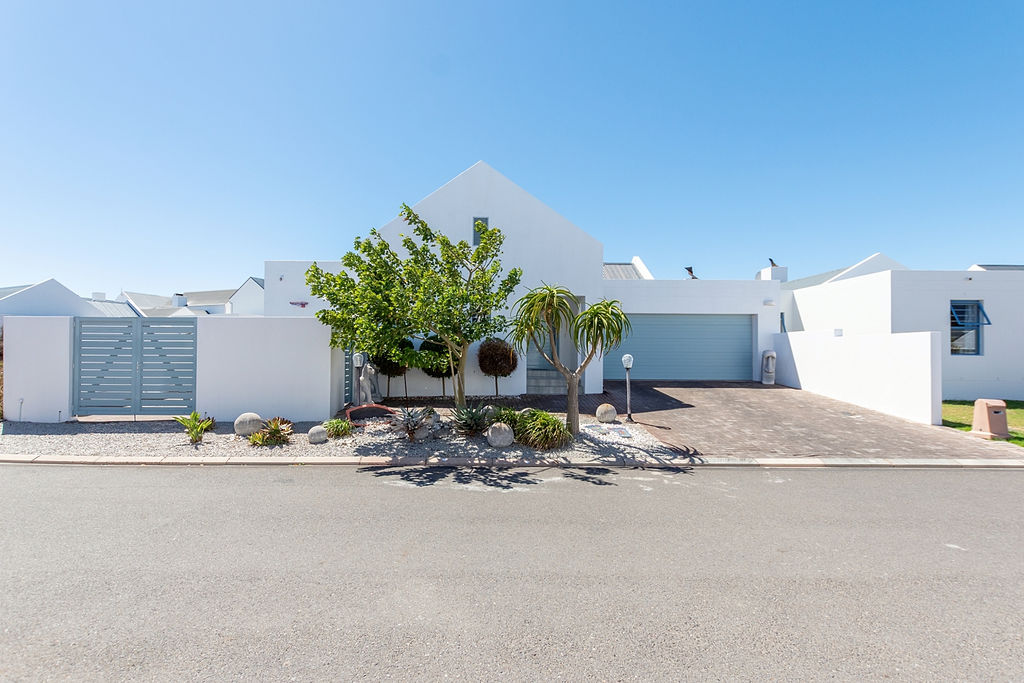 The three spacious bedrooms are tiled throughout, offer ample built in cupboards that are "floor-to-ceiling", heat panels in both spare bedrooms and the master suite also has a North facing sliding door to the patio and also the garden. (Ideal for future jacuzzi / splash-pool options). The master suite has an en-suite bathroom with a large shower, toilet and a washbasin. The family bathroom is a full and tiled bathroom conveniently situated between the 2 spare bedrooms. The double garage with direct access to the home offers 2 "fold-up" washing lines, is large enough for double cab vehicles and also includes the power back-up system of a 5.5KVA Invertor and Lithium battery that draws from 6 solar panels. Off street parking for at least 2 vehicles. Perfect as a permanent residence or a lock-up-and-go holiday home in one of Langebaan’s most sought-after estates and area.
