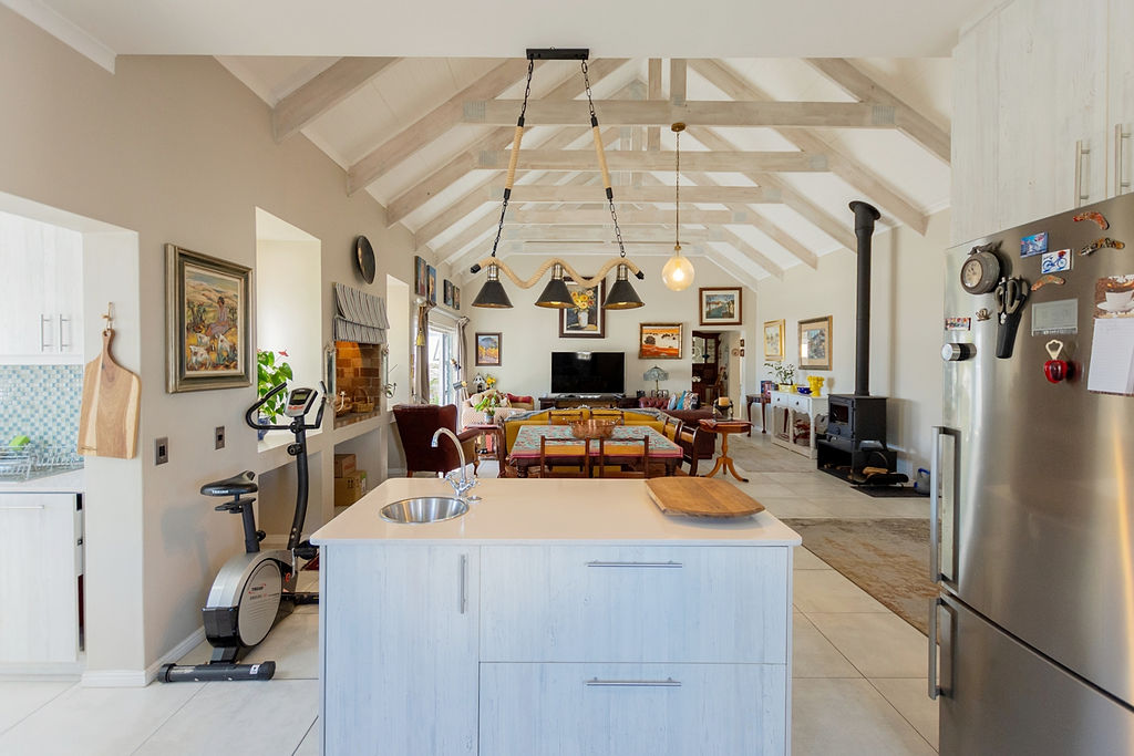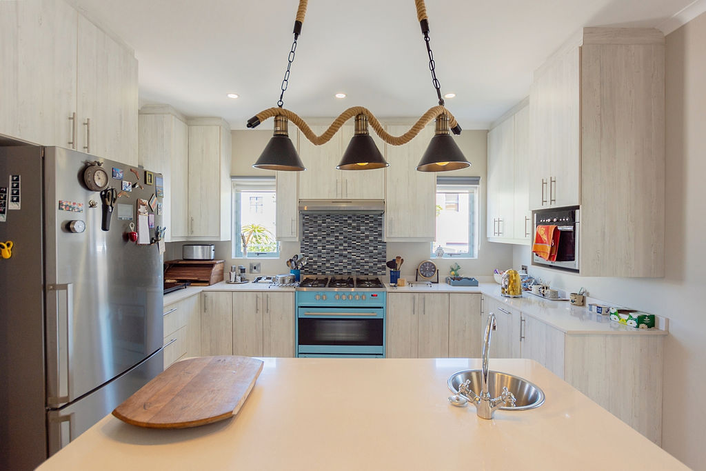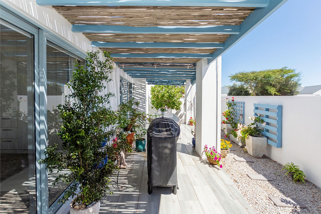 This home in Blue Lagoon, walking distance from Calypso beach, offers relaxed coastal living within a secure, family-friendly estate. A well appointed North West frontage opens to a spacious double volume living room with highly trendy exposed trusses and entertaining flows par excellence. This tiled living area offers an open plan lounge, tv, dining room space with a gourmet Cezar stone finished kitchen. Added ambience with a sought after Henley Druid fireplace for winter comfort and that besides a convenient and well appointed braai for all weather hospitality and entertainment. This living area flows via a large and on the point sliding door to a awesome North facing patio for the convenience of warm summer day braai and entertaining outside. The fitted kitchen with ample built in cupboards, Cezar stone tops, convenient breakfast nook, separate scullery / laundry and also includes a gourmet Meireles oven with a gas top and extractor fan also with a tiled and practical splash-back. The scullery offers ample cupboards and washing points for 3 appliances with flow to the North facing courtyard for access to the washing lines and a well appointed washtrough for scrubbing and cleaning convenience.