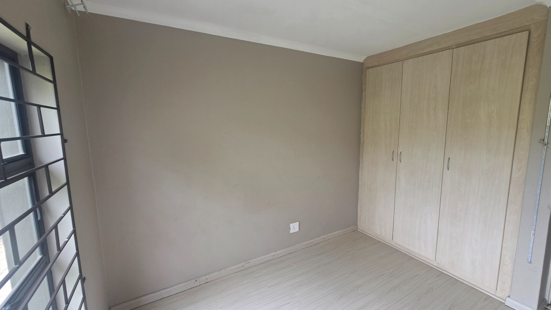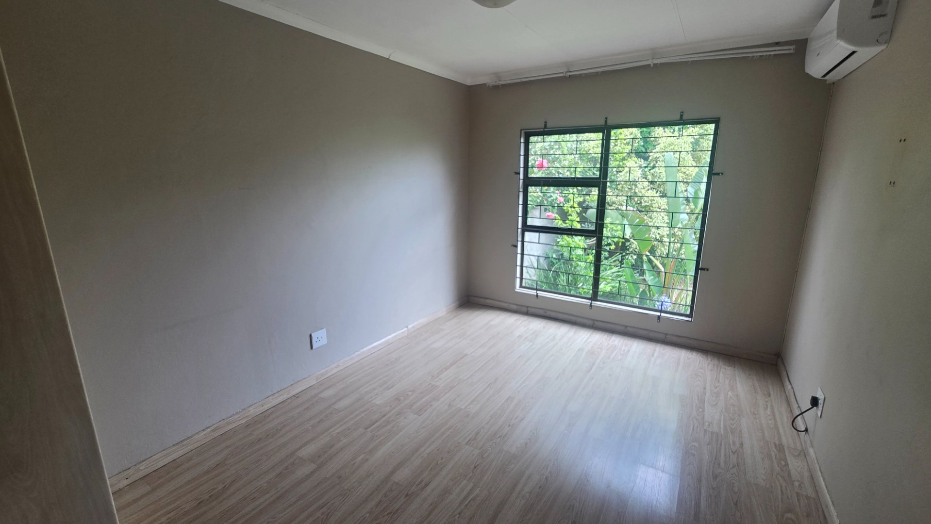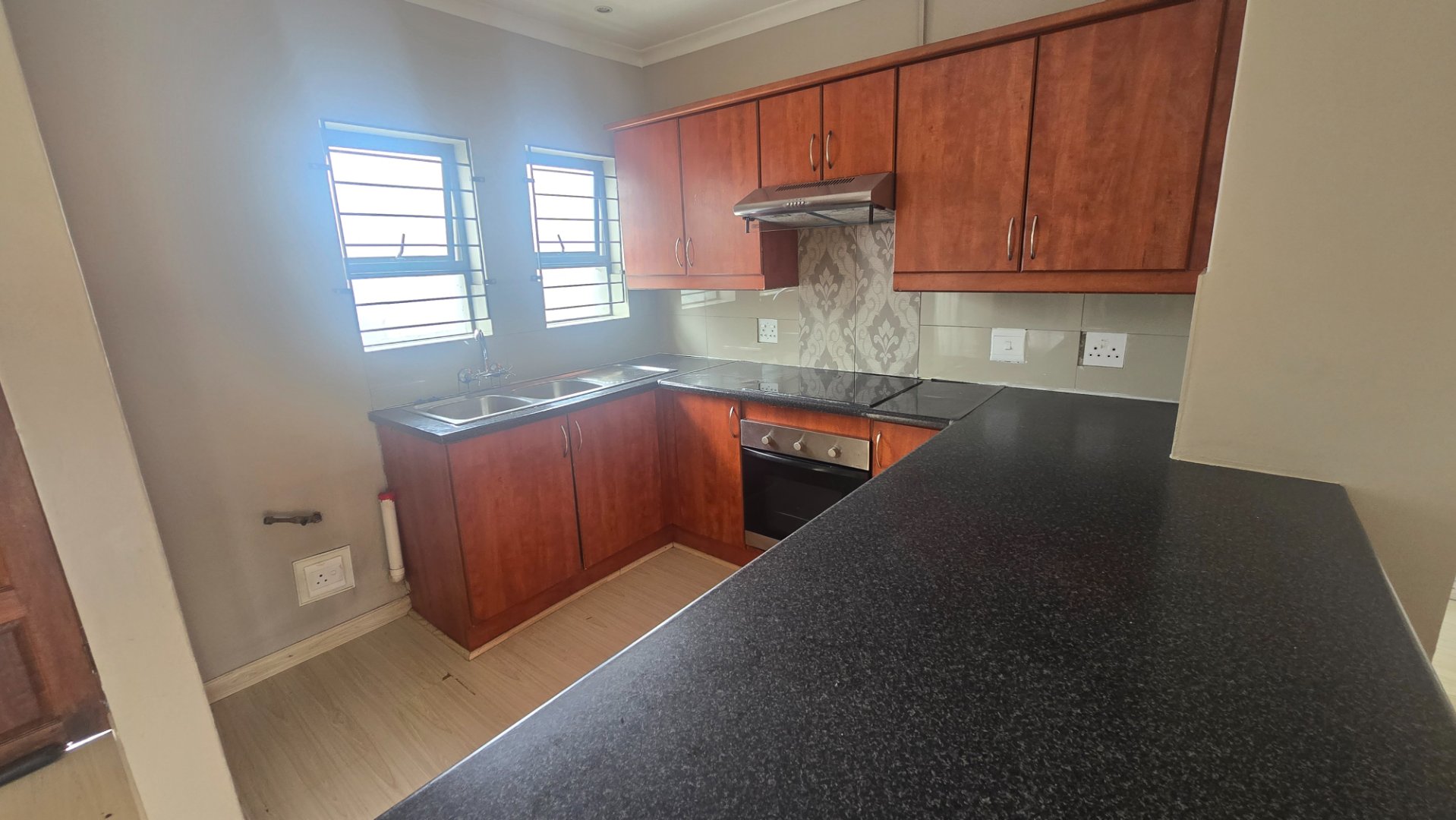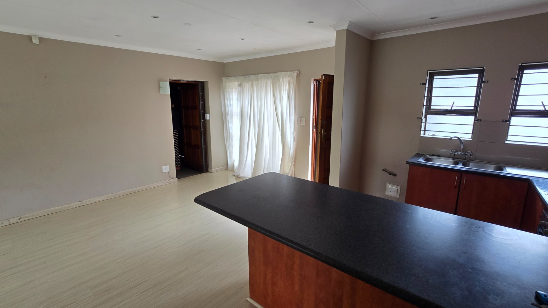 Two large bedrooms with built-in cupboards and laminated flooring. The main bedroom offers an en suite with a shower, basin, and toilet. The main bedroom offers a dressing area and a built-in air-conditioner. In the passage is a linen cupboard. The 2nd bathroom has a shower, basin, and toilet. The passage, lounge, dining room and kitchen have laminated flooring. A well-kept and practical designed kitchen complete this picture. The kitchen has melamine tops, electrical glass hob, and electric oven. There is Space for a single door fridge. The area leading to the passage from the kitchen is large enough for a breakfast nook. The dining room and lounge are open plan to each other and from the lounge is a sliding door to the covered patio. The garden is well maintained and private. Double garage with access into the house through the dining room.