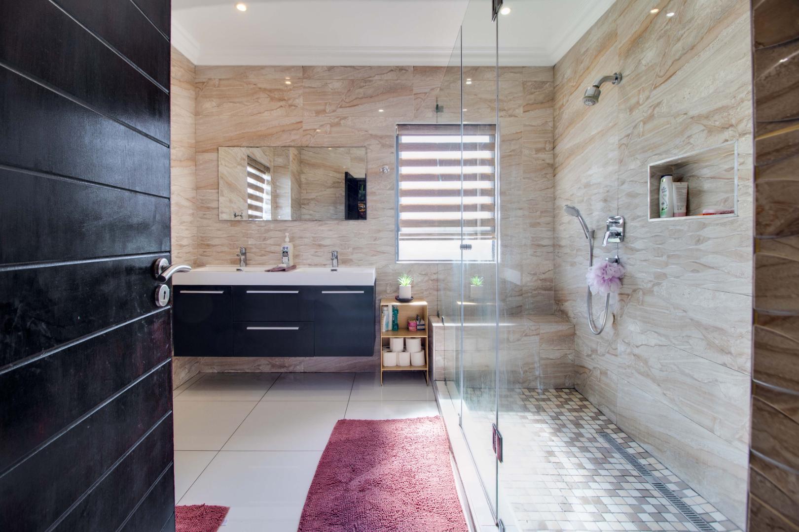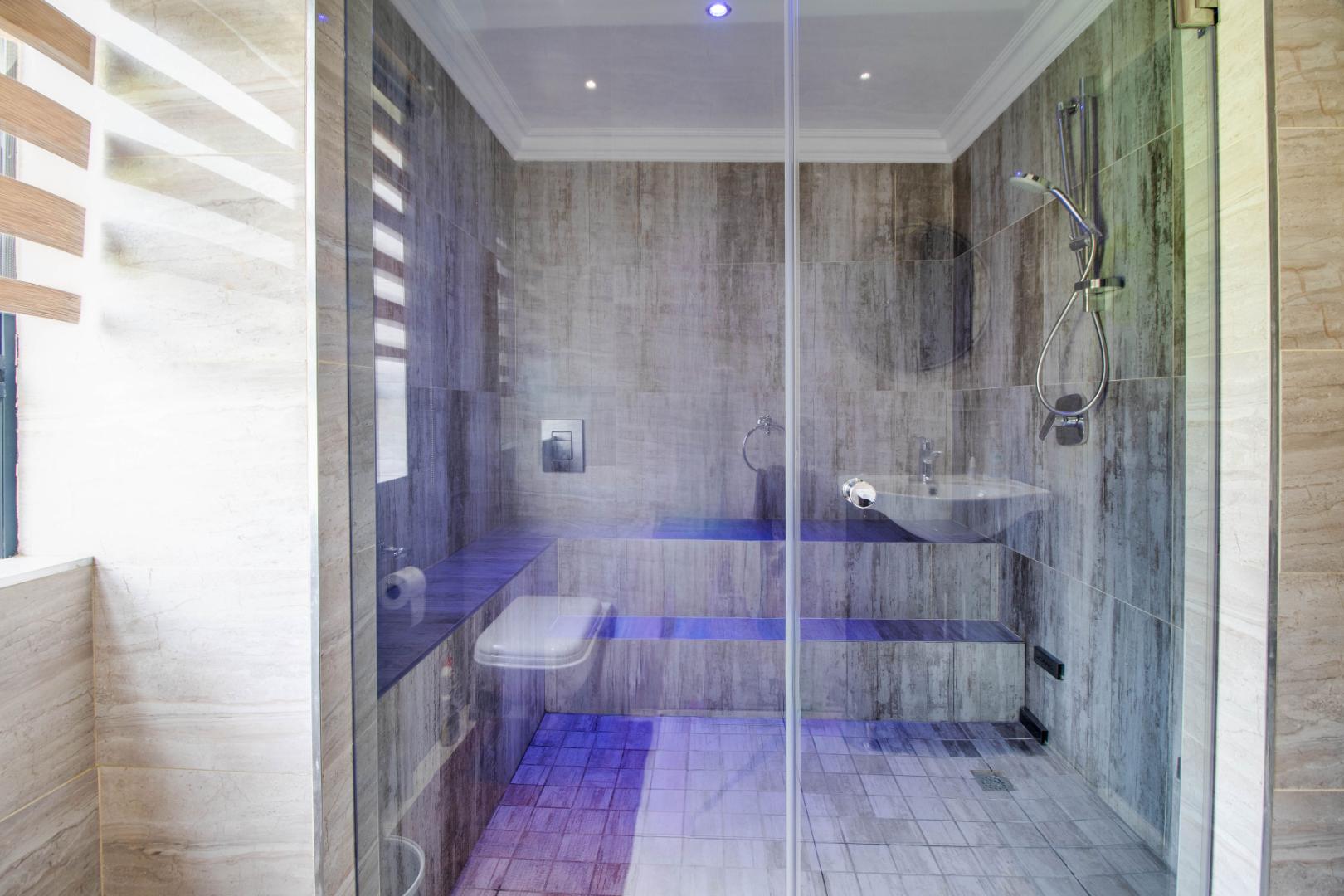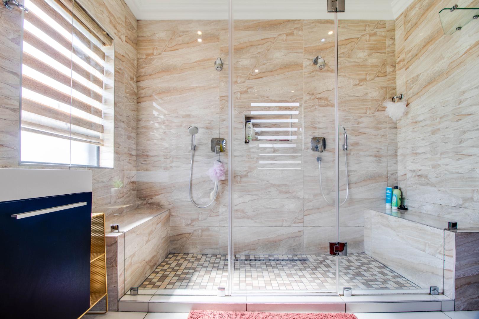 The home features four bedrooms, three upstairs and one downstairs—all finished with elegant laminated flooring. The downstairs suite, currently serving as a private gym, includes its own en-suite bathroom complete with a steam room and dual-function shower, creating the perfect wellness retreat. Crafted with natural tones and soft lighting, this wellness sanctuary offers the ultimate relaxation after a workout or a long day—a touch of spa-inspired indulgence right at home.