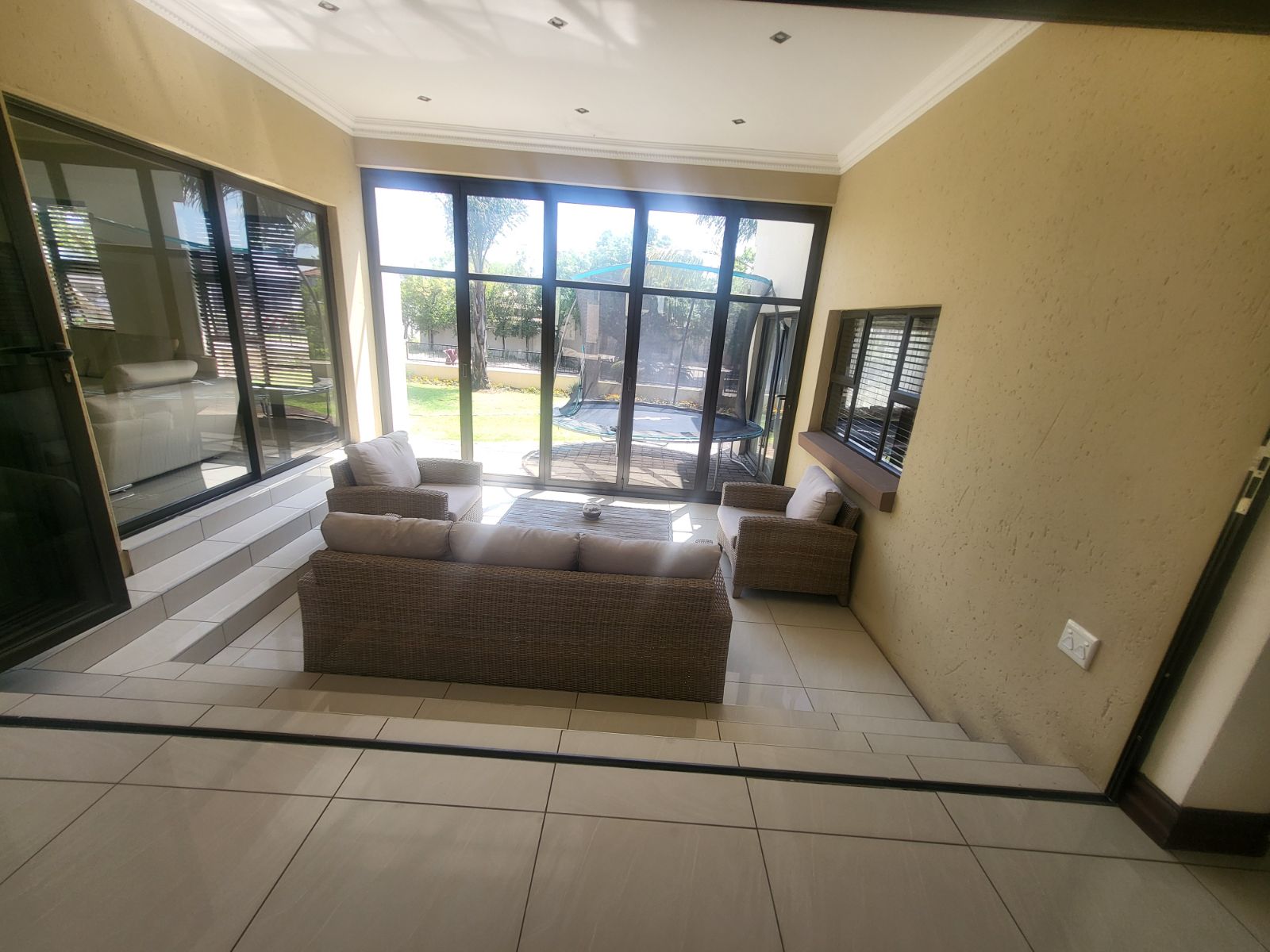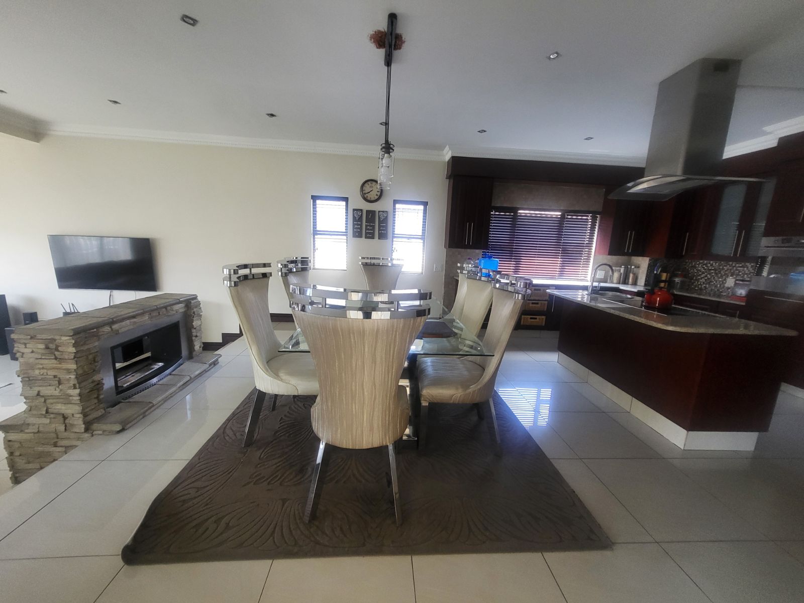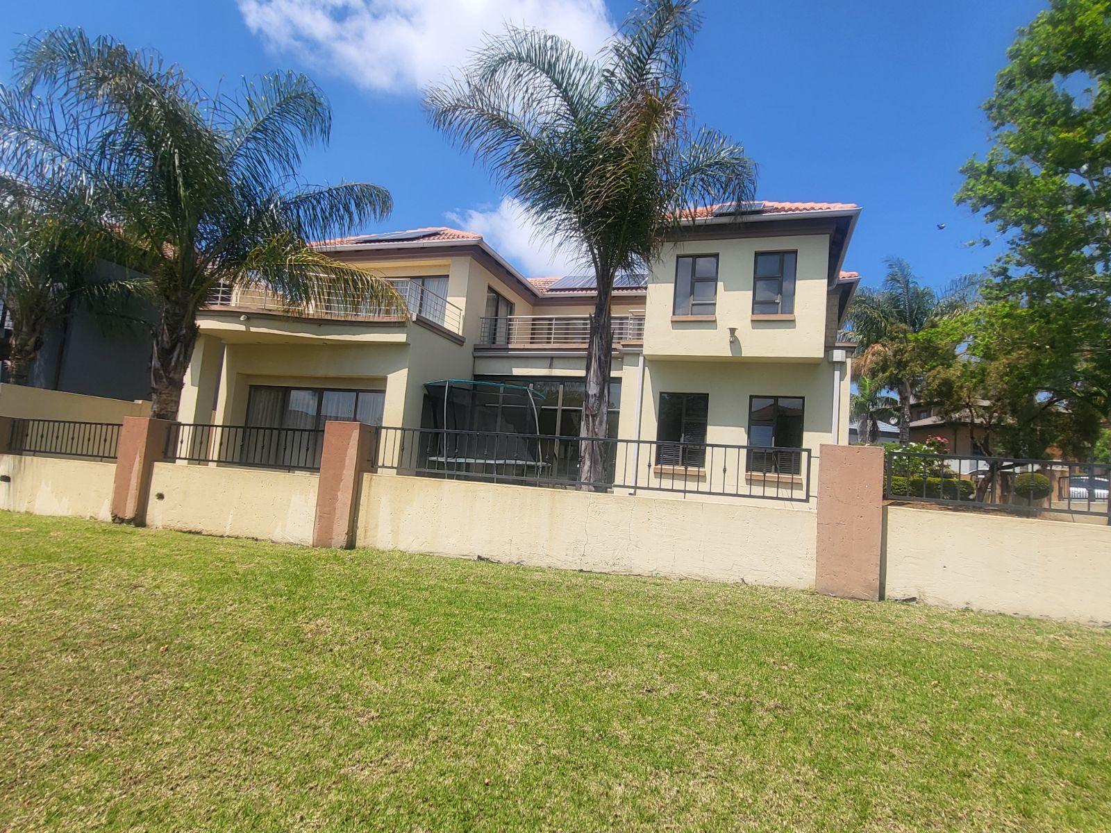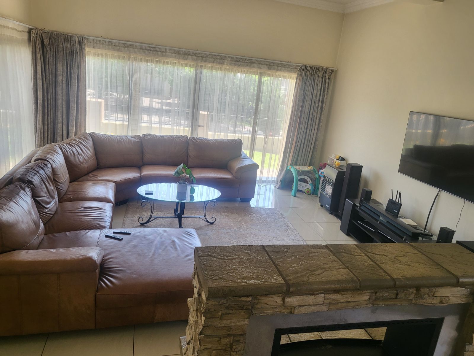 The heart of the home is a sleek, well-appointed kitchen with a central island and generous storage, flowing effortlessly into an inviting family lounge and two family/TV rooms ideal for relaxation and entertaining. A covered patio with sliding doors opens to the outdoors, creating the perfect space for gatherings or quiet evenings. The gas fireplace adds warmth and charm, while the solar system and solar-powered geyser ensure convenience and peace of mind, even during load shedding.