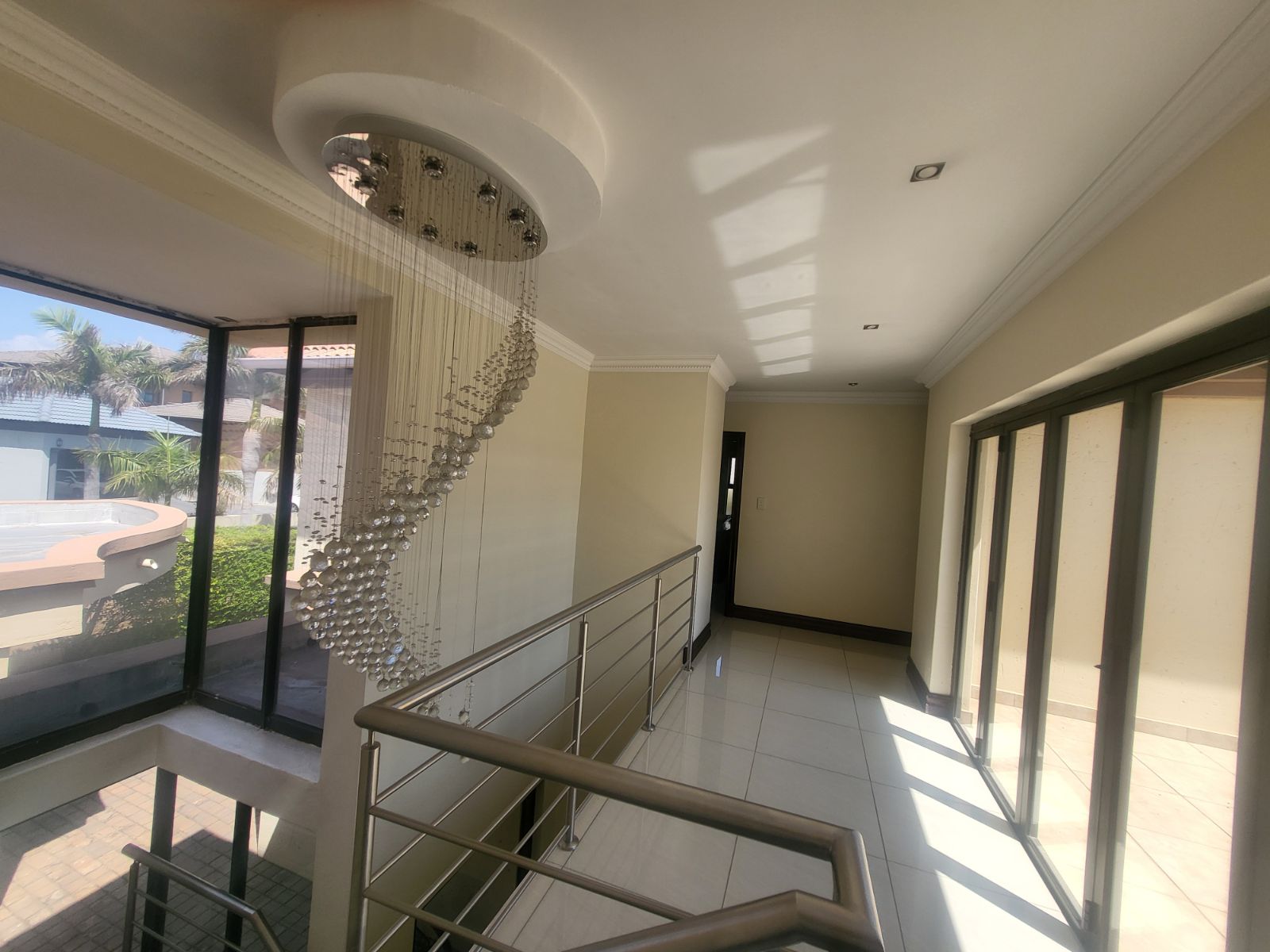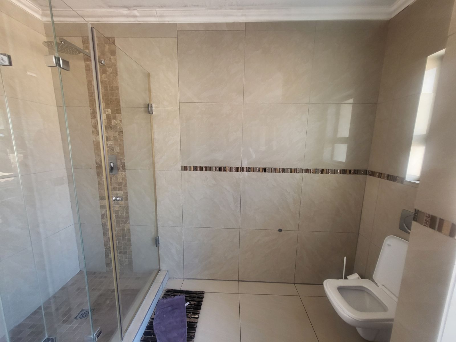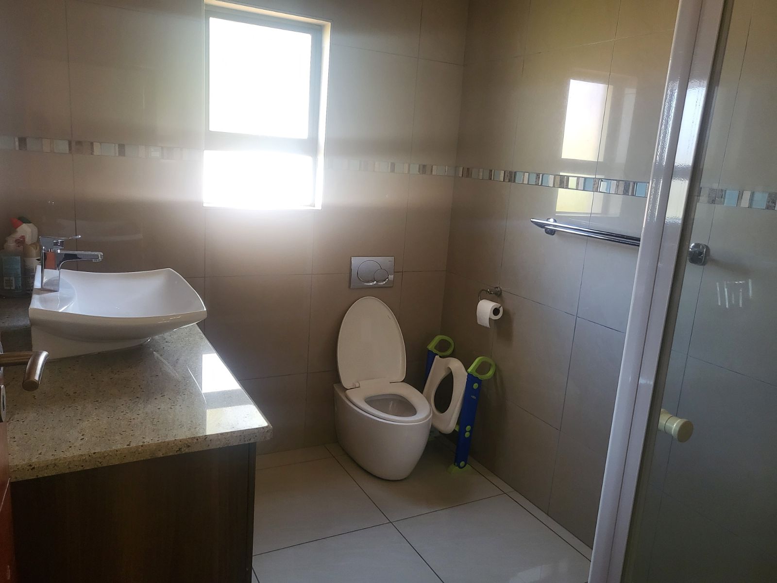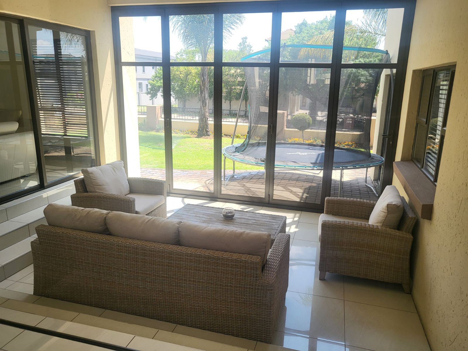The heart of the home is a sleek, well-appointed kitchen with a central island and generous storage, flowing effortlessly into an inviting family lounge and two family/TV rooms ideal for relaxation and entertaining. A covered patio with sliding doors opens to the outdoors, creating the perfect space for gatherings or quiet evenings. The gas fireplace adds warmth and charm, while the solar system and solar-powered geyser ensure convenience and peace of mind, even during load shedding.