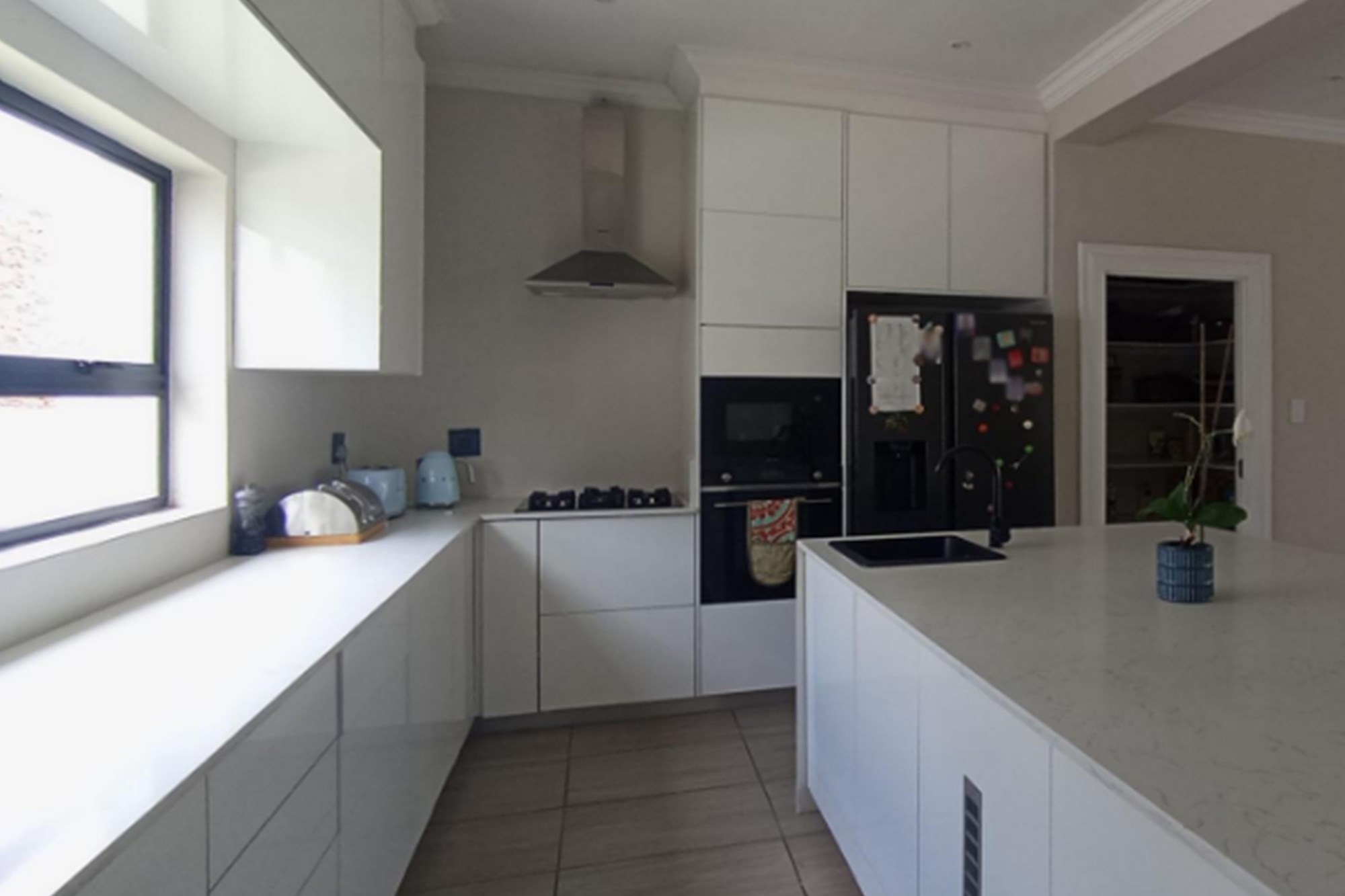 Additional features include staff quarters with a private bathroom, a double automated garage with direct access to the kitchen, prepaid electricity, a gas geyser, and fully tiled flooring throughout the home for easy maintenance.