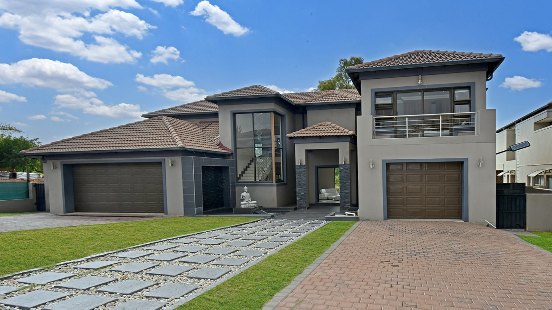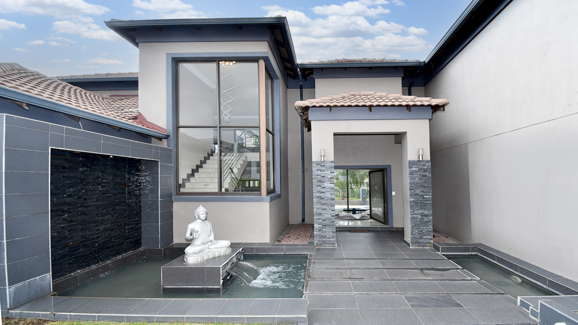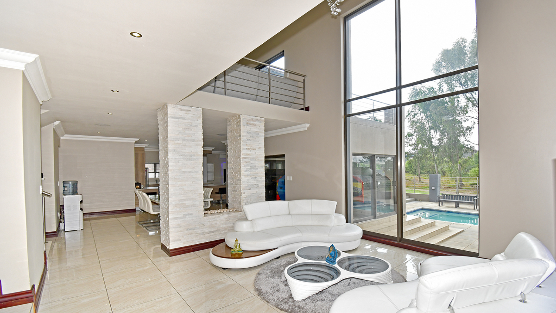 From the moment you arrive, a cascading water feature at the entrance sets a serene, almost meditative tone. Towering palm trees frame the property, adding a sense of grandeur and tropical elegance. Inside, a soaring double-volume lounge unfolds in natural light, anchored by a sculptural fireplace that blends modern design with timeless warmth.
