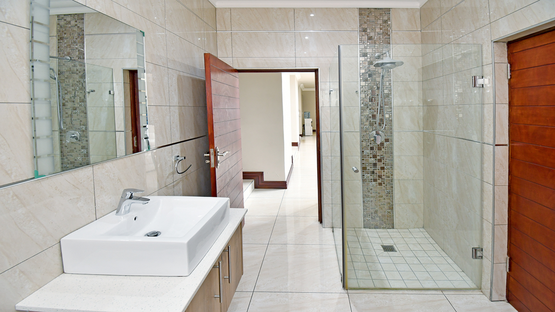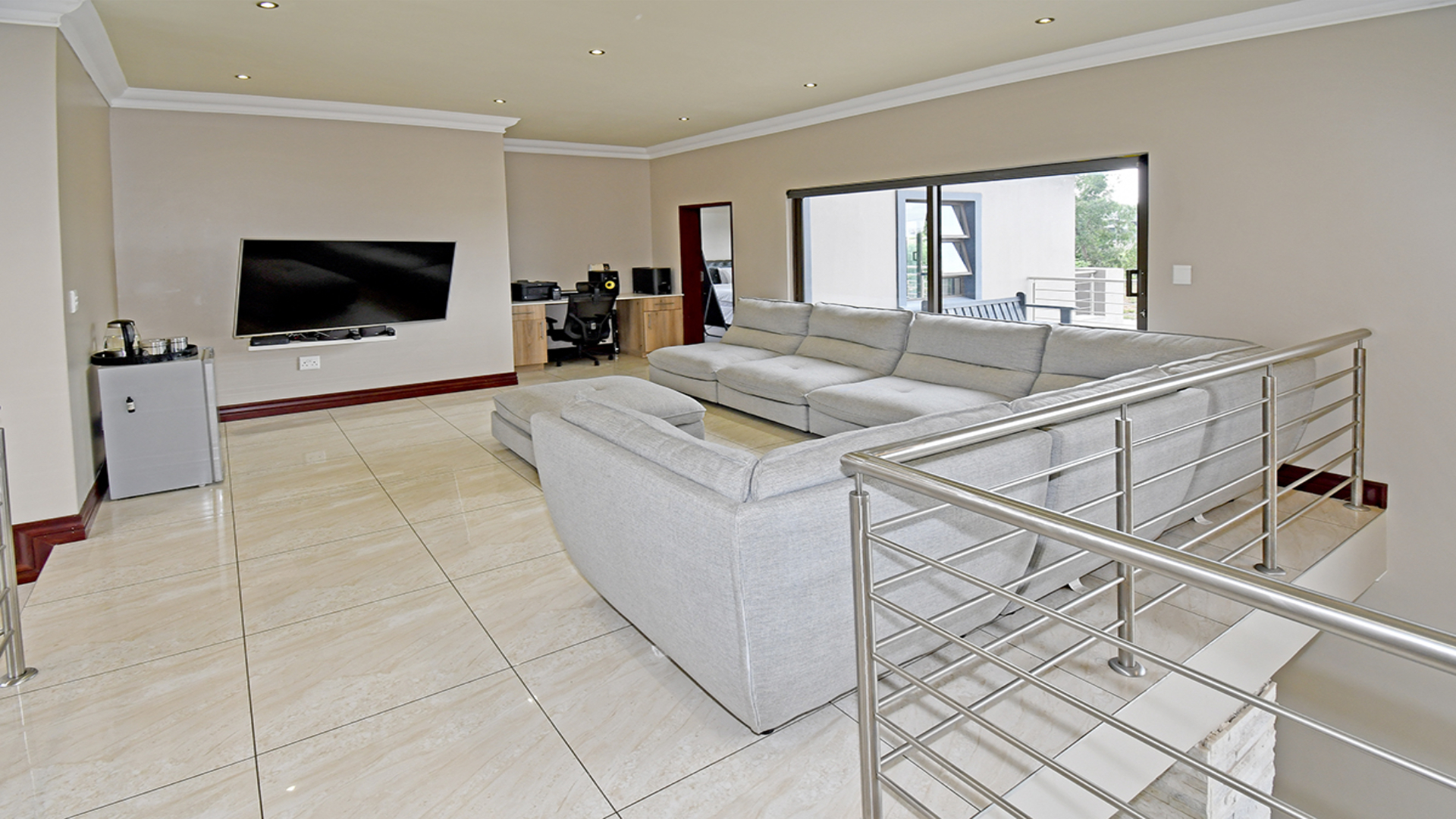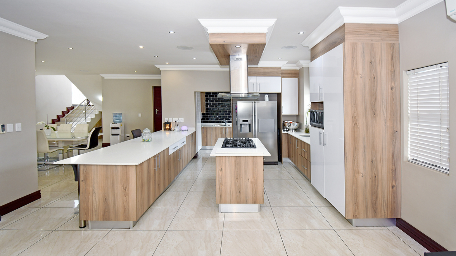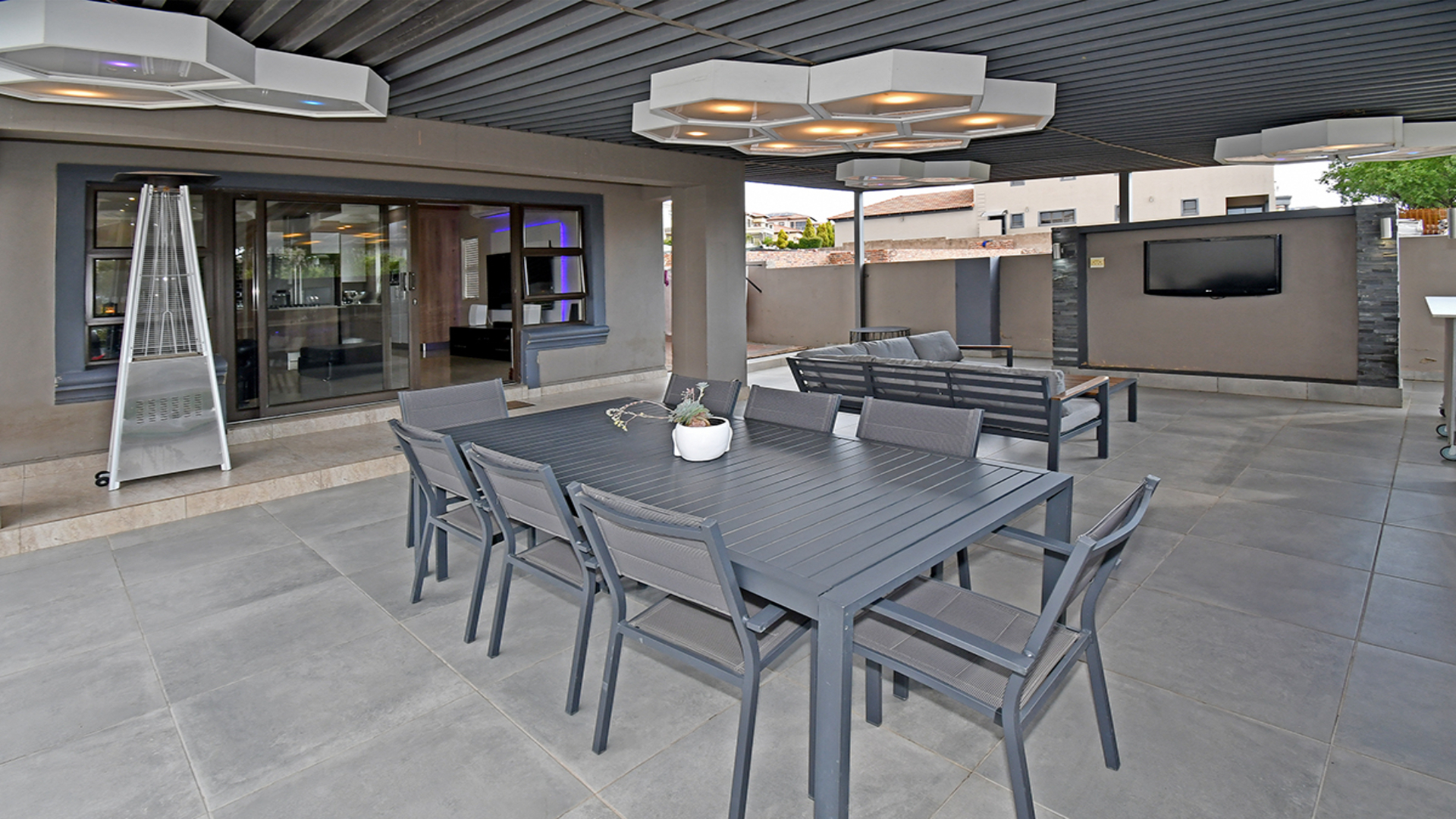 From the moment you arrive, a cascading water feature at the entrance sets a serene, almost meditative tone. Towering palm trees frame the property, adding a sense of grandeur and tropical elegance. Inside, a soaring double-volume lounge unfolds in natural light, anchored by a sculptural fireplace that blends modern design with timeless warmth.