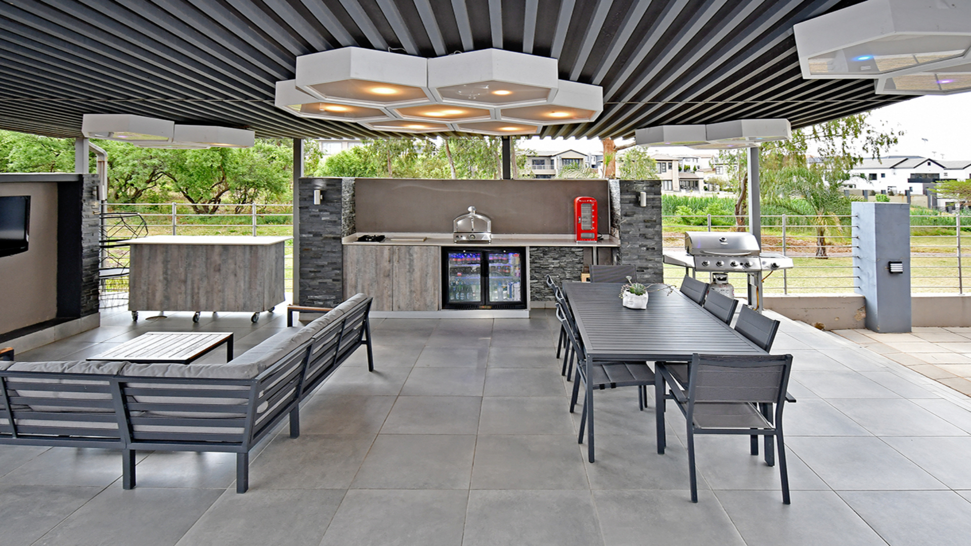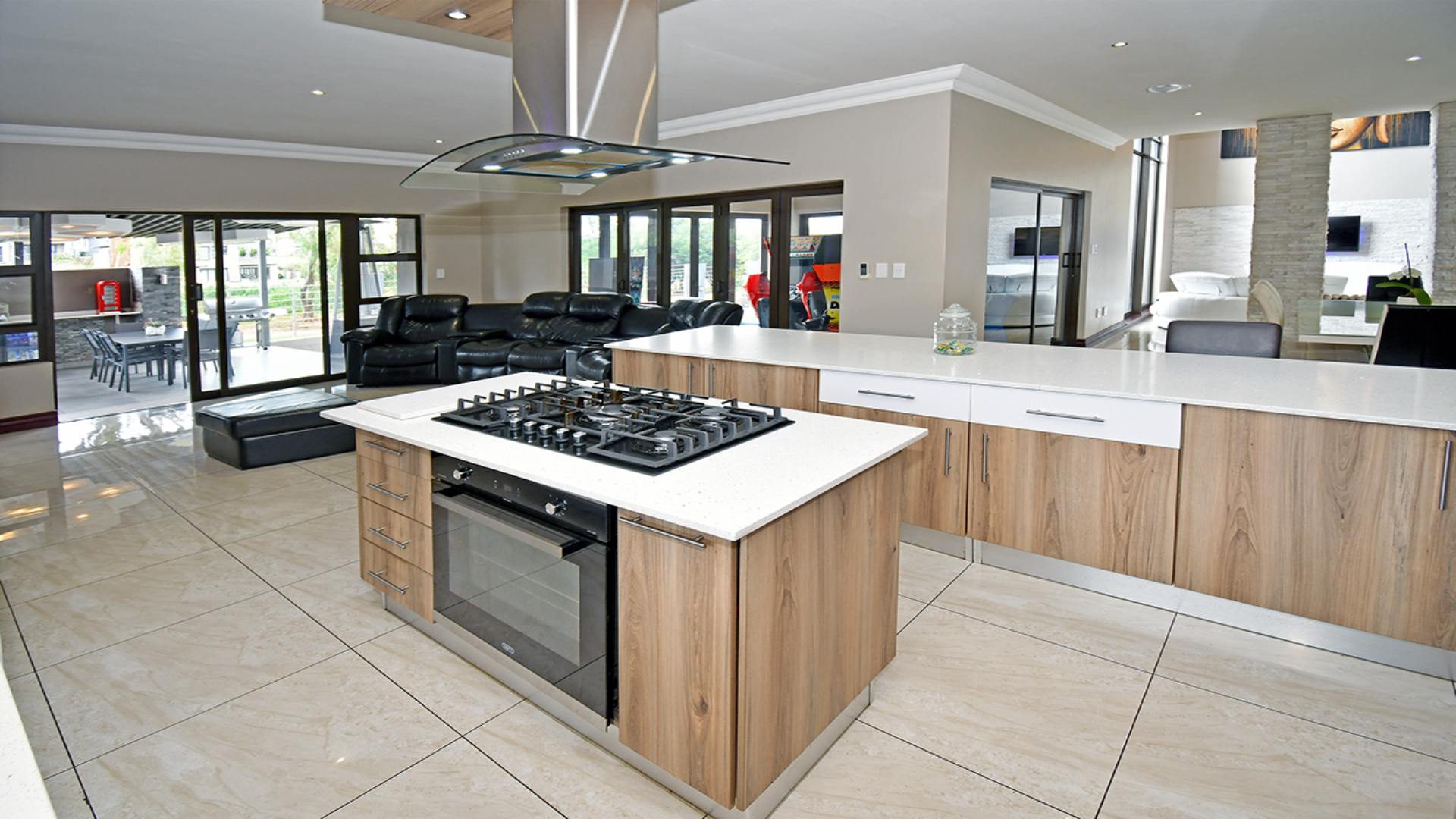The kitchen, finished in sleek Caesar stone and outfitted with chef-grade appliances, flows seamlessly into the dining and entertainment spaces. Walls of glass extend the living experience outward, where a landscaped garden, sparkling pool, and entertainer’s terrace create an effortless connection between indoors and out. Beyond, the property dissolves into the greenbelt, offering uninterrupted views, birdsong at dusk, and the rare luxury of space that feels both private and expansive.