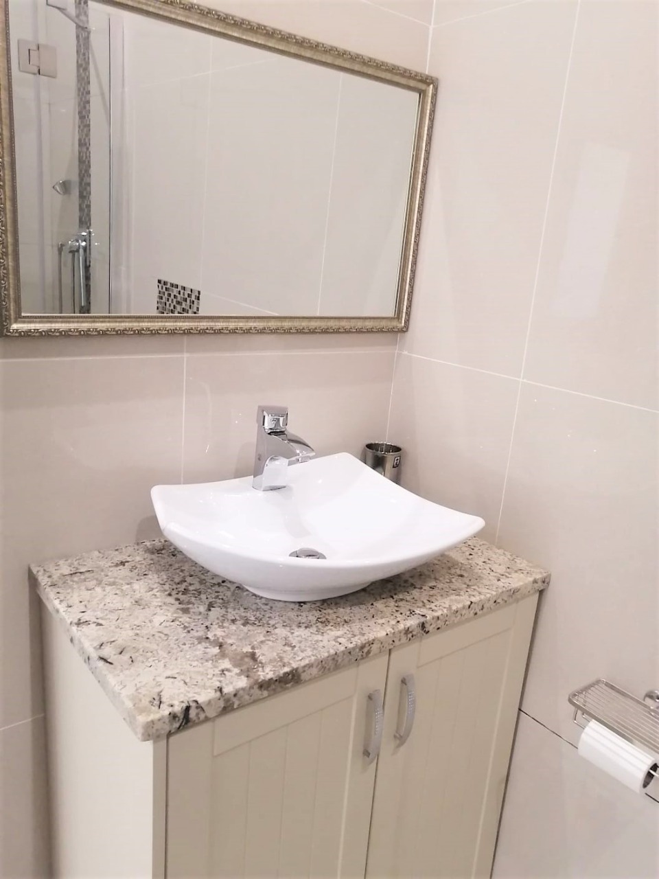 The separate enclosed bedroom with cupboards and spacious bathroom.