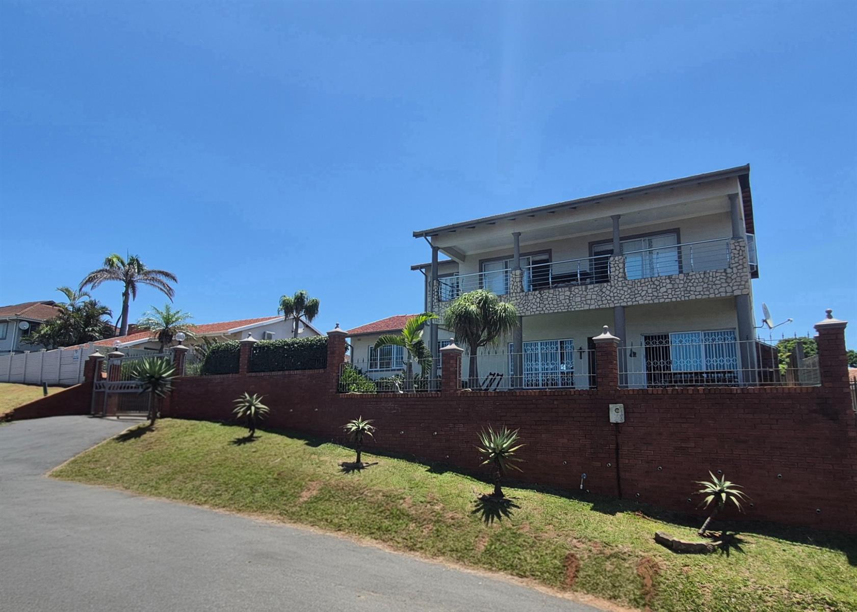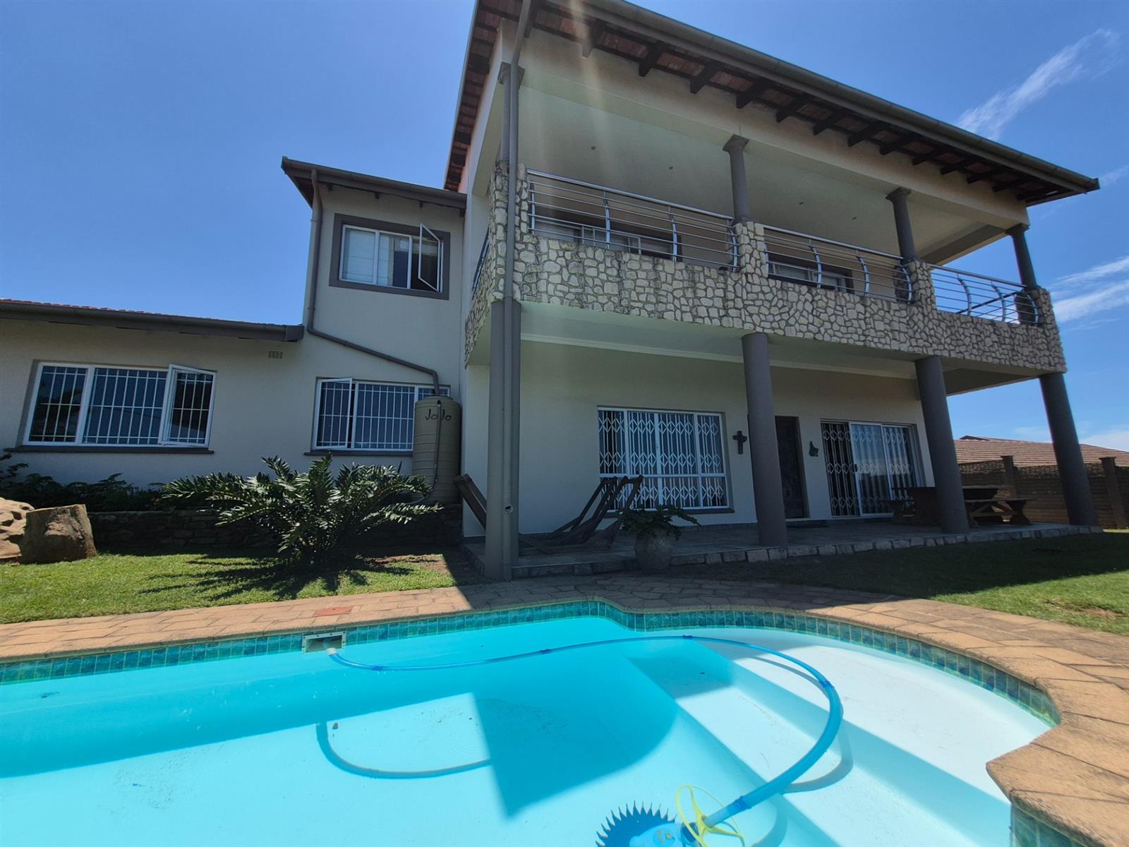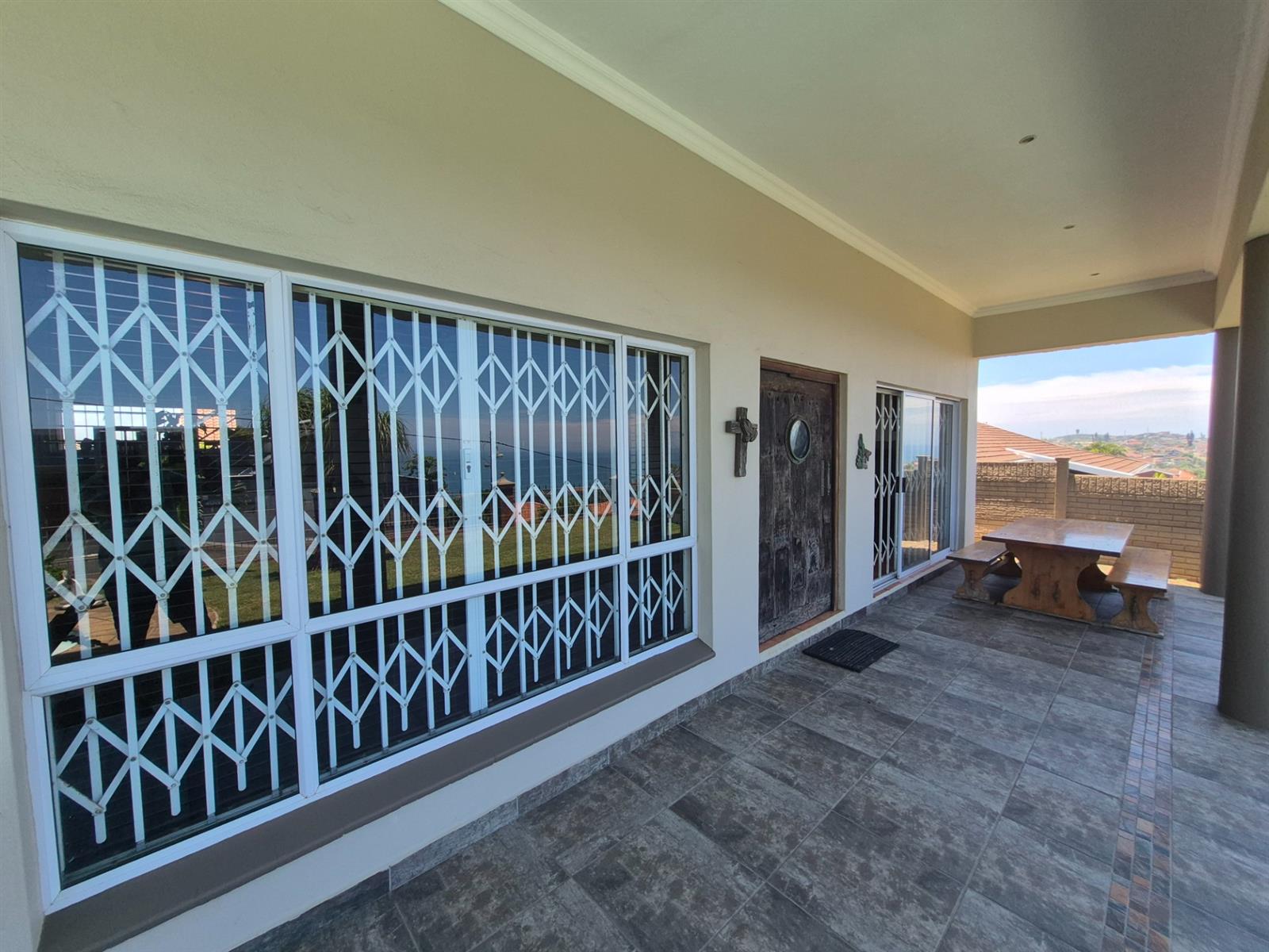 An indoor entertainment braai room, featuring a striking built-in fish tank, opens out to a sparkling swimming pool, perfect for relaxed coastal living. The lower level also includes two additional bedrooms, a home office, and a full bathroom, ideal for extended family or work-from-home convenience.