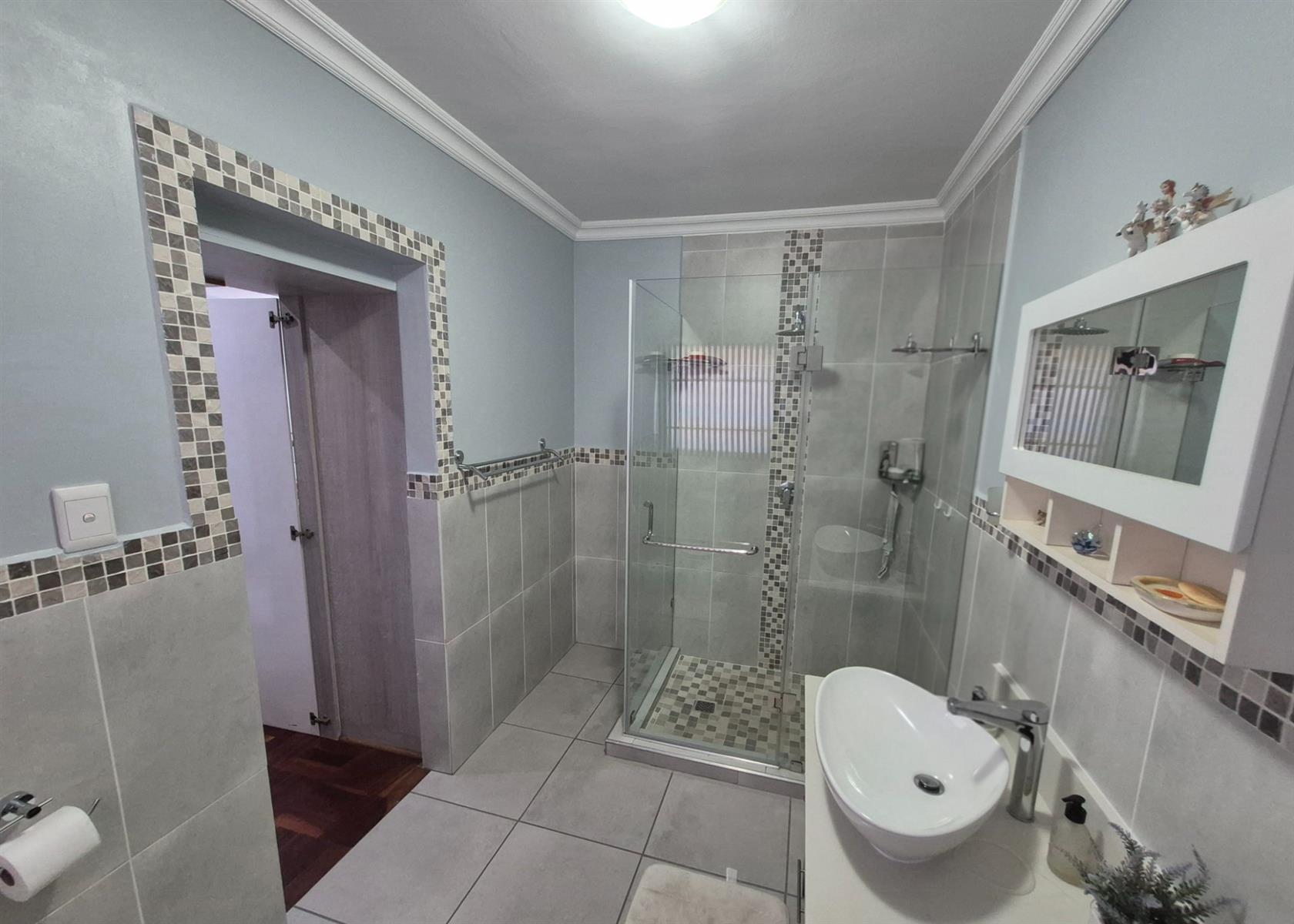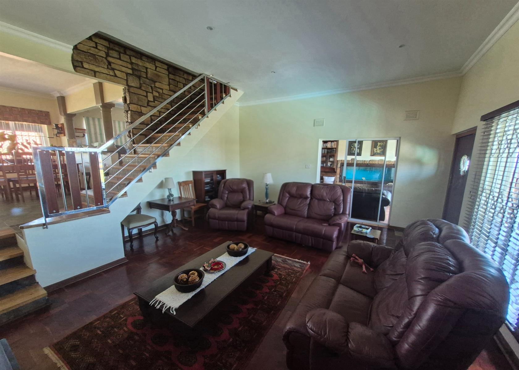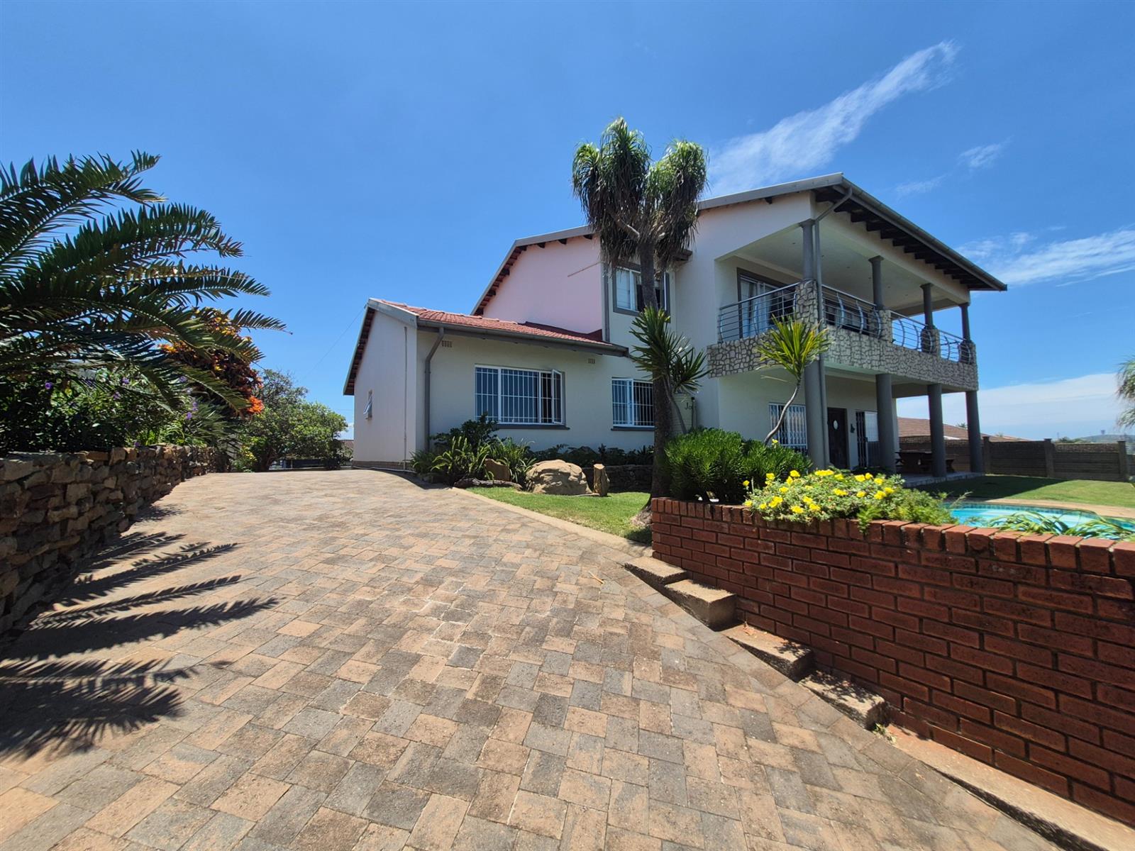 An indoor entertainment braai room, featuring a striking built-in fish tank, opens out to a sparkling swimming pool, perfect for relaxed coastal living. The lower level also includes two additional bedrooms, a home office, and a full bathroom, ideal for extended family or work-from-home convenience.