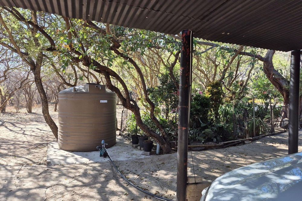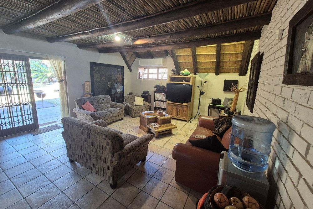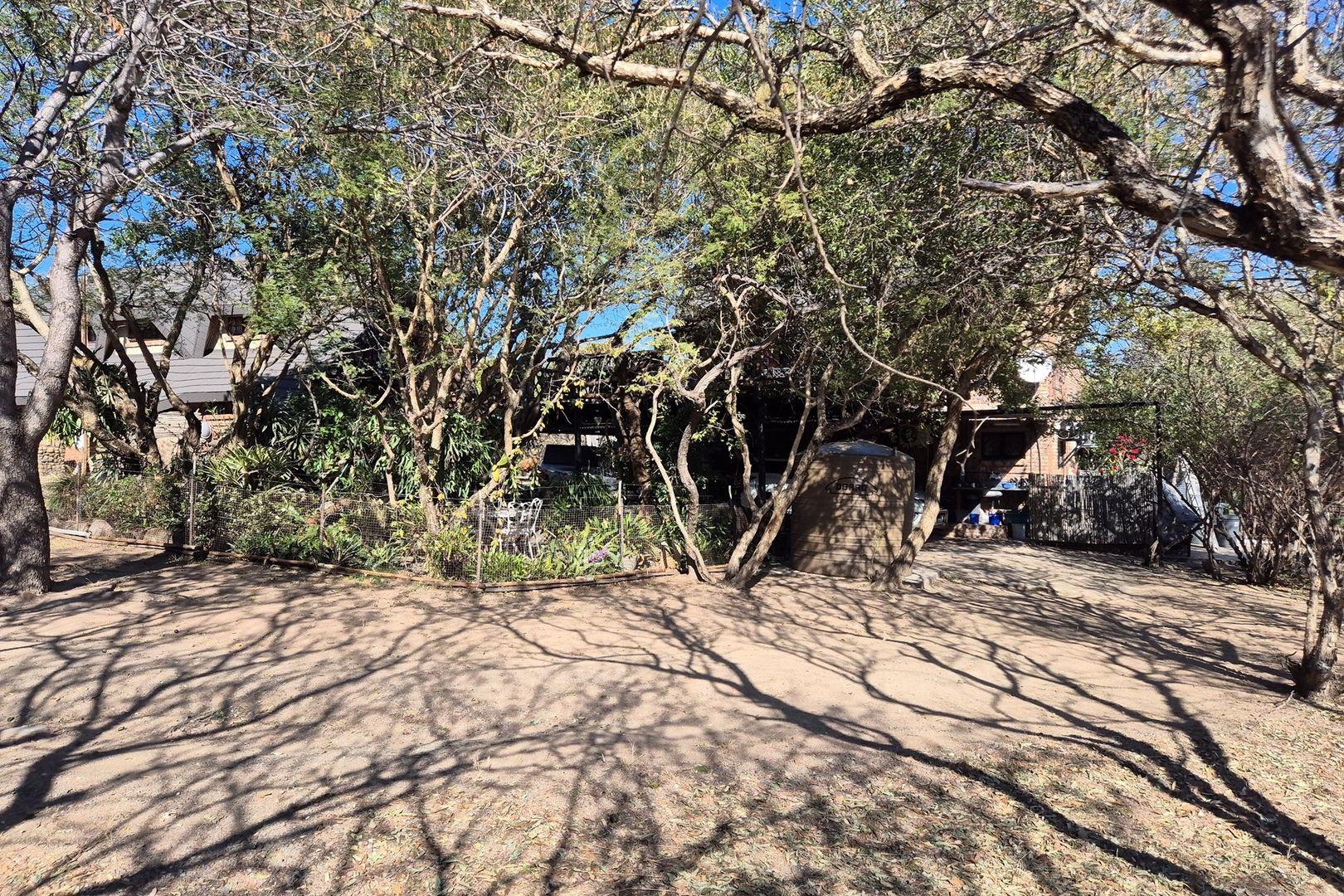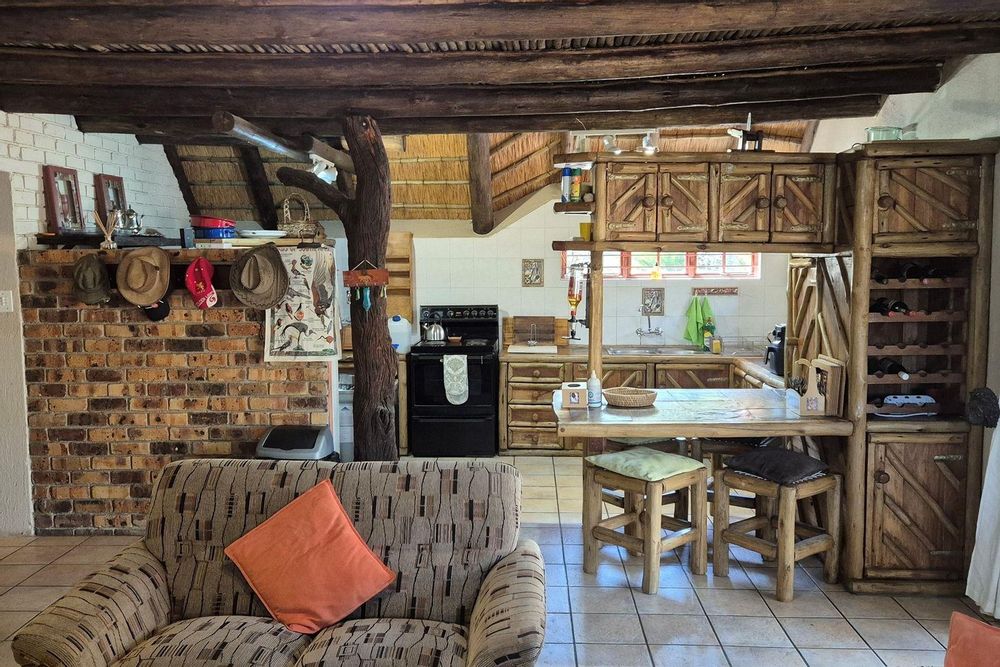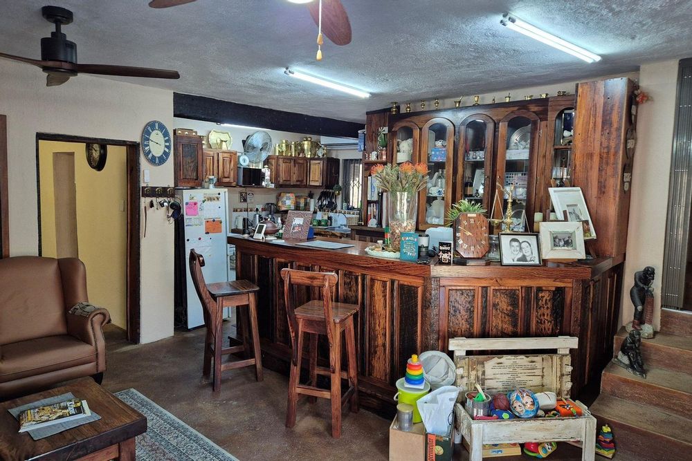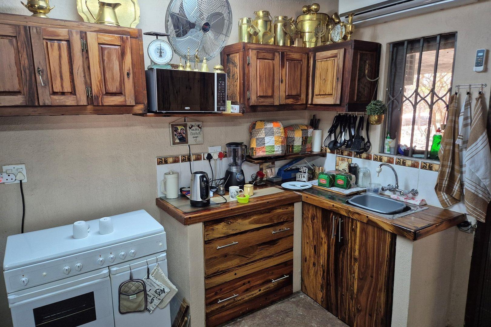 The second residence has an expansive wraparound veranda with built in braai and wash basin on the second floor supporting all round views of mountains, garden and African bush, also looking down over a designed fenced tea garden with a variety of orchard flowers You decide everyday which scenery you want to enjoy. Also upstairs is a large entertainment area with lounge and dining room, inviting family time and special blessed family days. This area also has enormous heavy sleeper wood furniture and impressive sturdy cupboards, in one corner a sunny open bathroom with toilet that encourages extended stay in this cosey and inviting environment. The veranda is big enough for a variety of braai equipment with enough seating to entertain plenty of family and visitors, accentuated by thepeaceful garden and vistas surrounding you.A wooden sleeper wood staircase takes you down to the main bedroom ,open plan lounge and kitchen with a heavy wooden slab for early breakfast or a bar area, cupboards crafted out of sleeper wood and wooden seating,all inviting and supporting a warm relaxing environment.