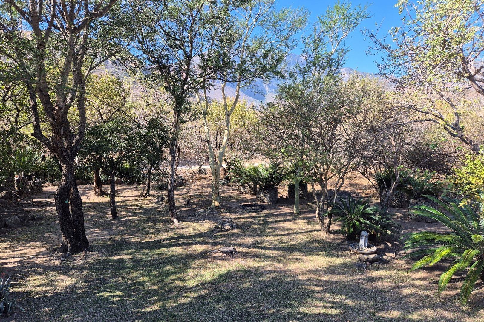The main house consists of the main room with ensuite bathroom,lounge ,kitchen and dining room downstairs with two bedrooms on the second floor sharing a bathroom, both with sliding doors out to stoeps with wonderful mountain and garden views. Heavy wooden cupboards and furniture crafted from sleeper wood ensure a well balanced warm rustic feel. This all covered with a harvey tiled roof ensuring minimum maintenance. This premises has its own well designed boma area, separate and private, set within the specially crafted botanical garden exhibiting a big variety of different plants and trees, some labelled with the English, Afrikaans and scientific names, reflecting the detail and thought that went into the garden design.