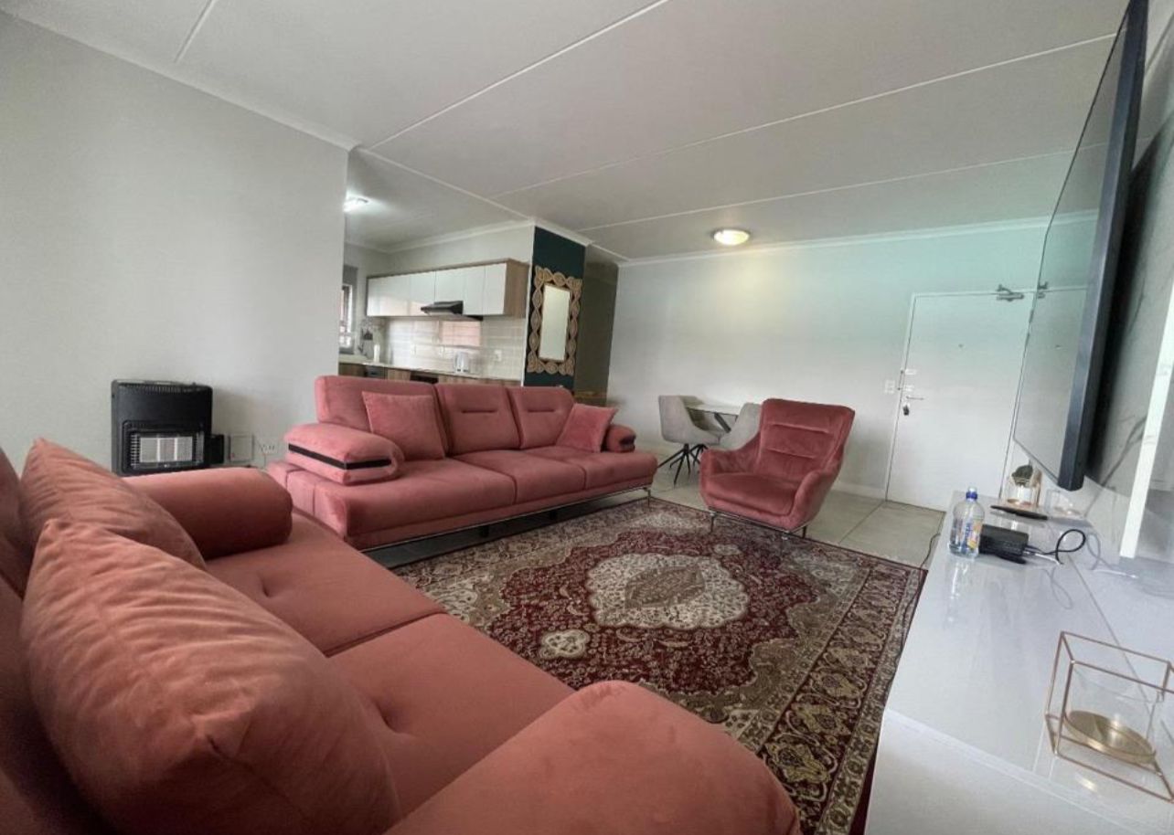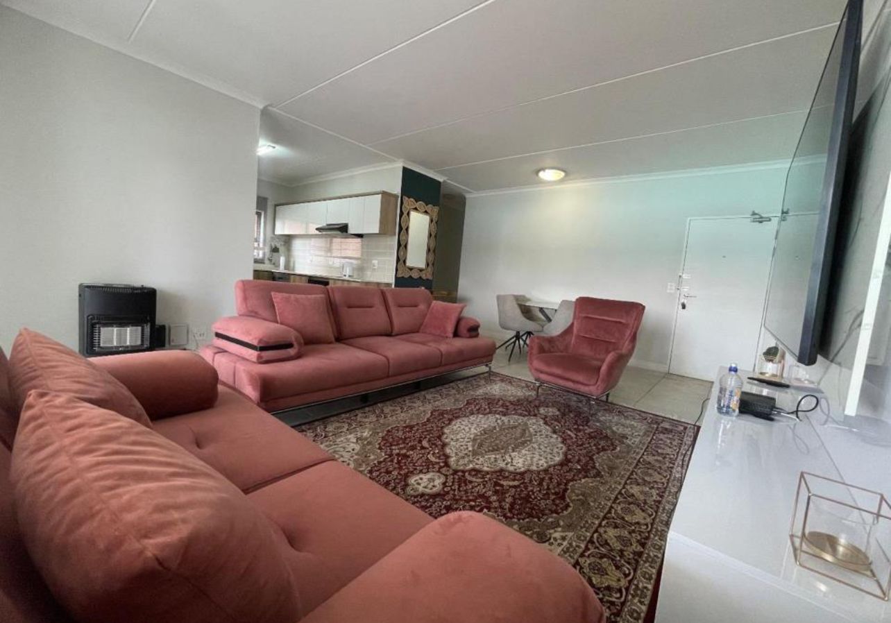 This spacious 3-bedroom apartment boasts a modern, open-plan design that's perfect for families, professionals, or anyone who appreciates effortless living. Step inside to a bright and airy living area featuring neutral tones, sleek tiled flooring throughout, and abundant natural light streaming in from large windows draped with elegant sheer curtains. The lounge is comfortably furnished with a plush dark gray sectional sofa, a stylish wooden coffee table, and a flat-screen TV mounted on a contemporary entertainment unit—ideal for relaxing evenings or entertaining guests. Adjacent is the dining space, complete with a sturdy wooden table seating six on woven rattan chairs, creating a warm hub for meals and gatherings.
