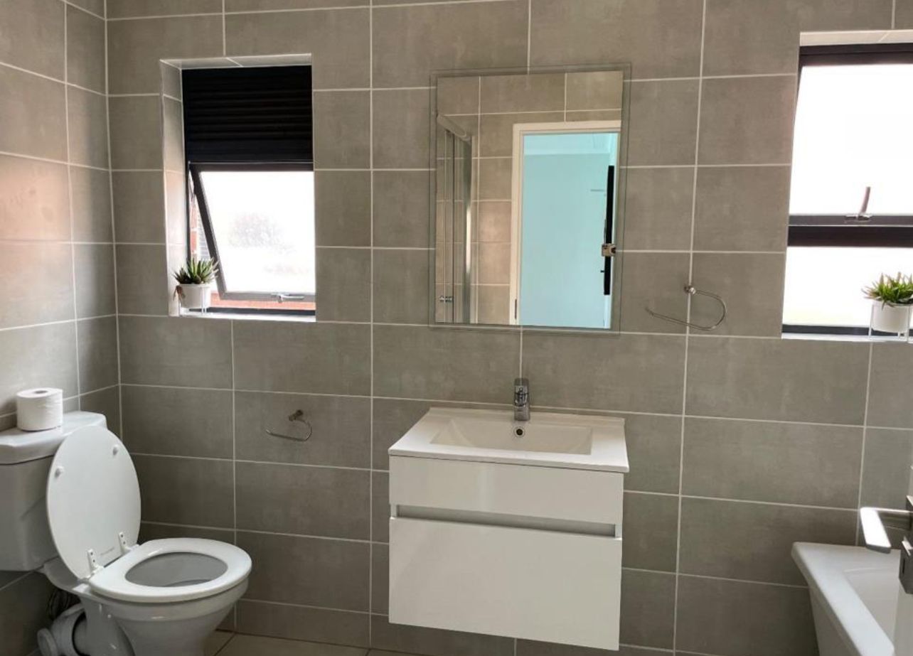 Bathrooms are a highlight, with two full en-suites showcasing modern gray tiling, glass-enclosed showers, a deep soaking bathtub in one, sleek white vanities, and mirrors that add to the spa-like feel. Everything is impeccably maintained, ensuring a fresh, hotel-quality experience every day.