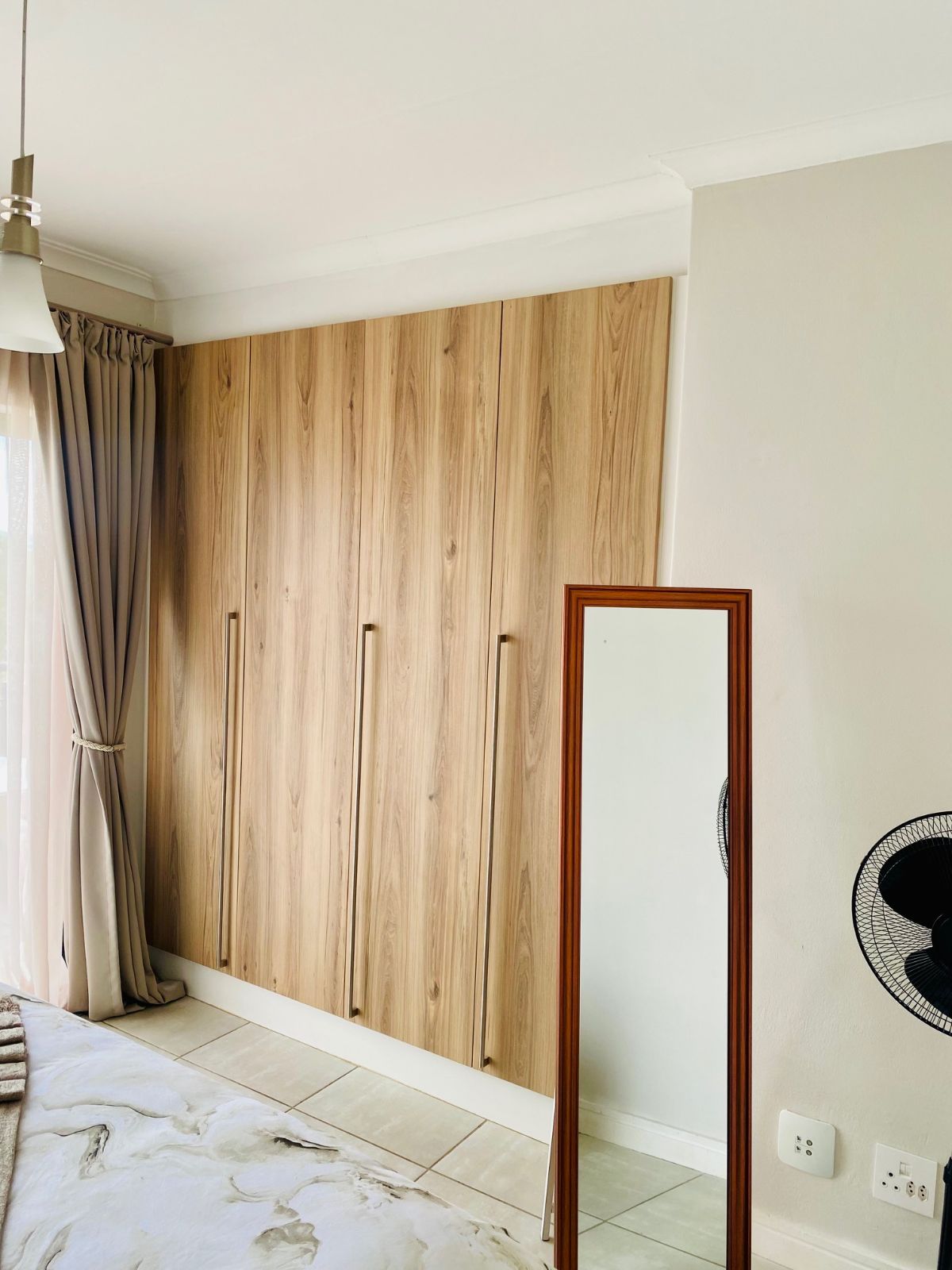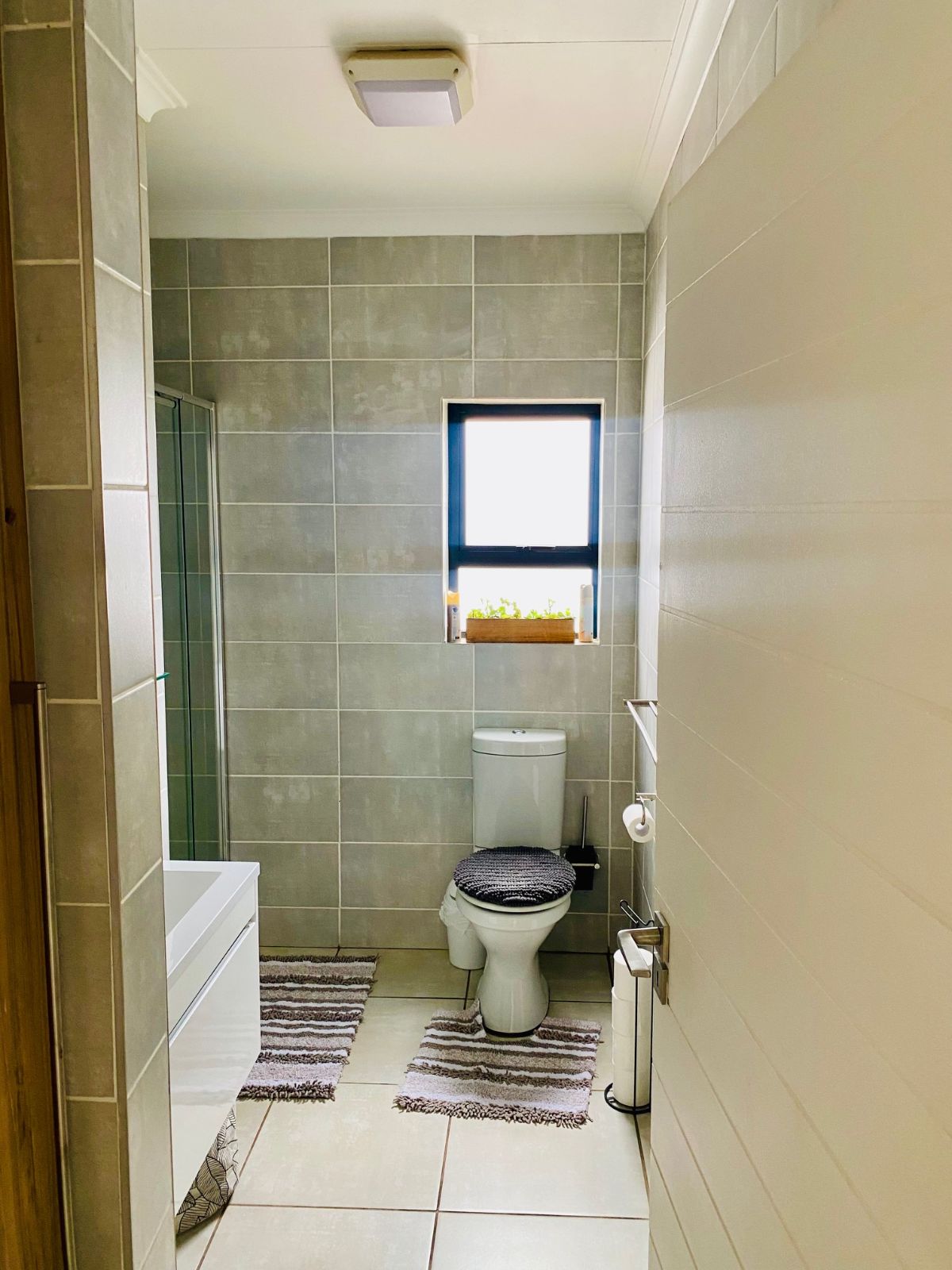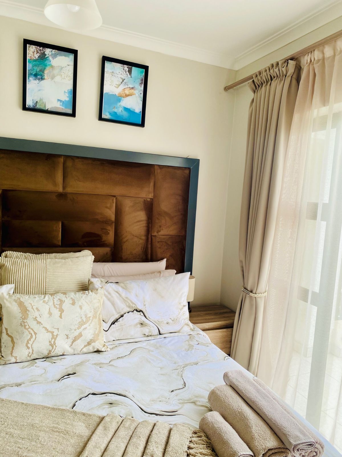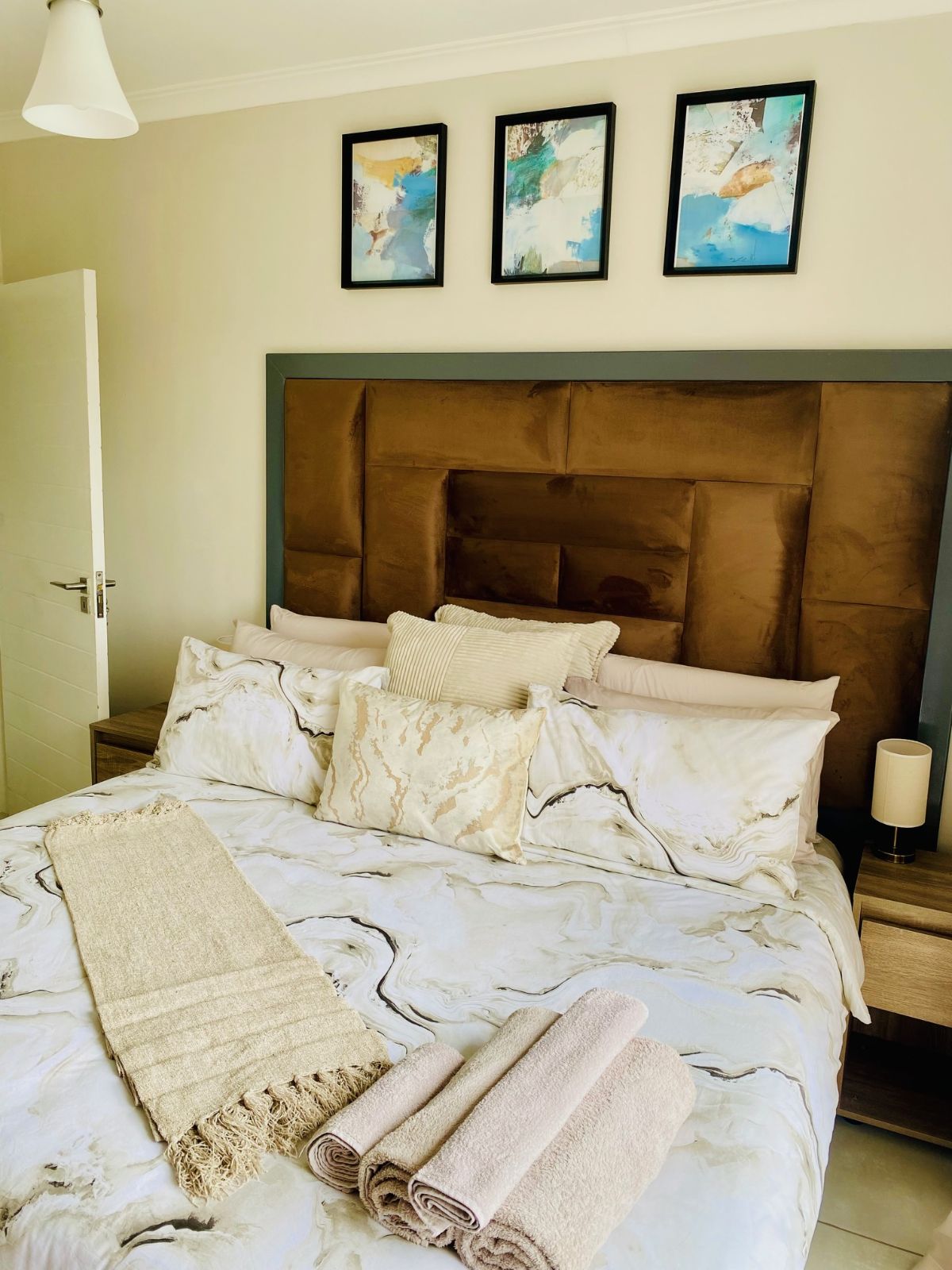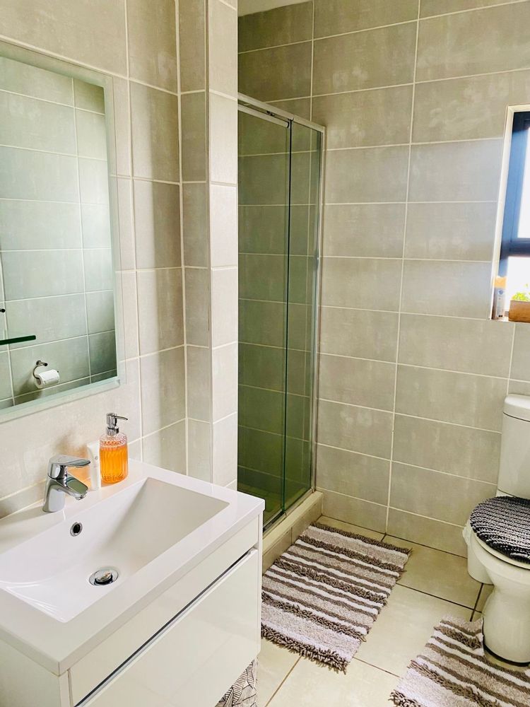 The spacious bedroom offers a plush queen-size bed and a calming retreat-like ambiance, complemented by a modern bathroom fitted with a sleek shower. The apartment operates on prepaid electricity and includes undercover parking for added convenience.
