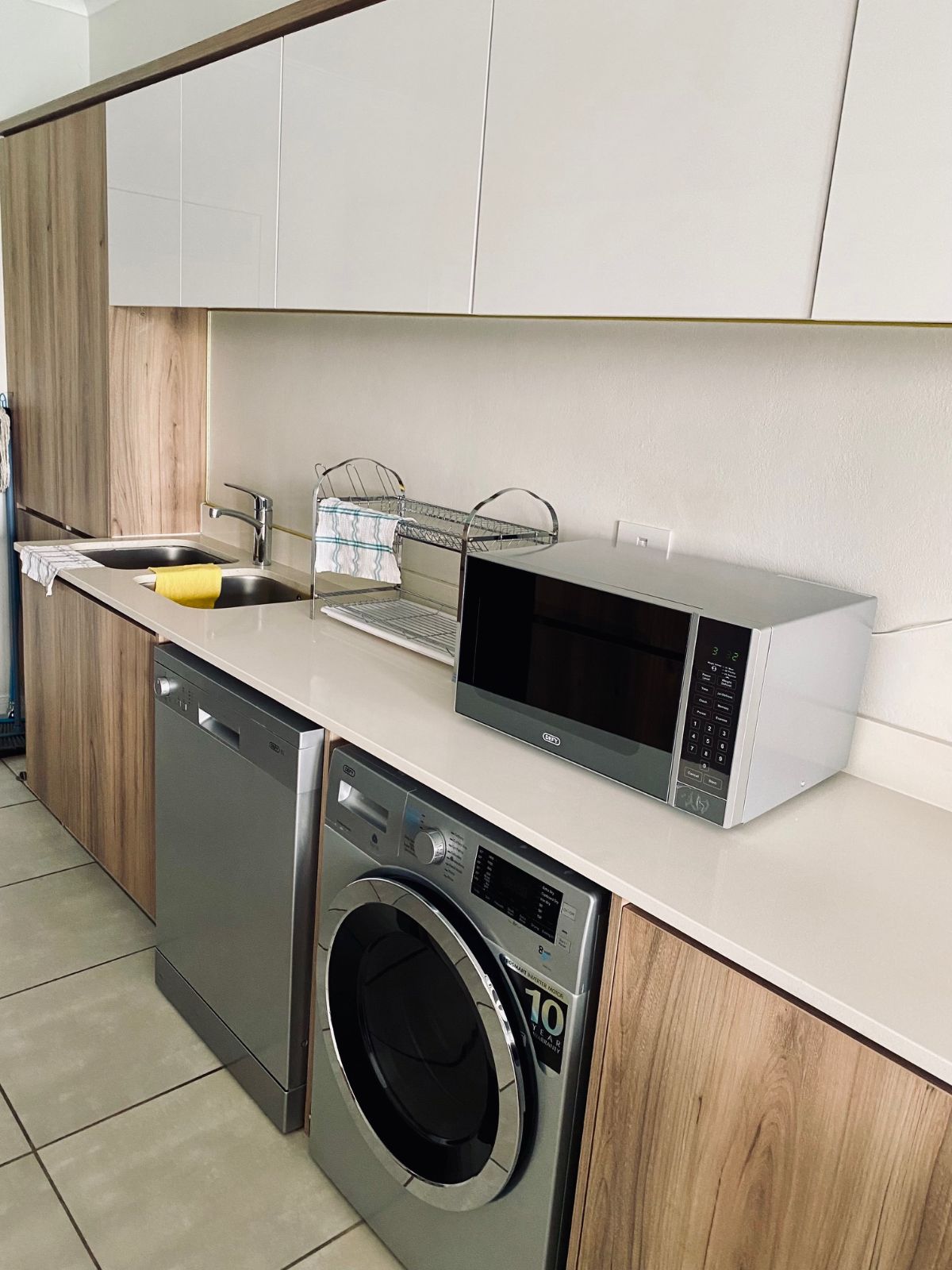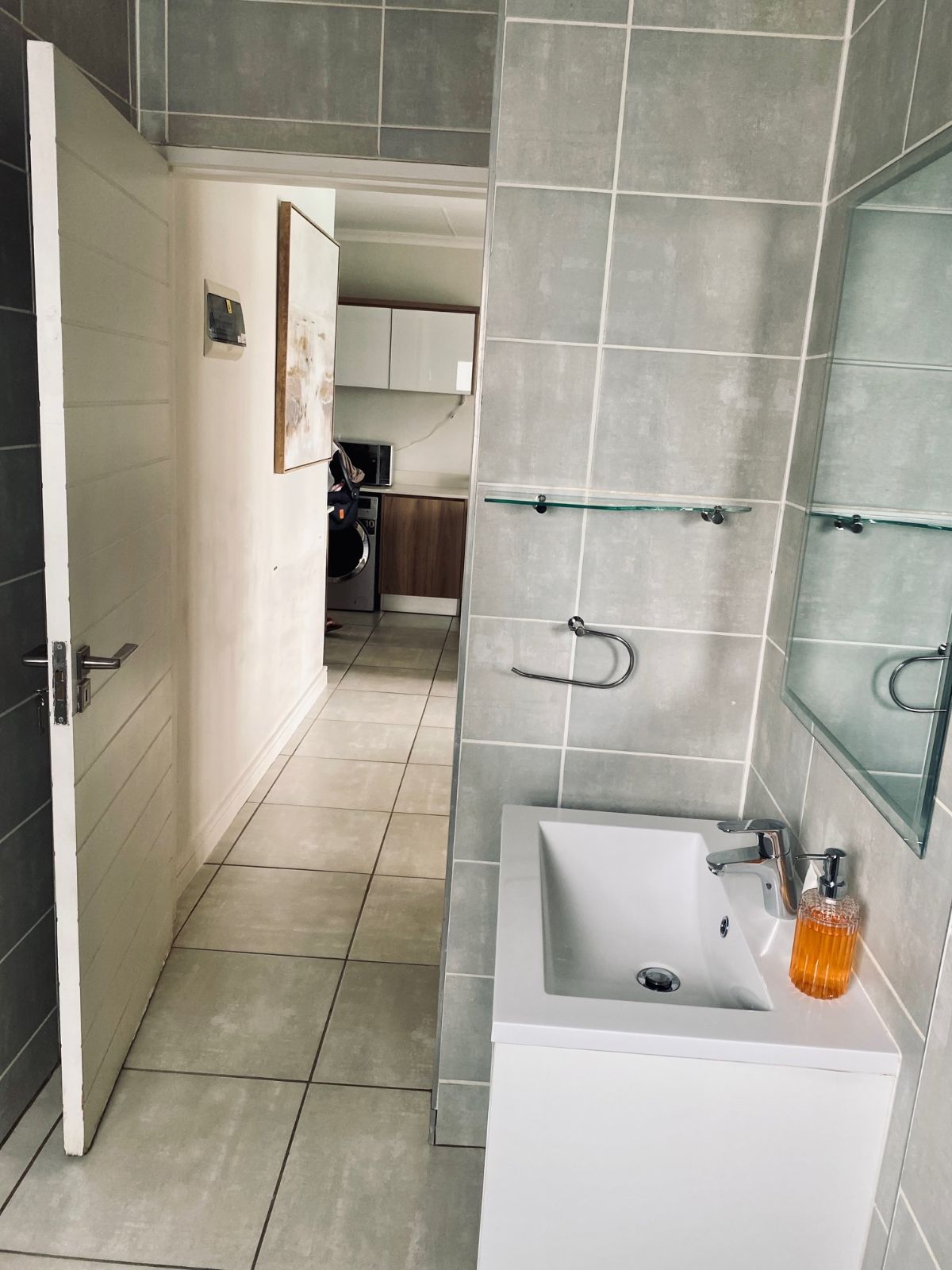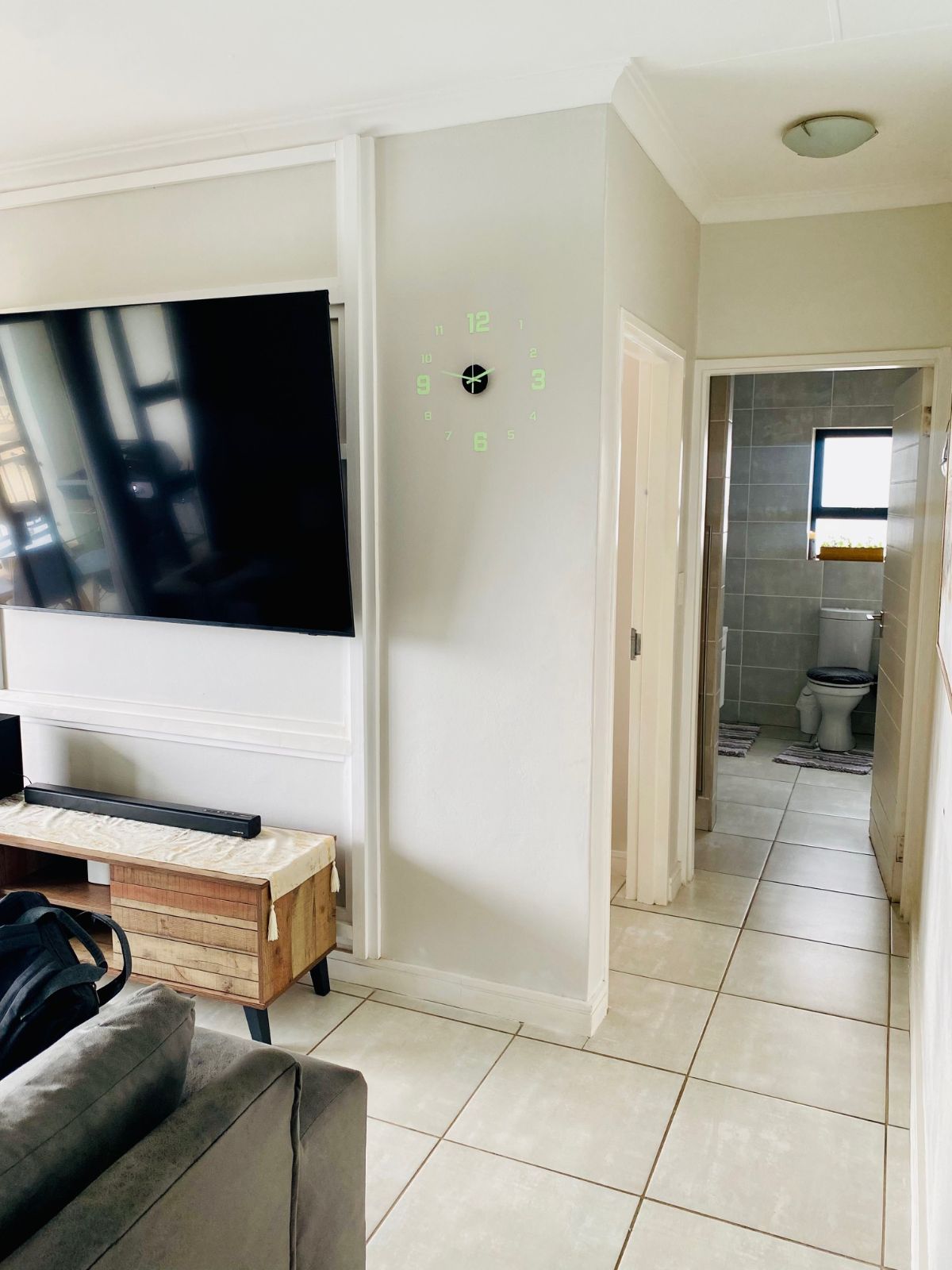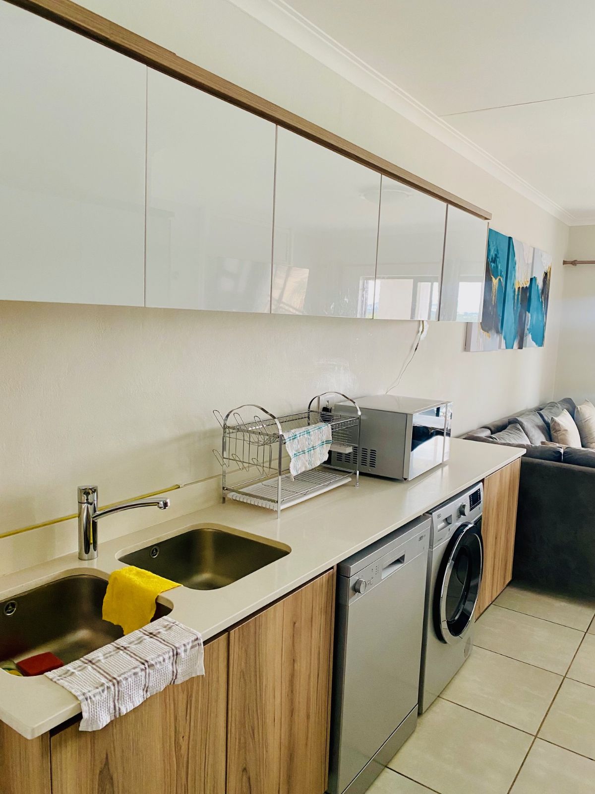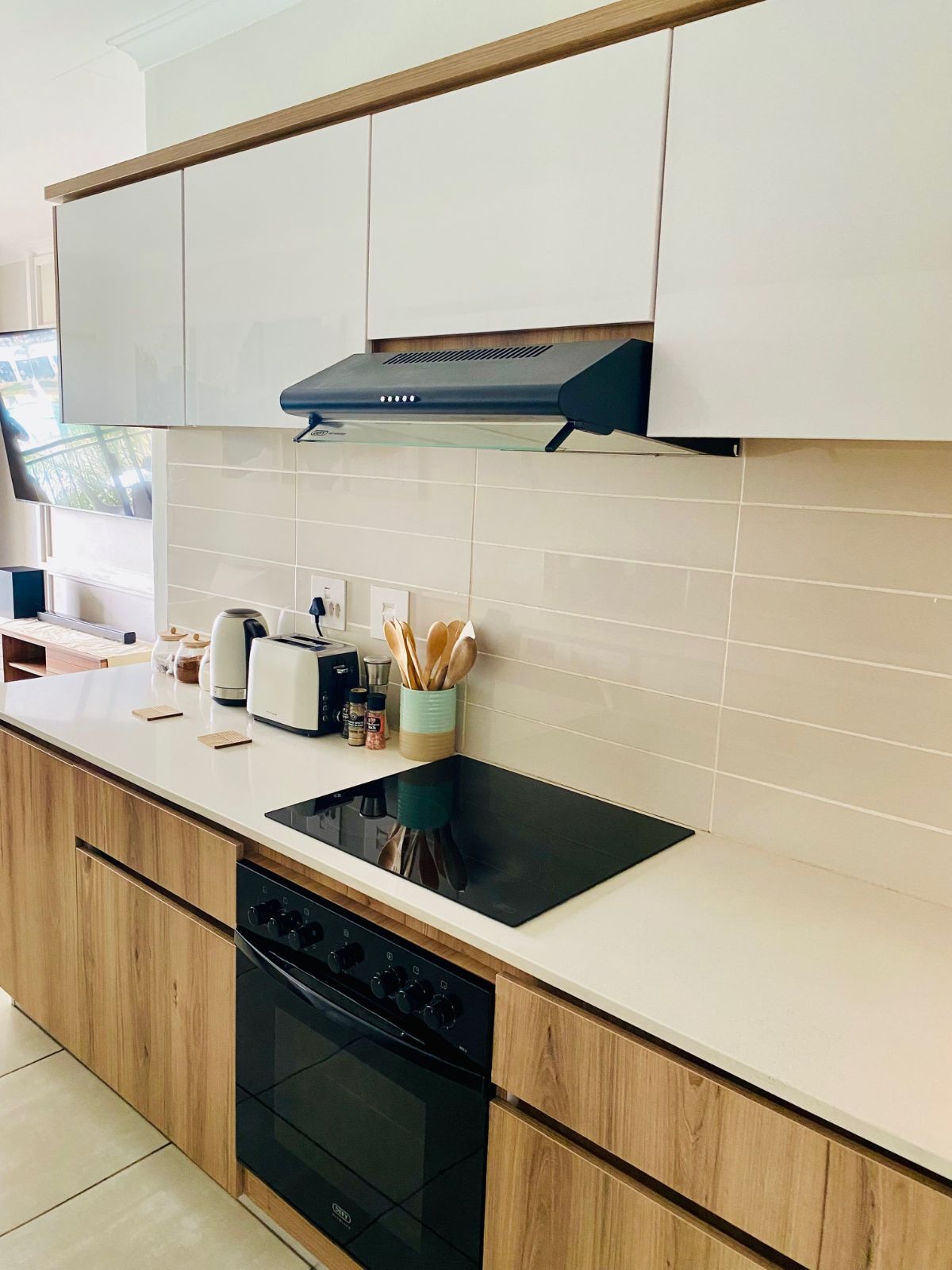 Designed with modern elegance in mind, the open-plan kitchen boasts premium finishes and flows effortlessly into a sophisticated lounge space featuring stylish contemporary furnishings and a sleek wall-mounted flat-screen television. Every detail has been curated for comfort and style.