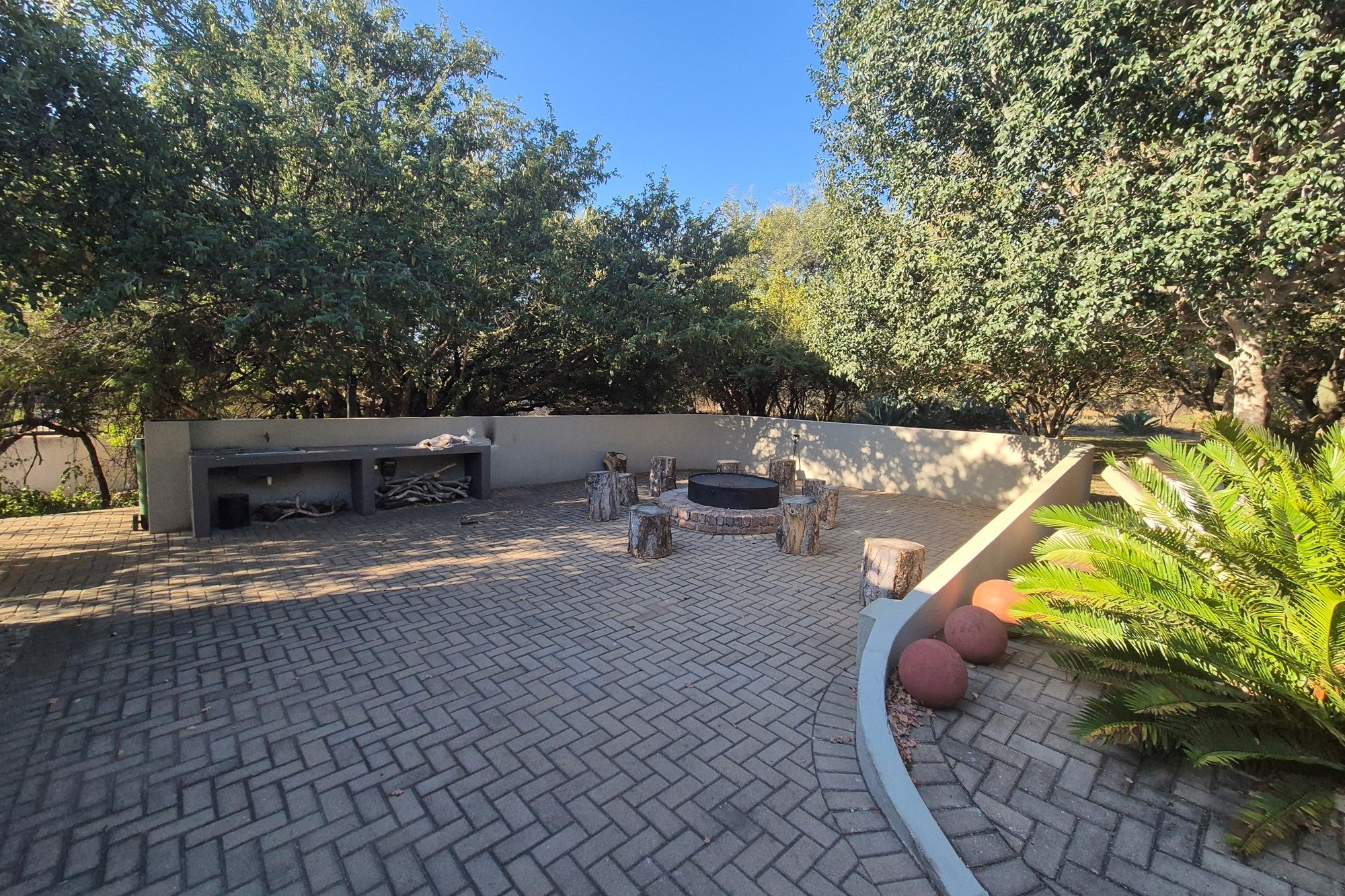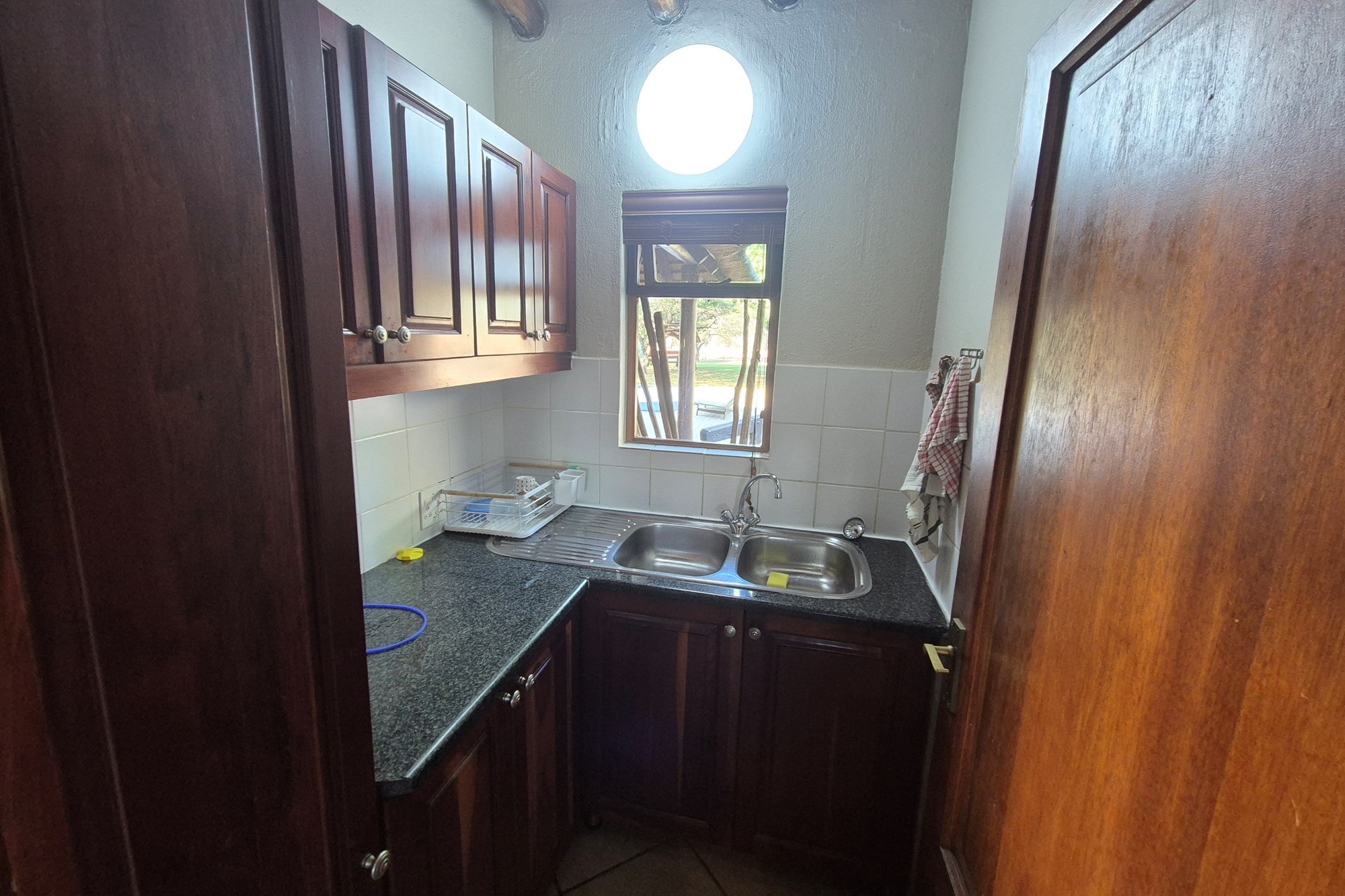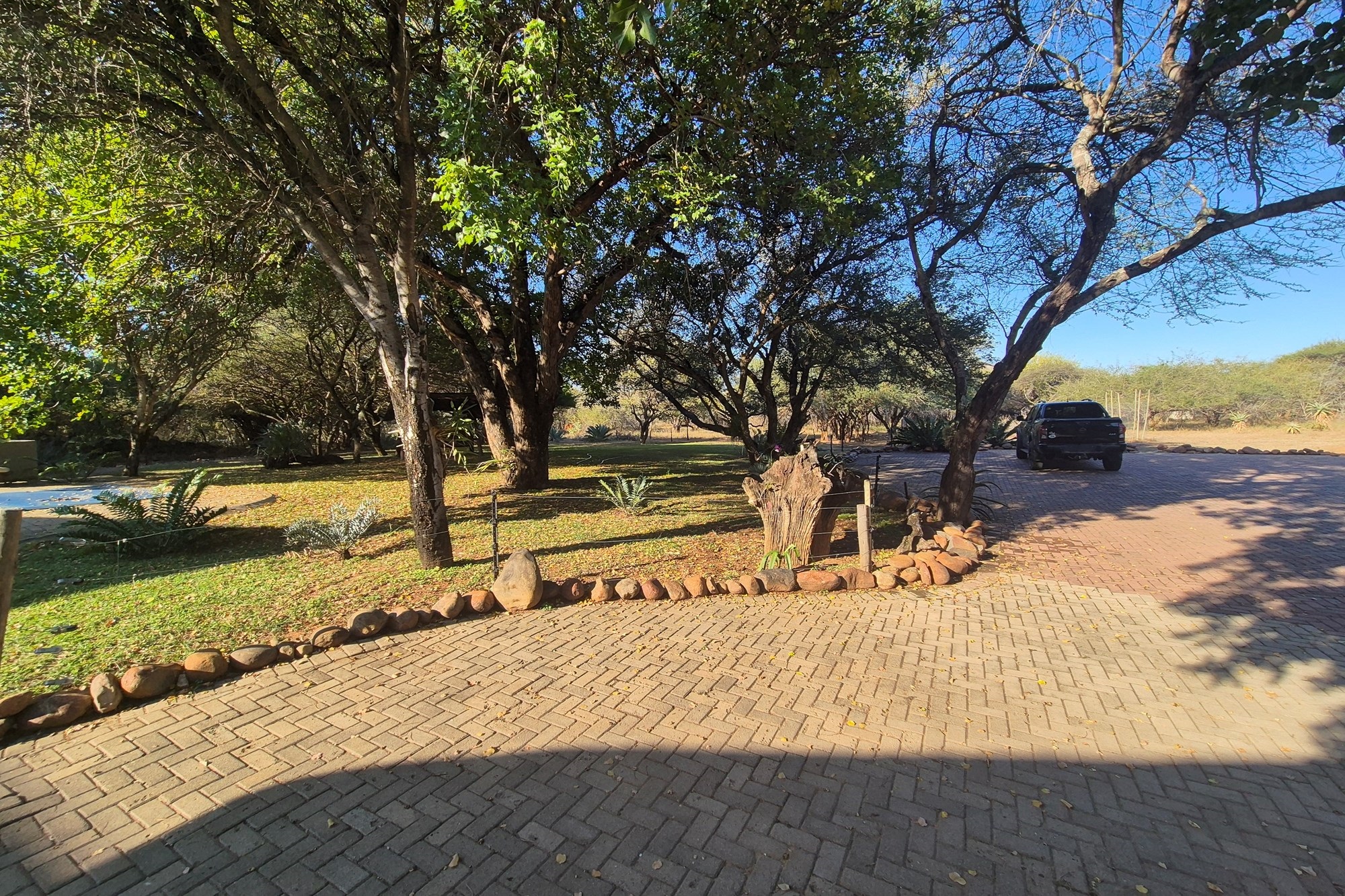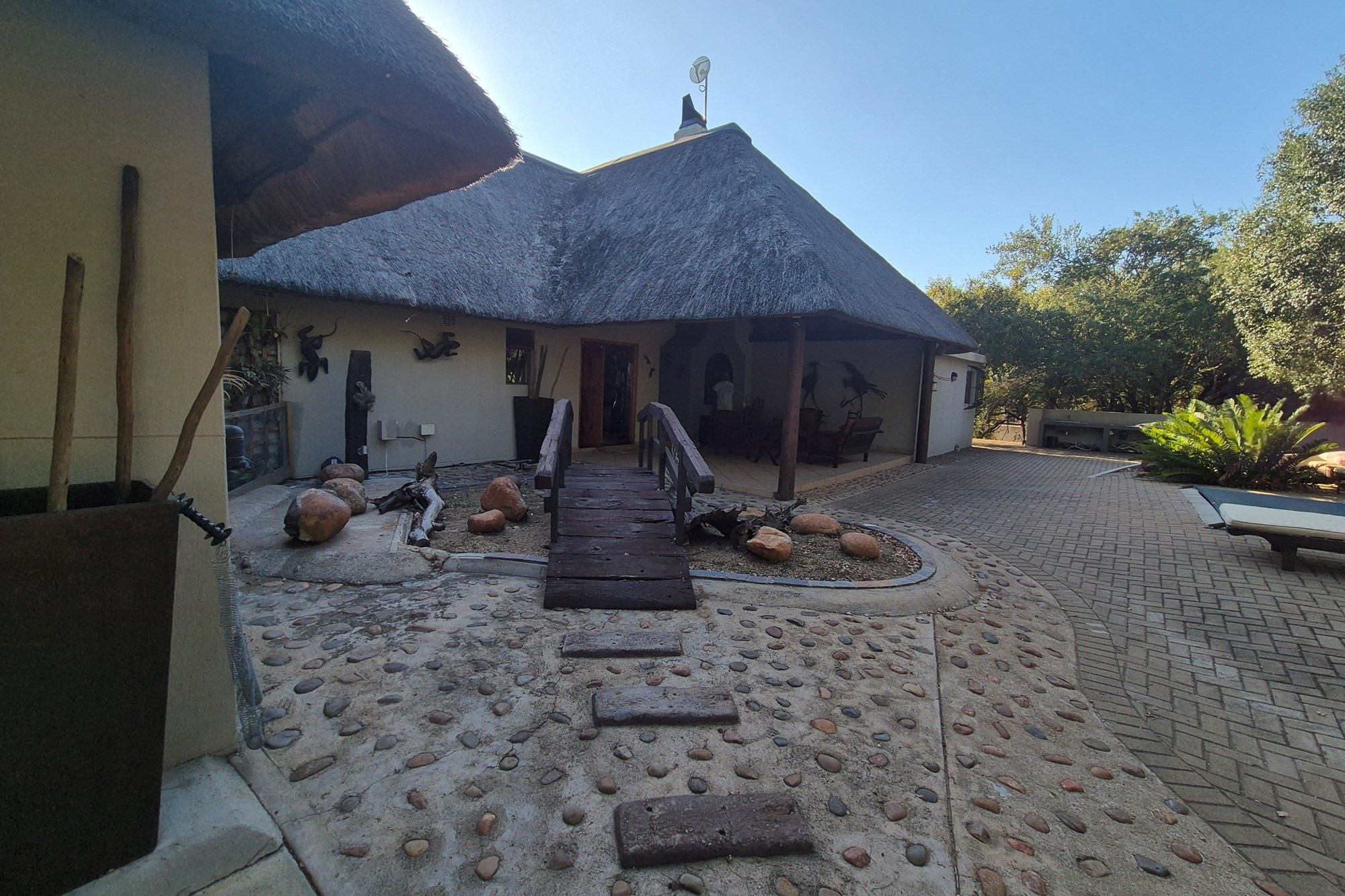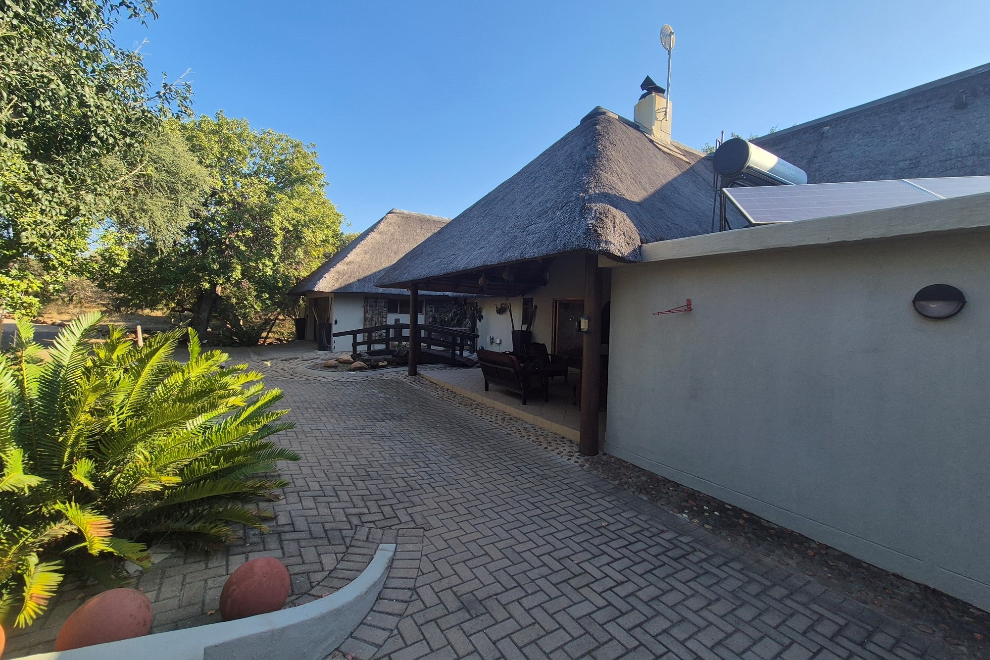 Outside the garden is impressive with wooden steps leading down to a waterhole, frequented by all plains game surrounded by riverine vegetation. In front garden is an extra large pool ,big boma with concrete seating, paved area for five cars and double lock-up garage. The garden exhibits a caring hand with lush green grass and indigenous plants. Solar power and a 5000l water tank rounds off this gem of a home, suitable as permanent residence or perfect holiday home. Ideal as an investment as letting of properties is popular in the Estate.