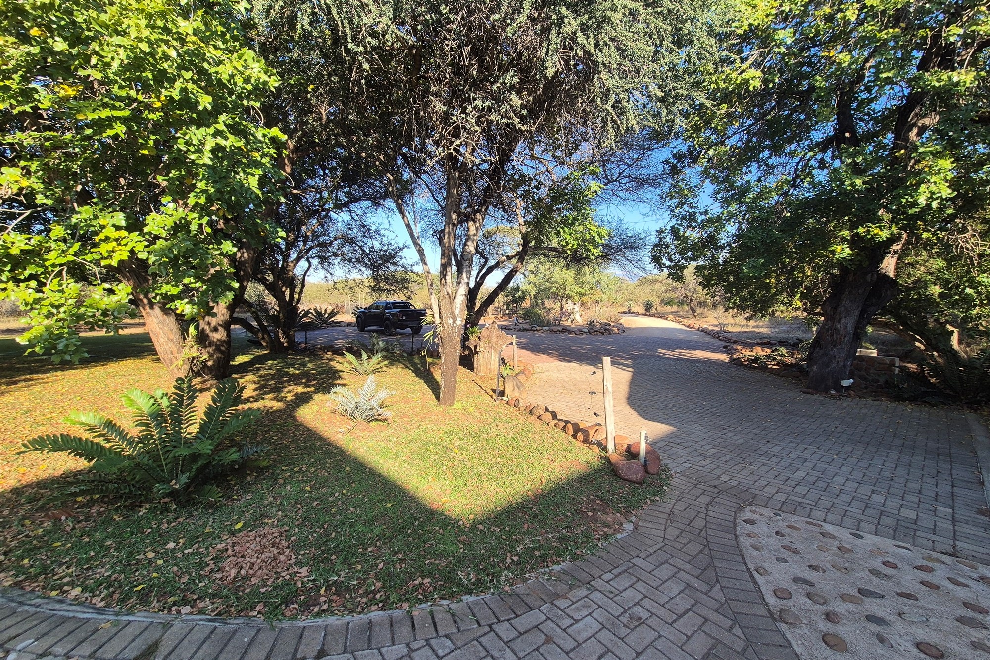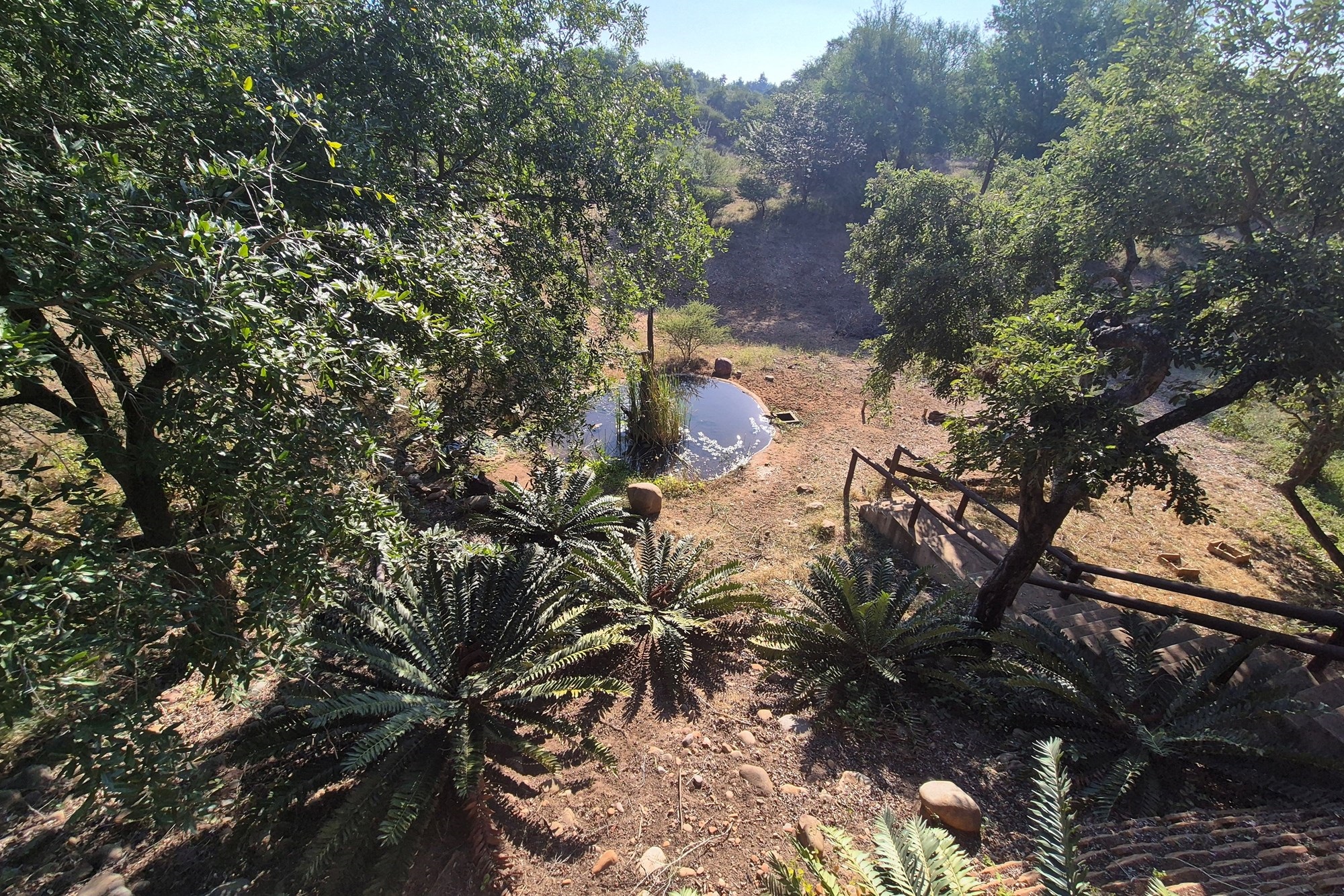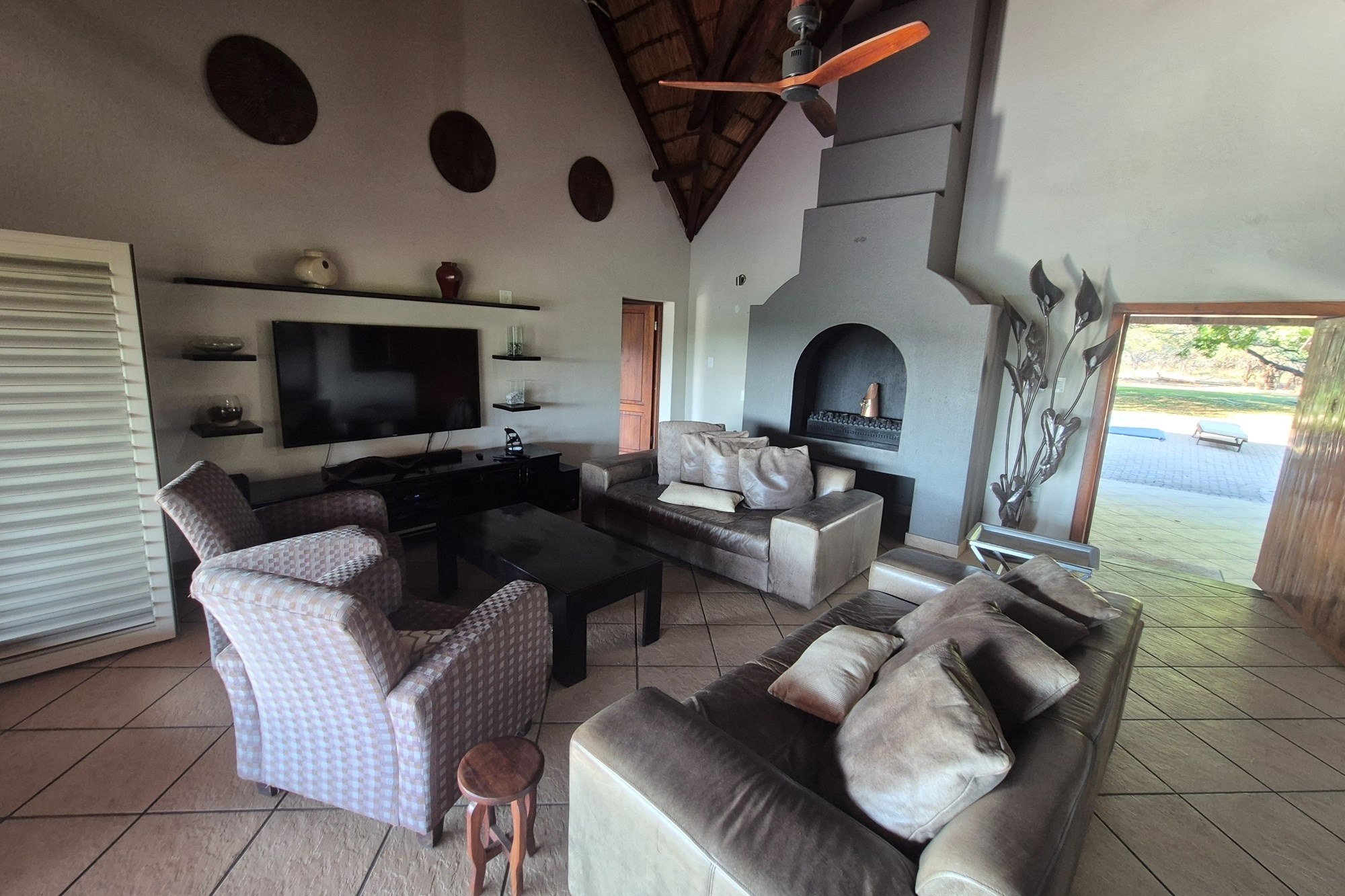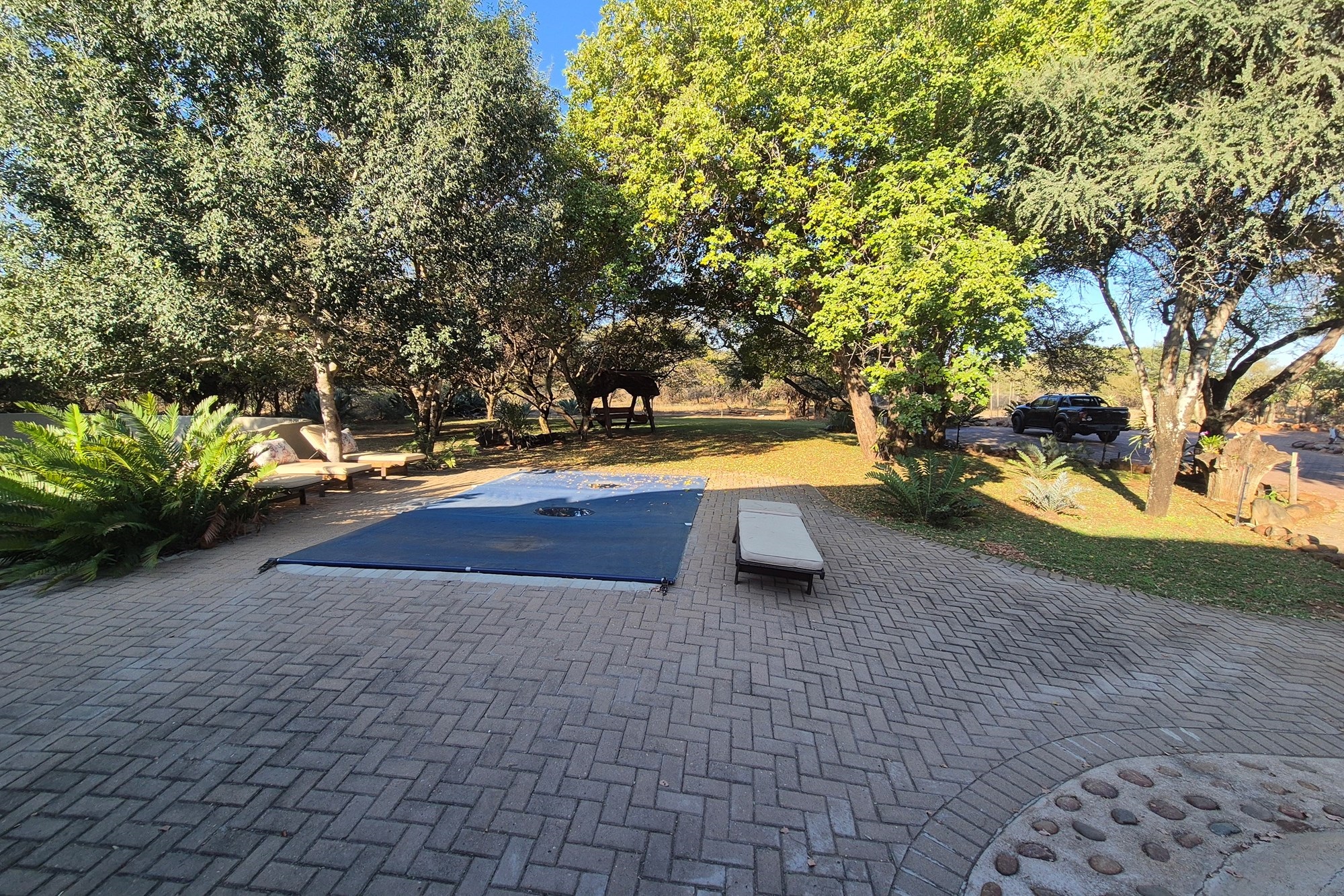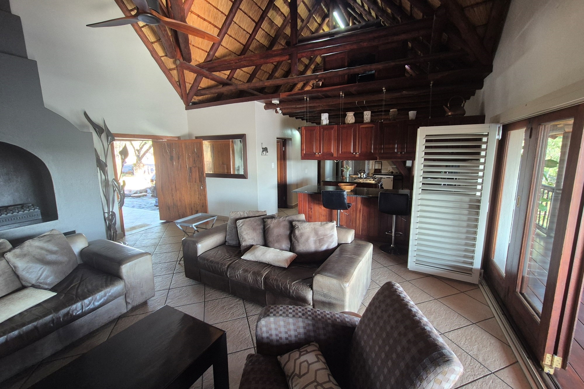 Outside the garden is impressive with wooden steps leading down to a waterhole, frequented by all plains game surrounded by riverine vegetation. In front garden is an extra large pool ,big boma with concrete seating, paved area for five cars and double lock-up garage. The garden exhibits a caring hand with lush green grass and indigenous plants. Solar power and a 5000l water tank rounds off this gem of a home, suitable as permanent residence or perfect holiday home. Ideal as an investment as letting of properties is popular in the Estate.