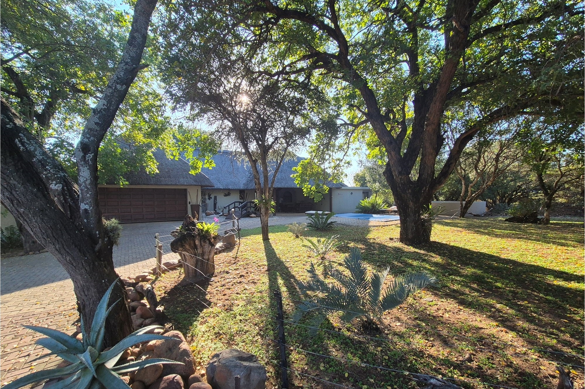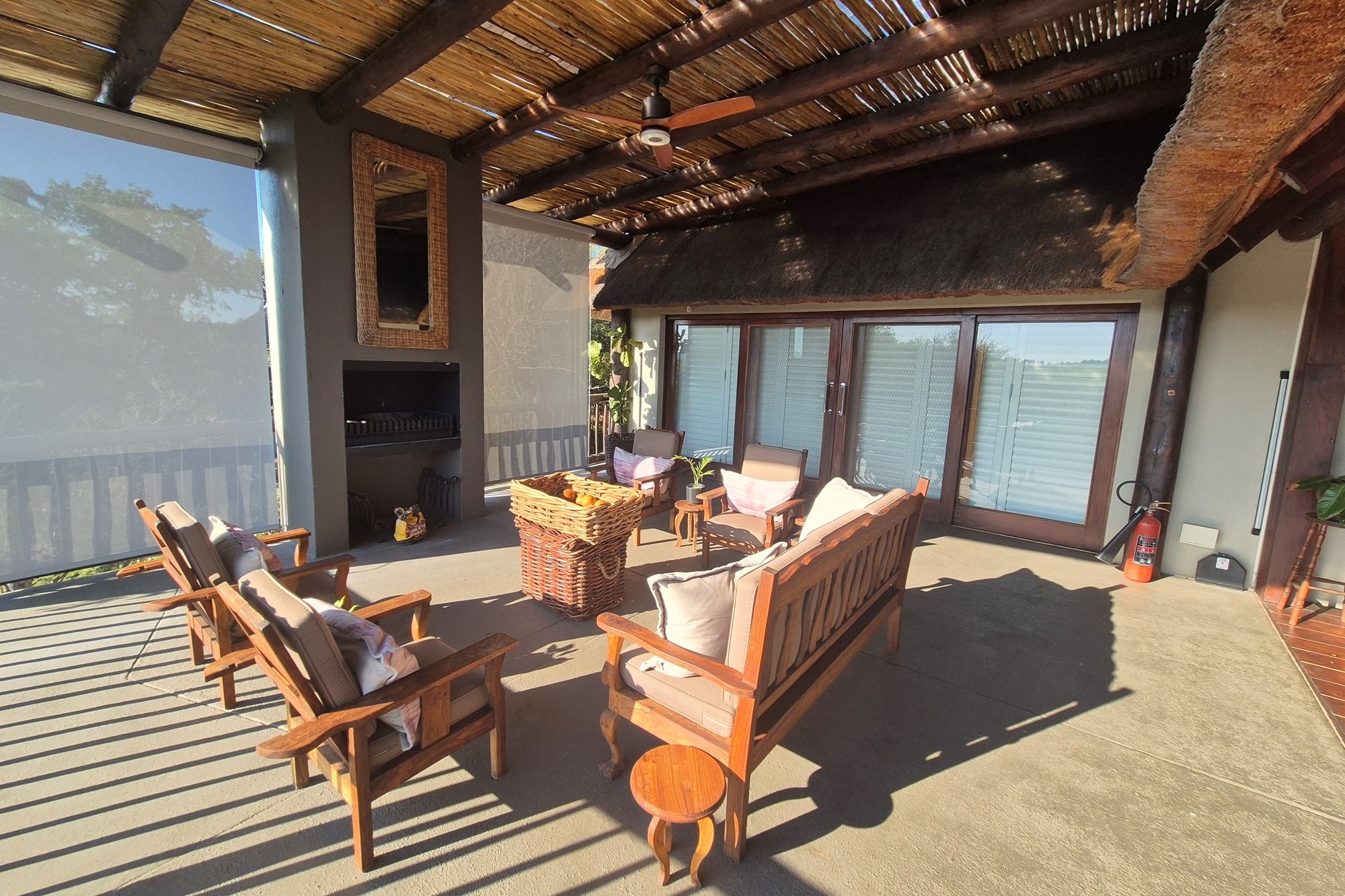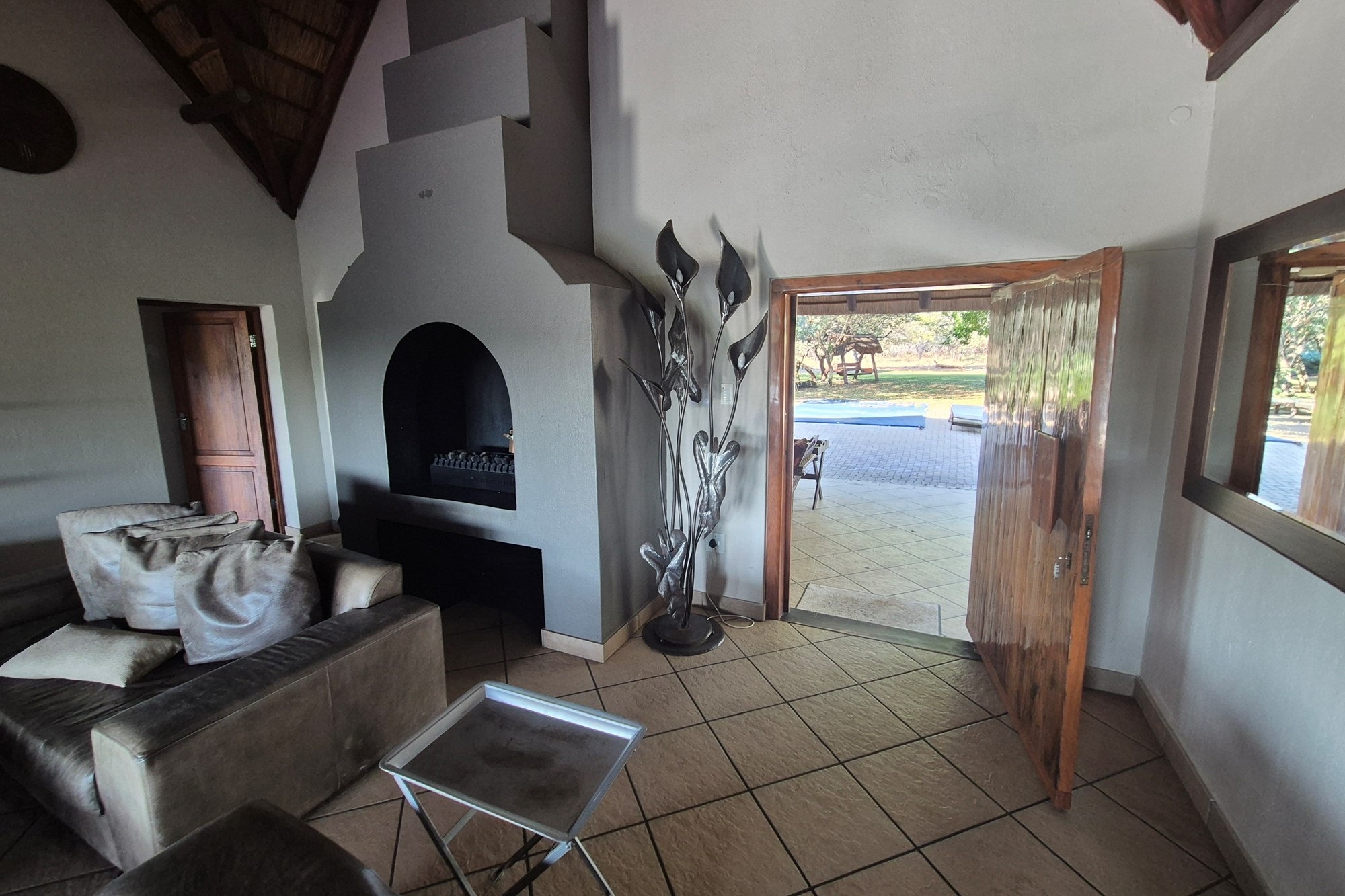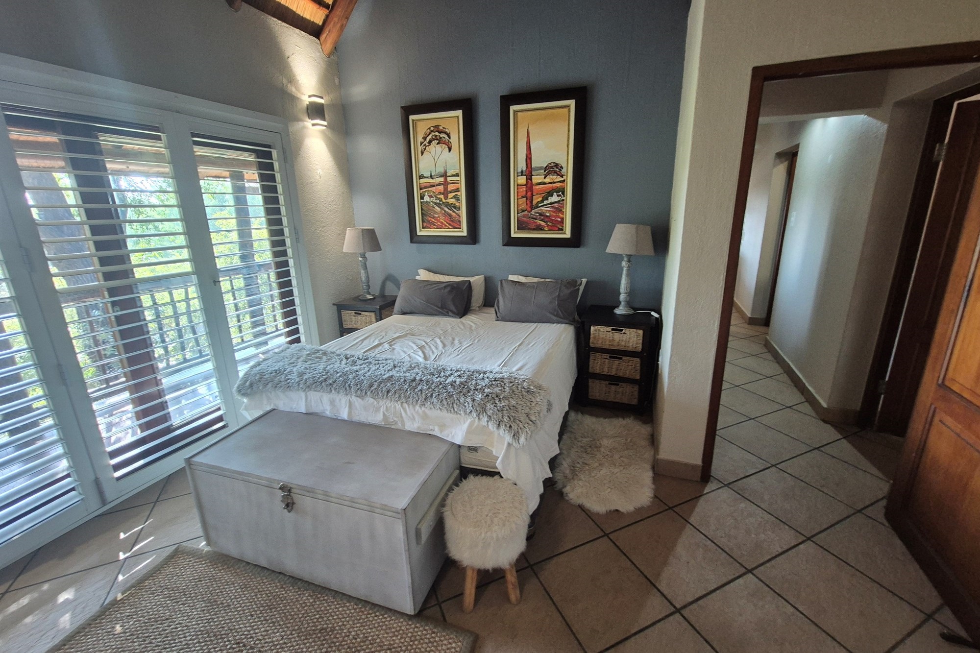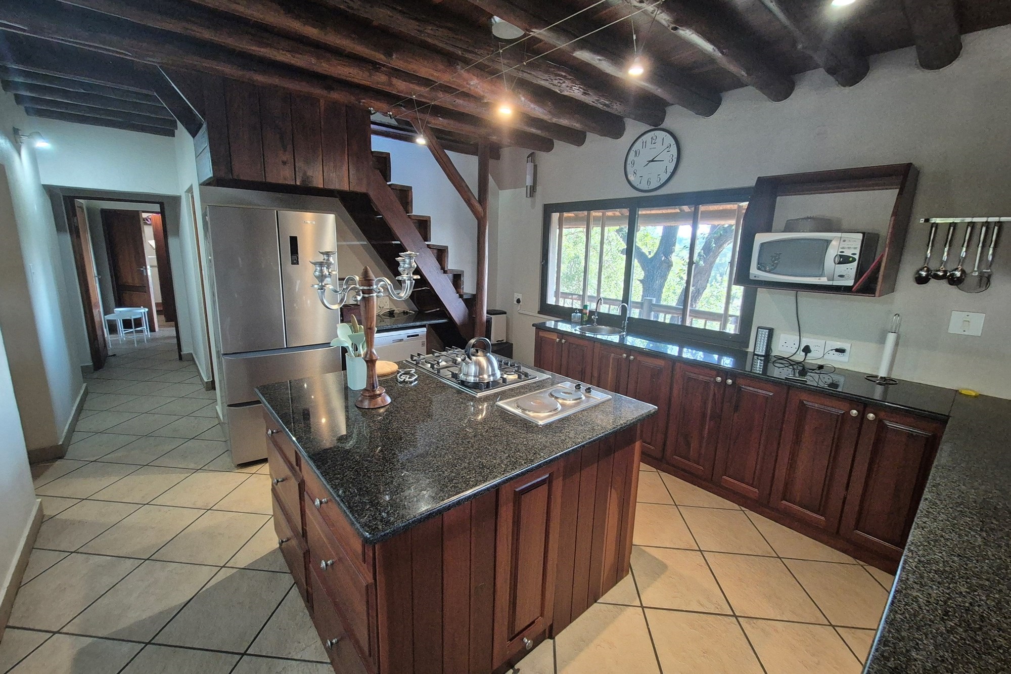 Outside the garden is impressive with wooden steps leading down to a waterhole, frequented by all plains game surrounded by riverine vegetation. In front garden is an extra large pool ,big boma with concrete seating, paved area for five cars and double lock-up garage. The garden exhibits a caring hand with lush green grass and indigenous plants. Solar power and a 5000l water tank rounds off this gem of a home, suitable as permanent residence or perfect holiday home. Ideal as an investment as letting of properties is popular in the Estate.
