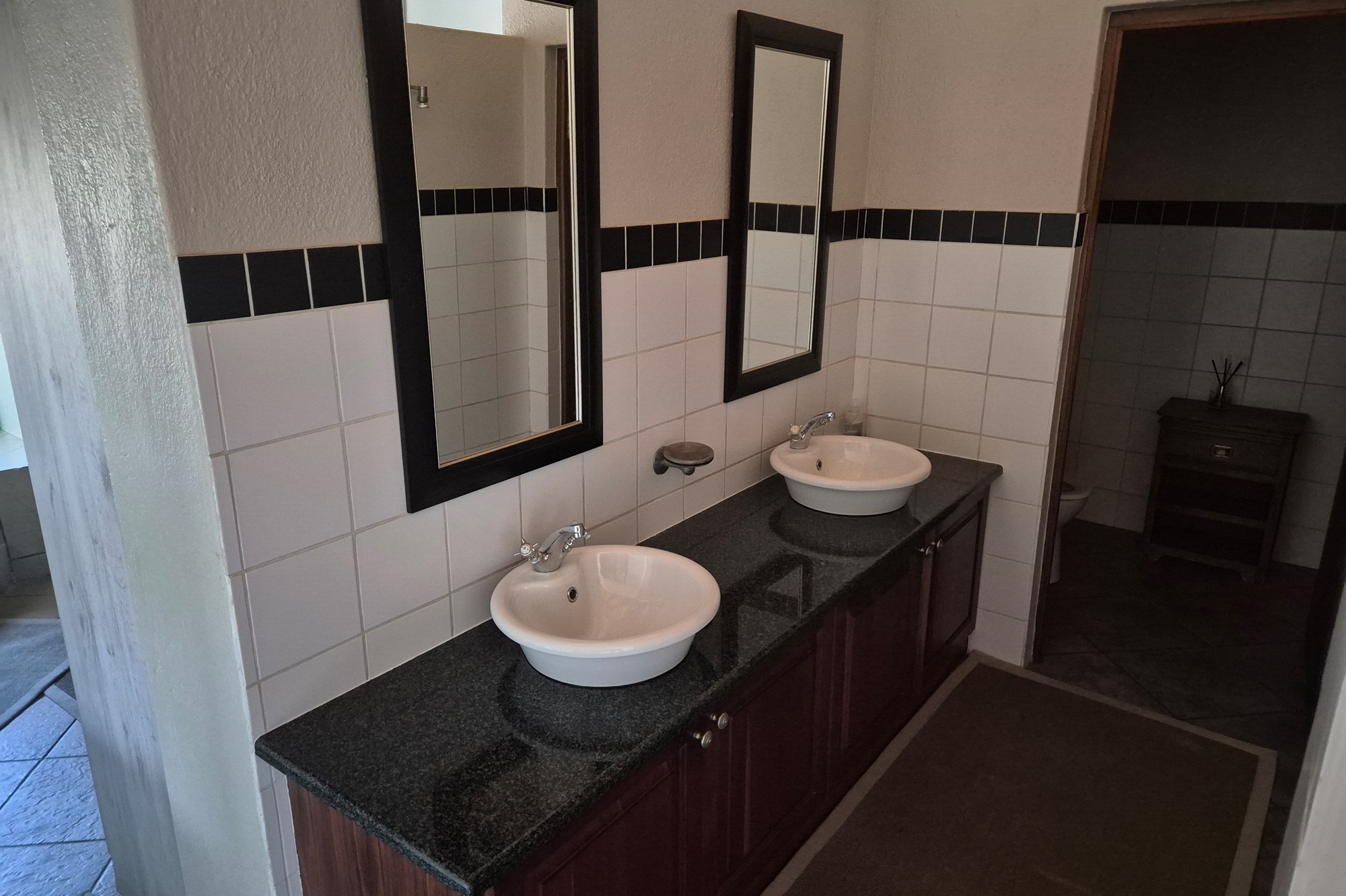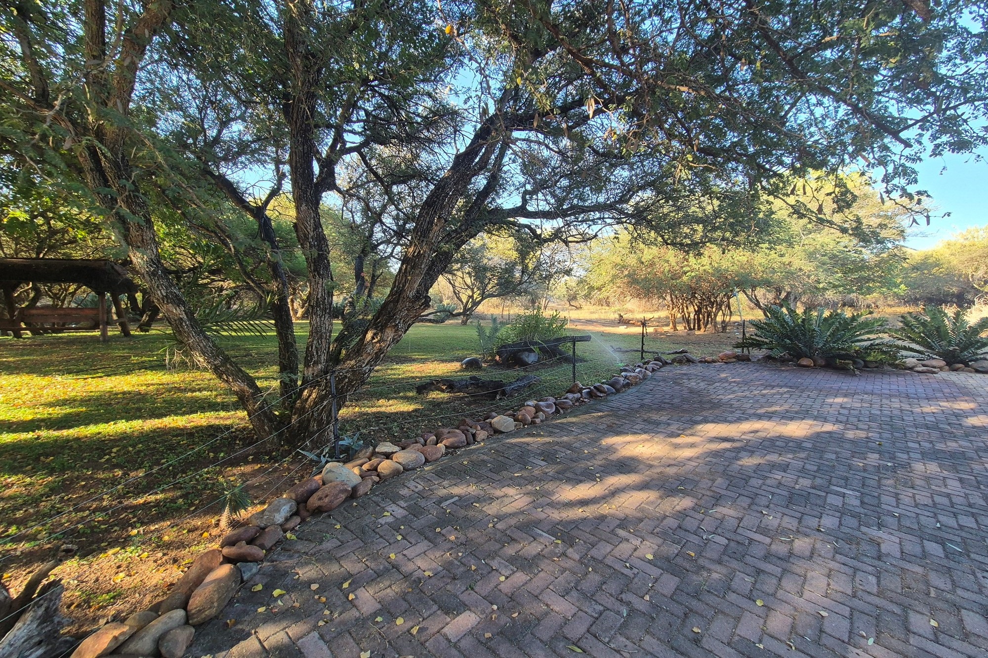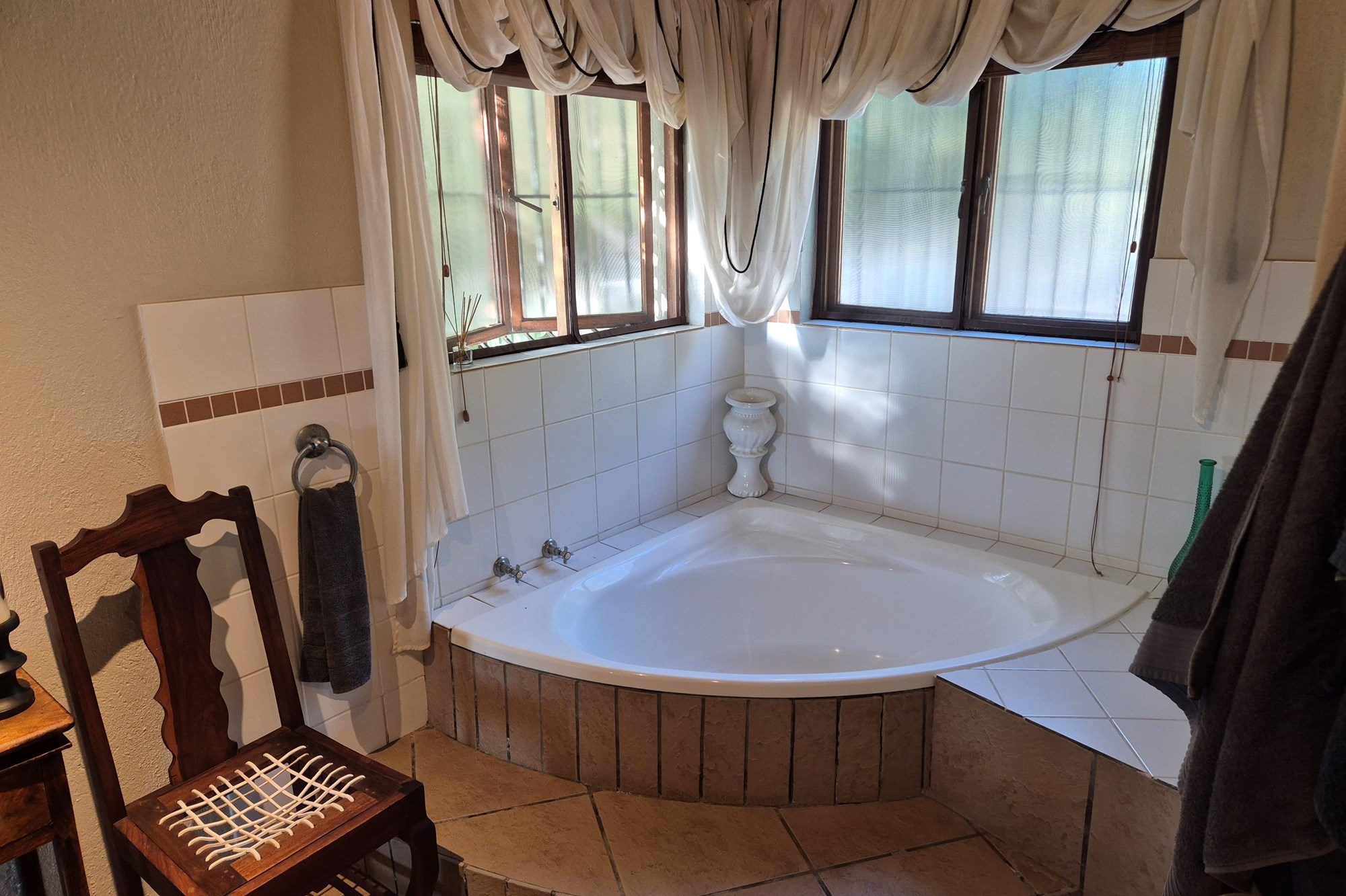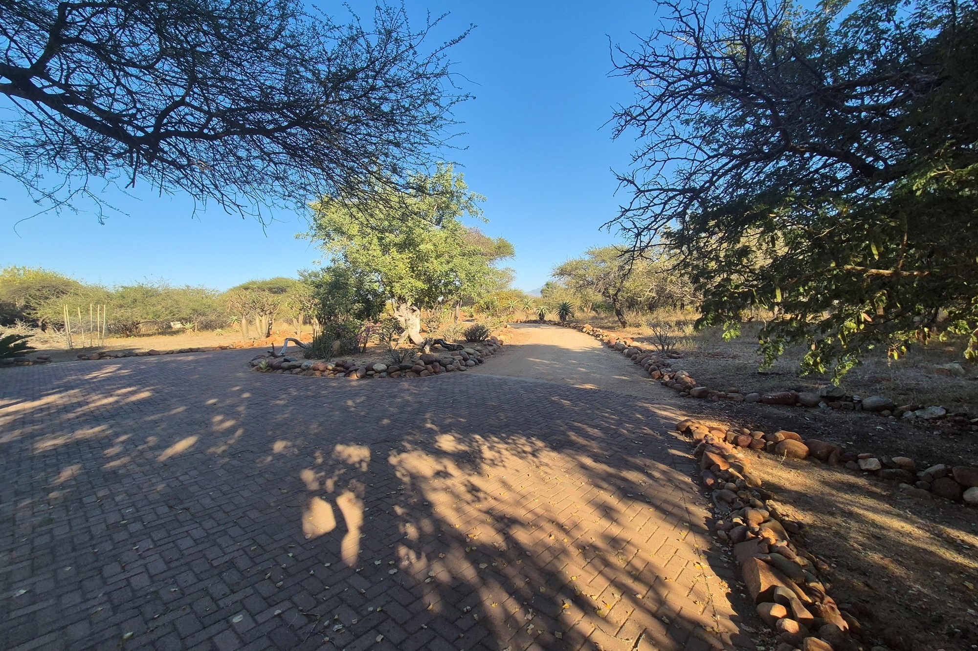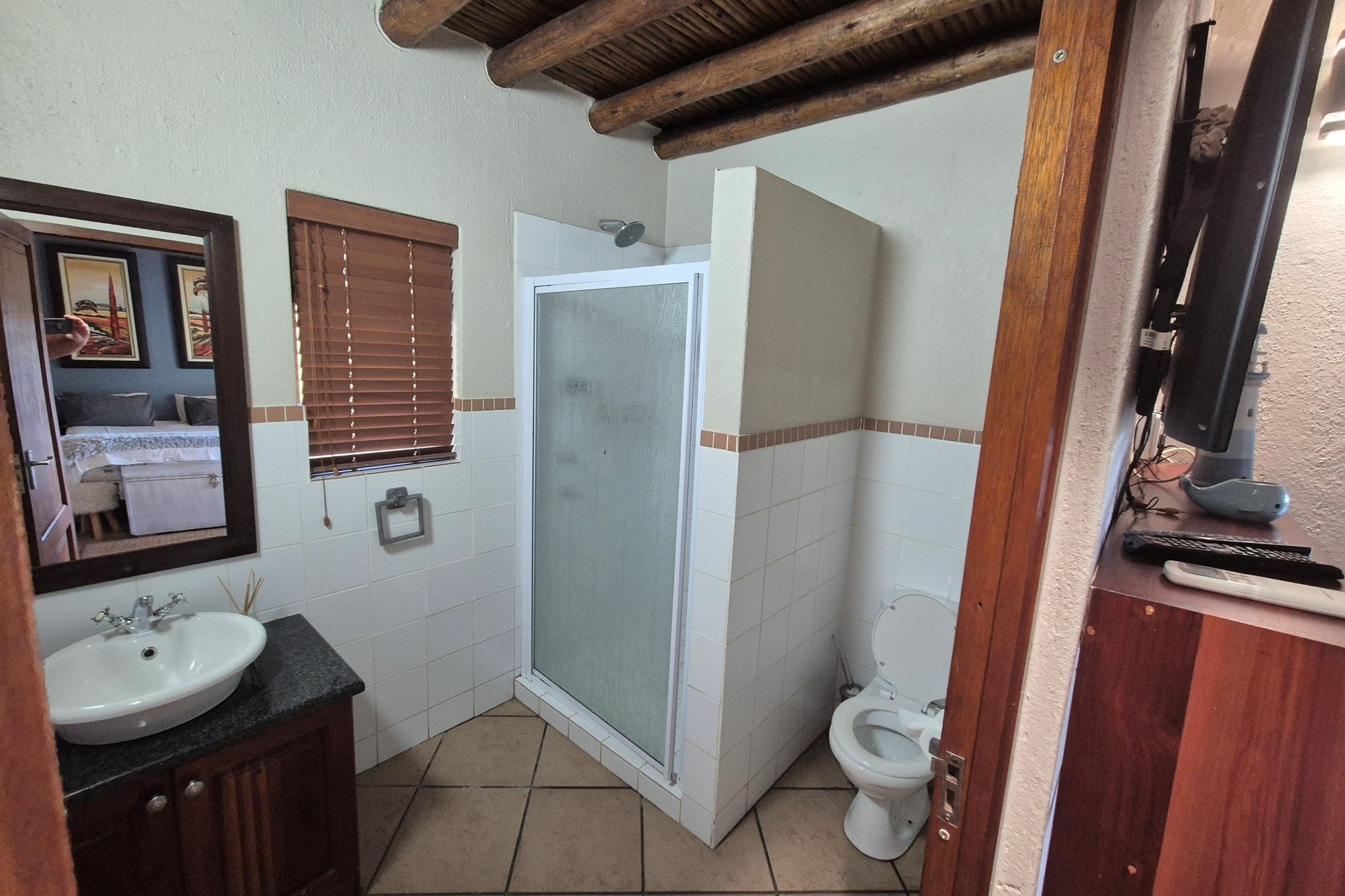 Outside the garden is impressive with wooden steps leading down to a waterhole, frequented by all plains game surrounded by riverine vegetation. In front garden is an extra large pool ,big boma with concrete seating, paved area for five cars and double lock-up garage. The garden exhibits a caring hand with lush green grass and indigenous plants. Solar power and a 5000l water tank rounds off this gem of a home, suitable as permanent residence or perfect holiday home. Ideal as an investment as letting of properties is popular in the Estate.