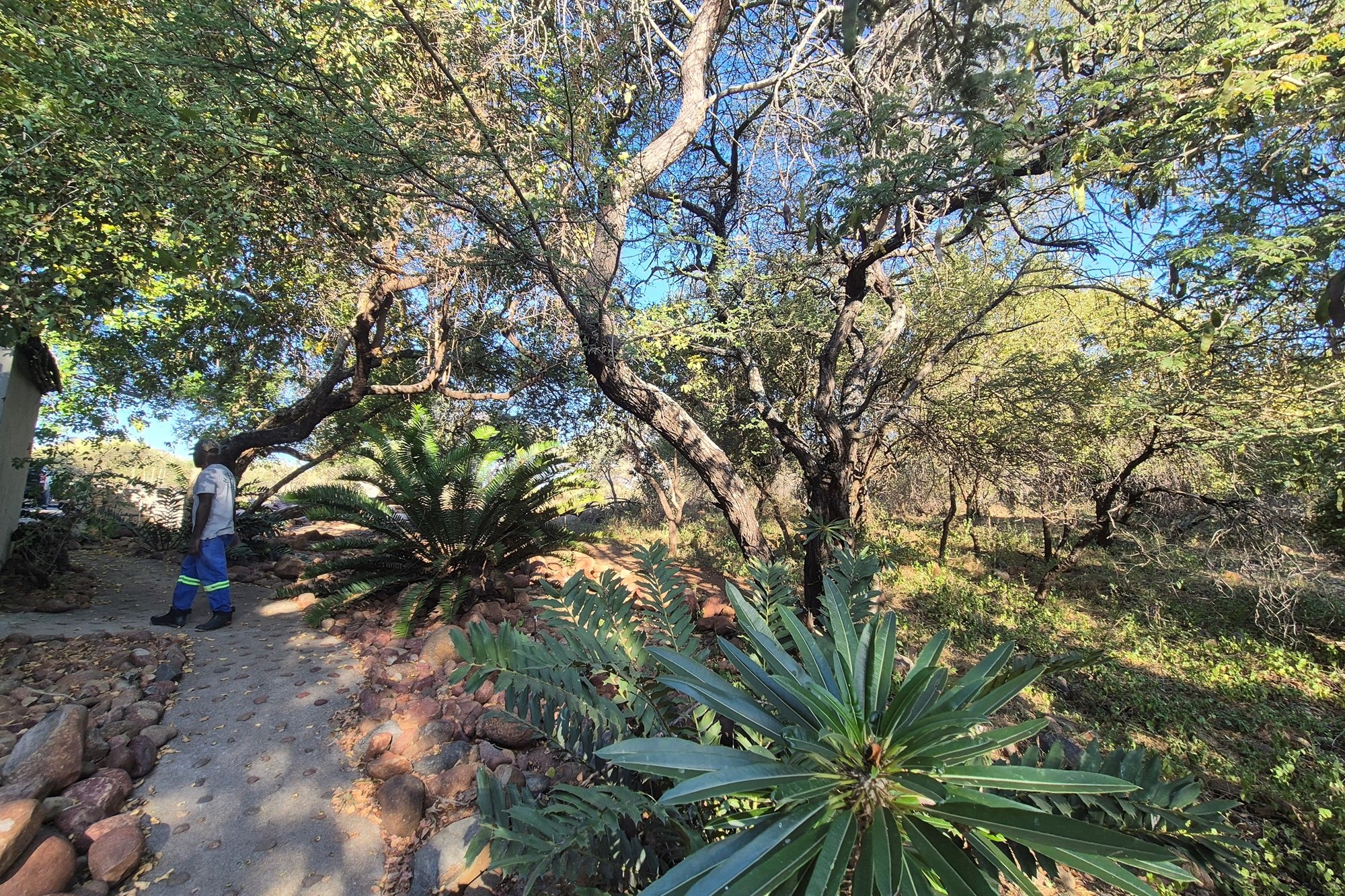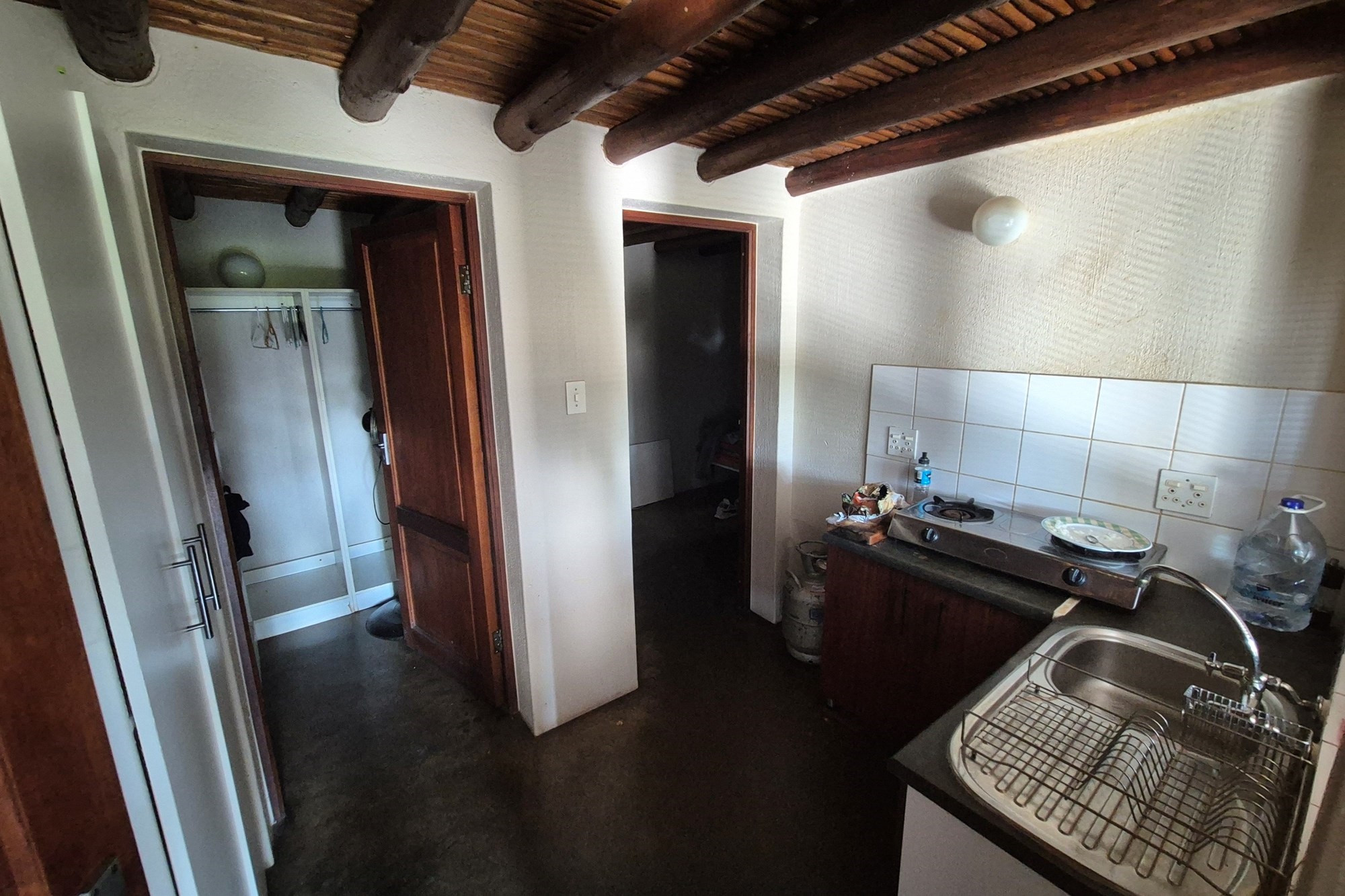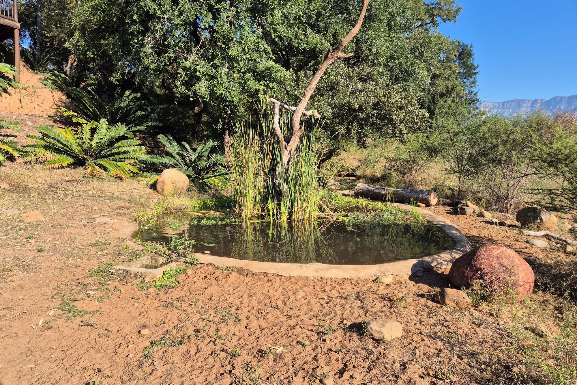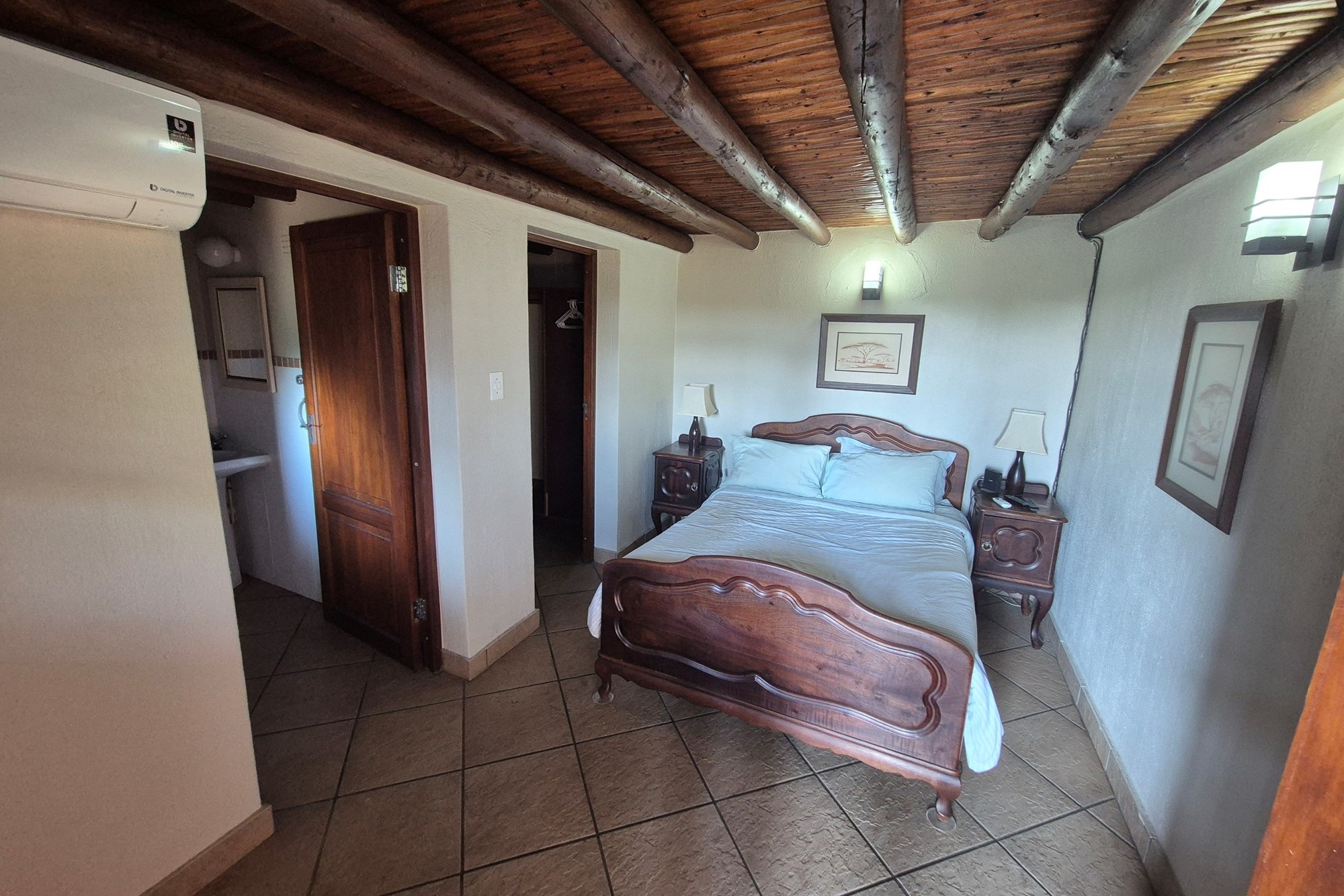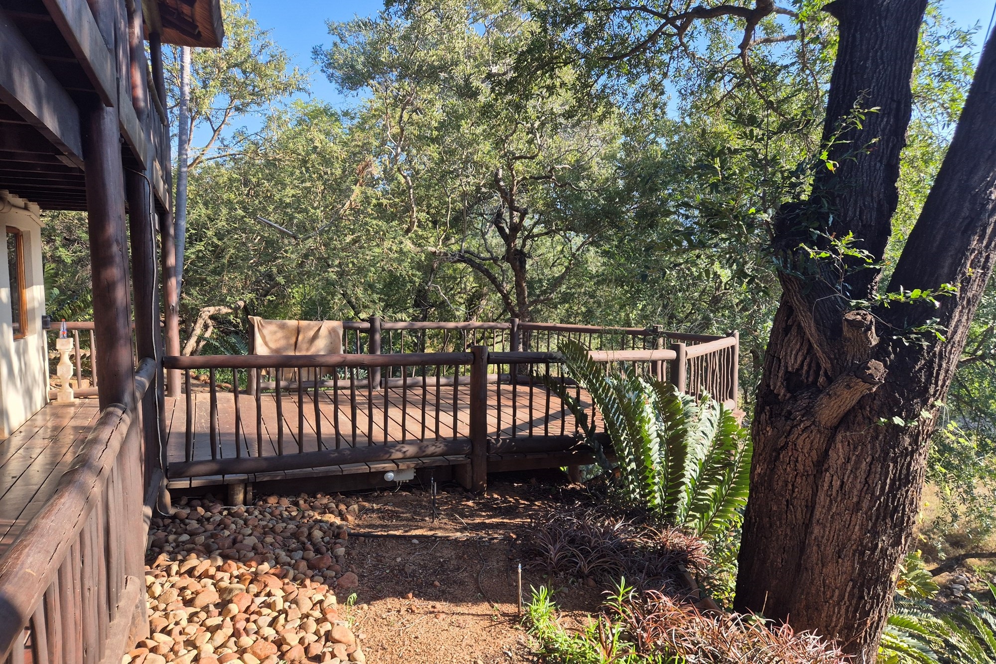 Outside the garden is impressive with wooden steps leading down to a waterhole, frequented by all plains game surrounded by riverine vegetation. In front garden is an extra large pool ,big boma with concrete seating, paved area for five cars and double lock-up garage. The garden exhibits a caring hand with lush green grass and indigenous plants. Solar power and a 5000l water tank rounds off this gem of a home, suitable as permanent residence or perfect holiday home. Ideal as an investment as letting of properties is popular in the Estate.