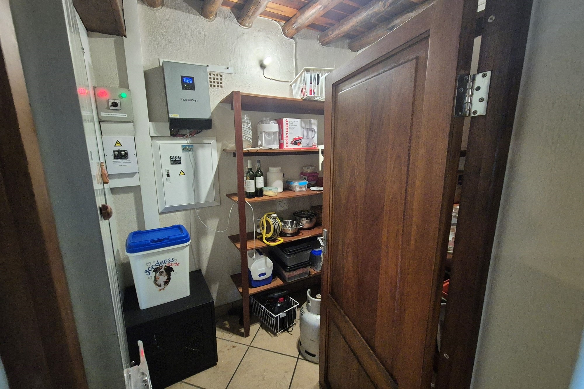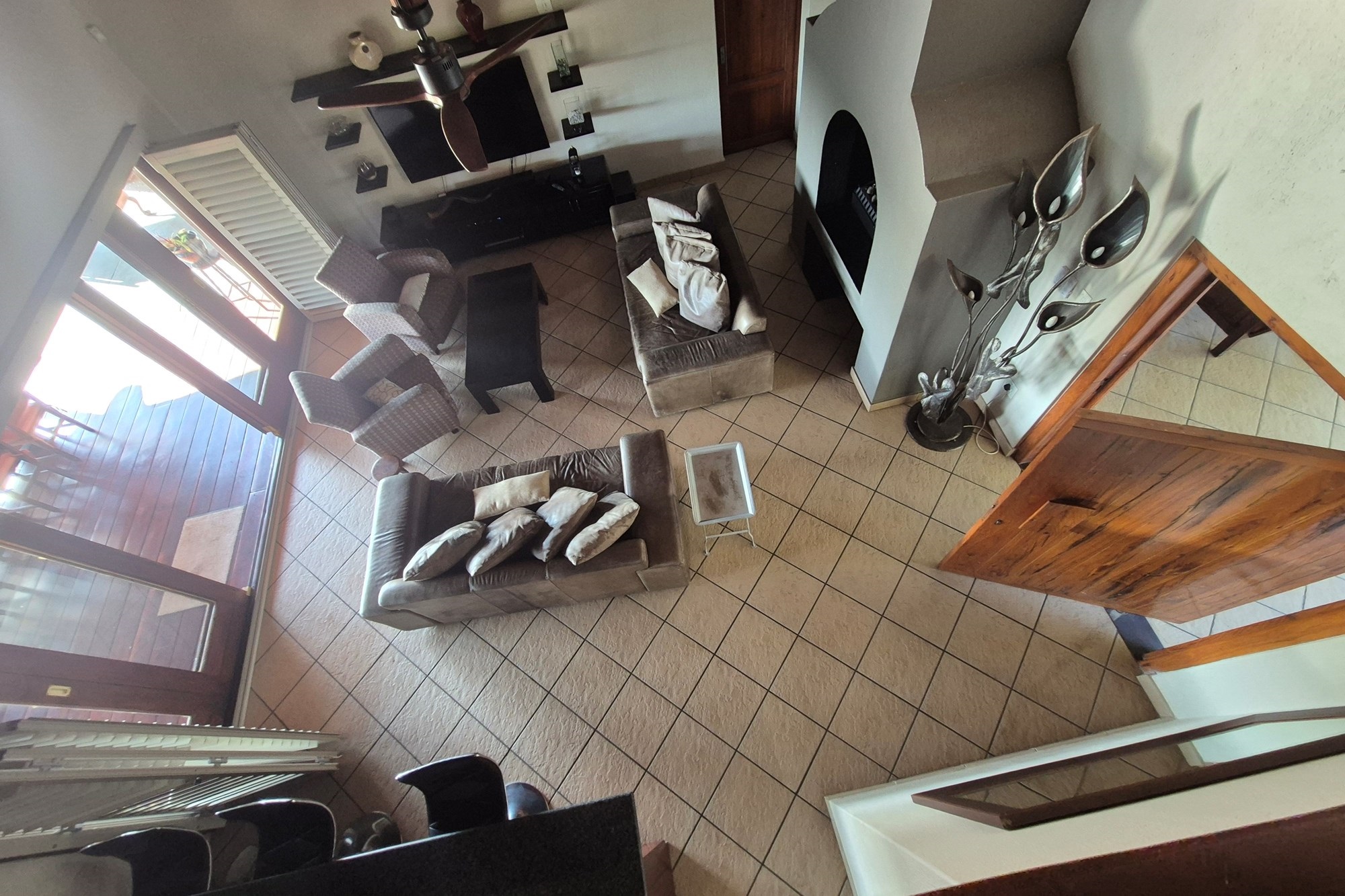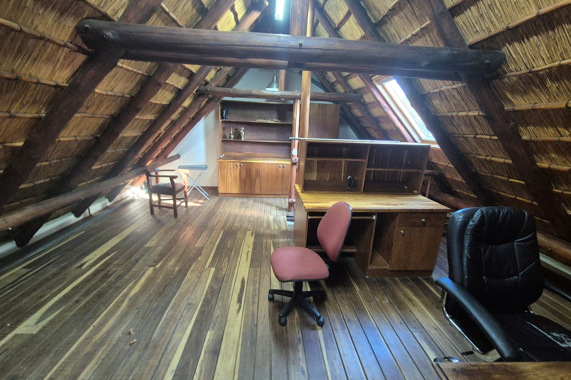 Built on two levels it has four bedrooms of which three are en-suite; all opening up with sliding doors onto the veranda, pool and entertainment area. Main bedroom is massive with ample cupboards for clothes and other with open mountain views, wooden blinds rounds off this very spacious room. The other rooms are spacious, plenty wooden cupboard space with tiled flooring, projecting a cozy atmosphere. The open plan Kitchen is fully equipped with scullery, washing area, wooden cupboards, tiled flooring and walk-in cooler room. The loft above is ideal as study or entertainment area. The living area is open plan with lounge and dining area with fireplace which accentuates an artistic feel.