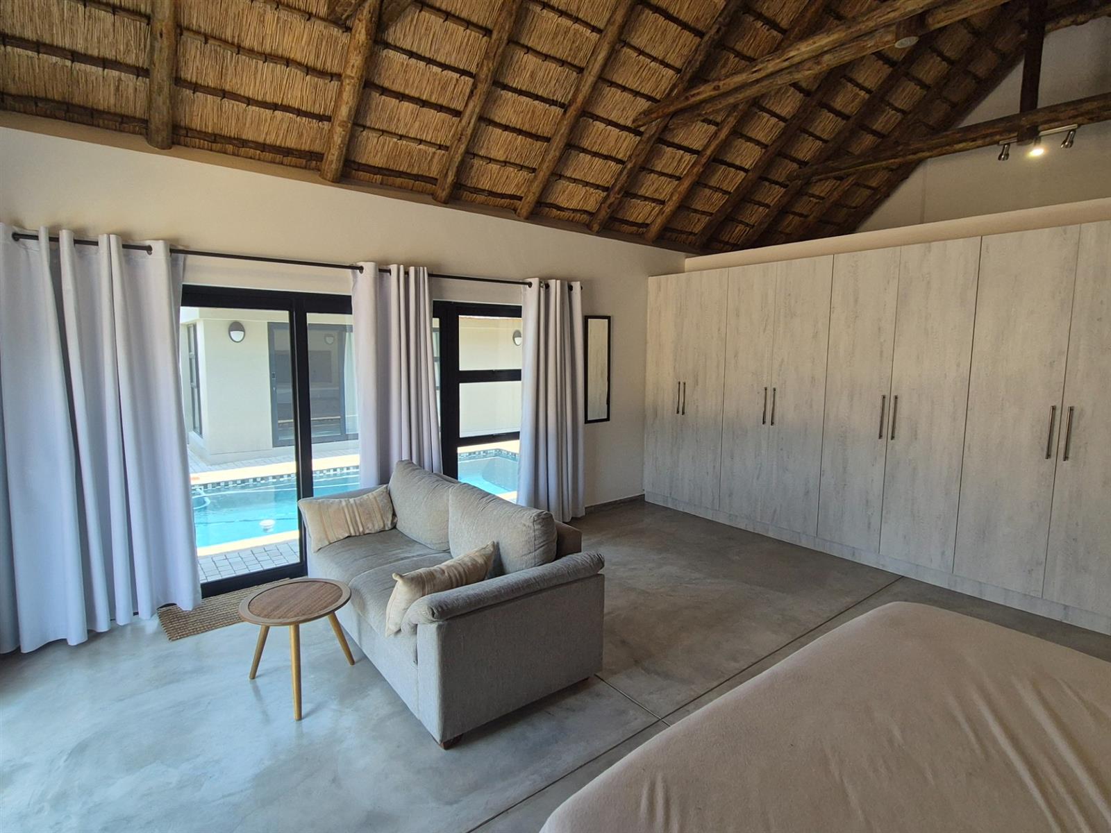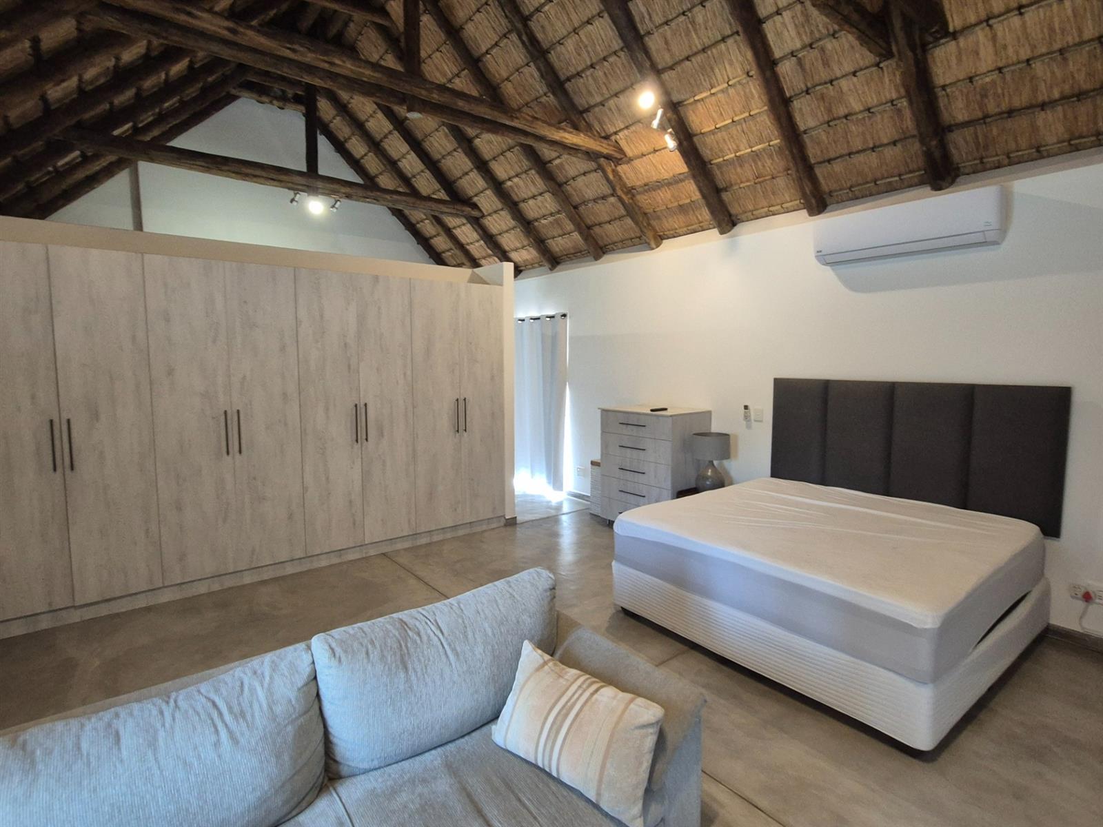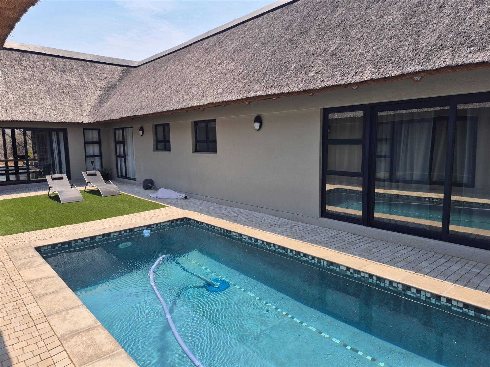 The mansion is clay brick built covered by 360 m2 thatch roofing in excellent state, ensuring cool temperatures in the hot summer days. The front of the house is defined by a large entertainment area with seating for 12 people, all under thatch roof with a private outside boma a few meters away, ideal for the popular South African braai under the African sky