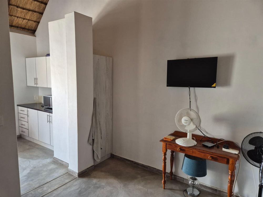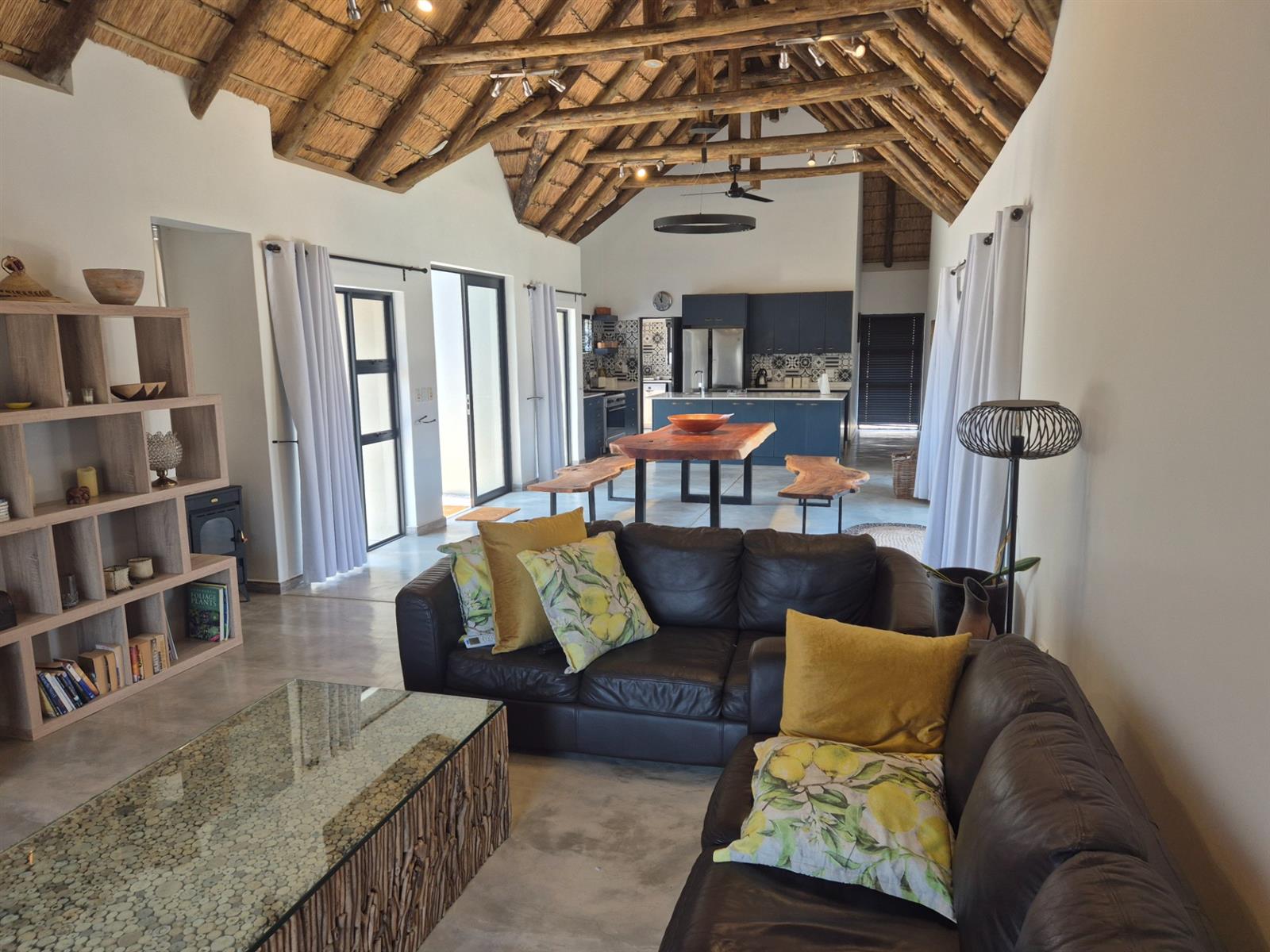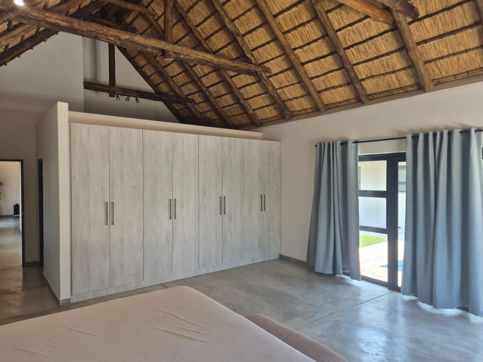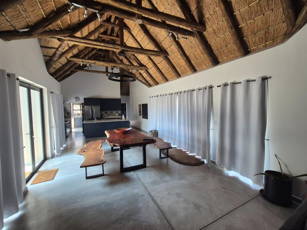 The mansion is clay brick built covered by 360 m2 thatch roofing in excellent state, ensuring cool temperatures in the hot summer days. The front of the house is defined by a large entertainment area with seating for 12 people, all under thatch roof with a private outside boma a few meters away, ideal for the popular South African braai under the African sky