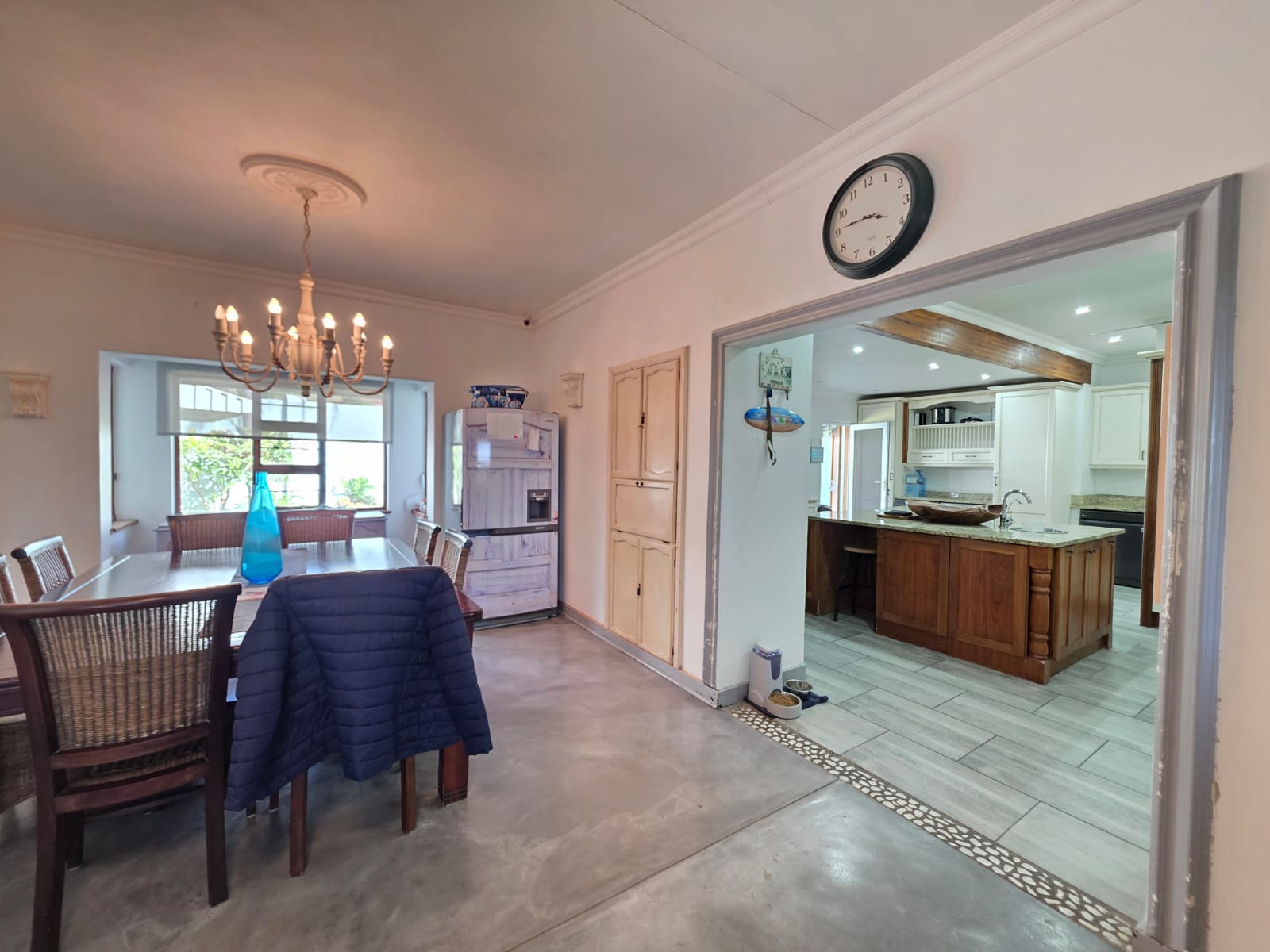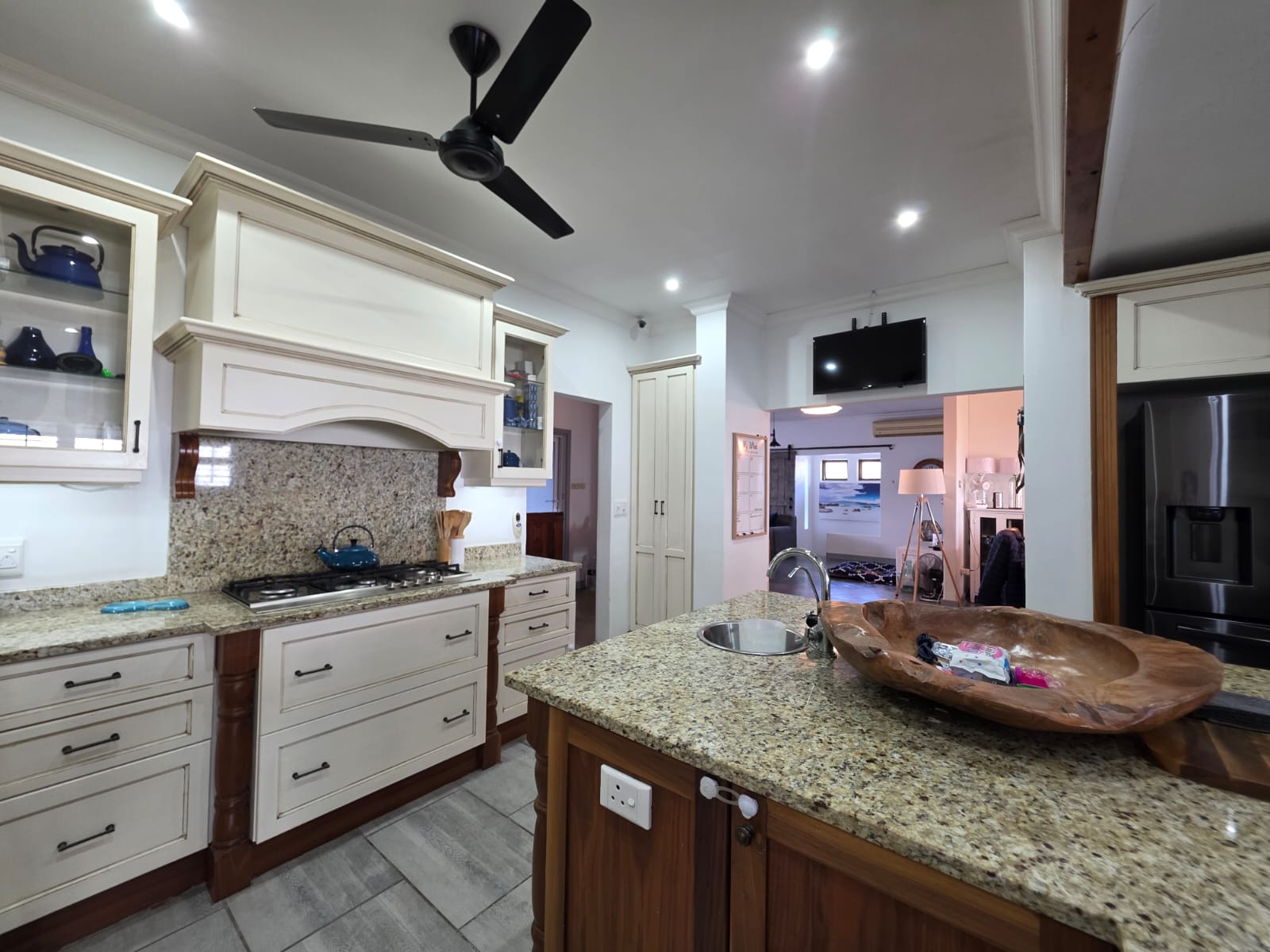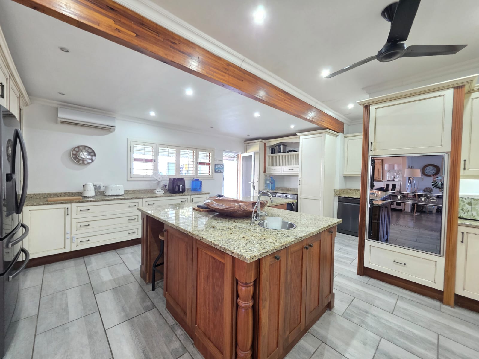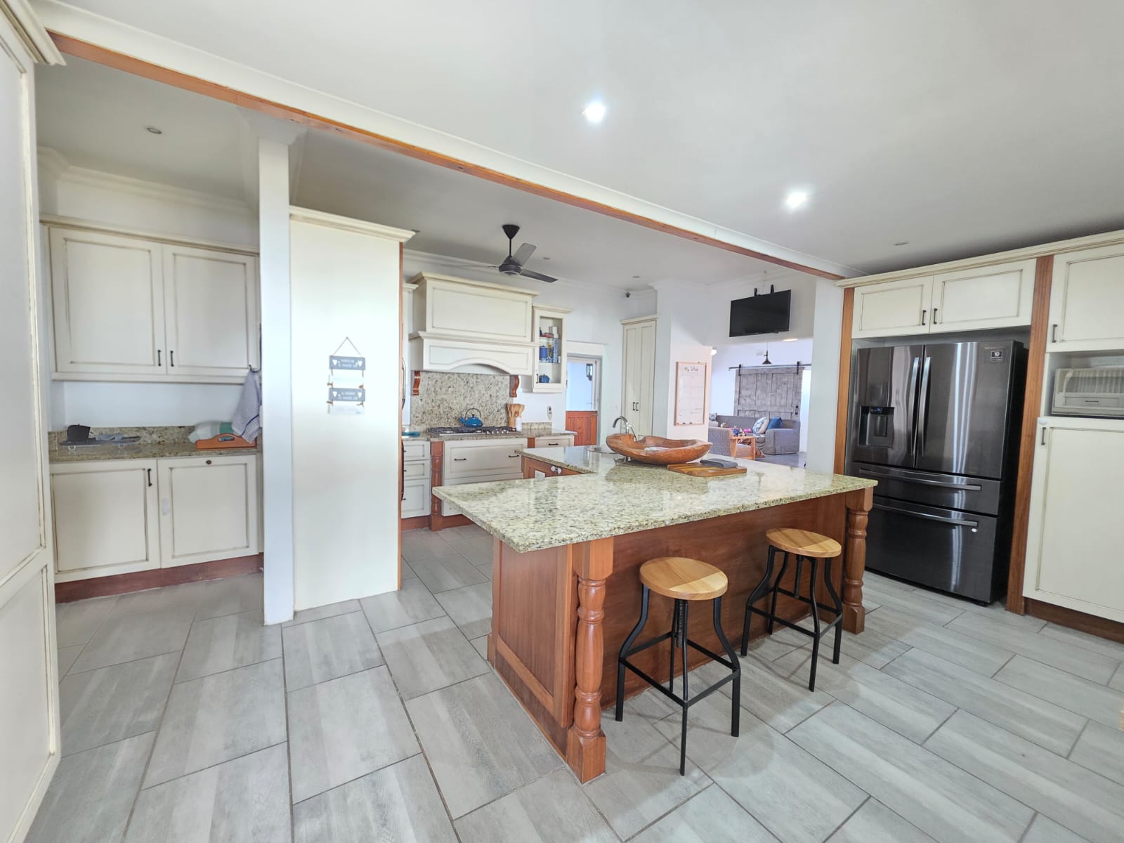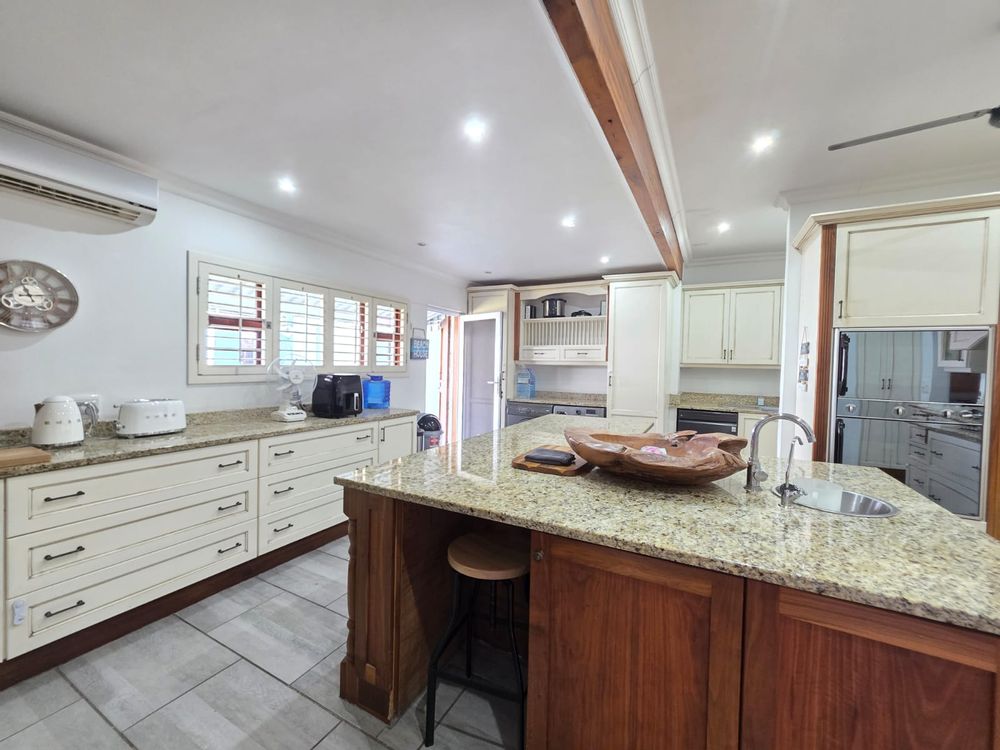 Step into a bright, welcoming home where spacious living areas and thoughtful design create an ideal space for relaxation and entertainment. The heart of the home is the expansive kitchen, a true showstopper with granite countertops, a gas hob, ample cabinetry, and a separate scullery. Whether you're preparing meals for the family or hosting guests, this kitchen is a chef’s dream. Adjacent to the kitchen is a dedicated dining room and a comfortable TV room, both flowing seamlessly out to a large patio where you can enjoy sea views and warm coastal breezes.
