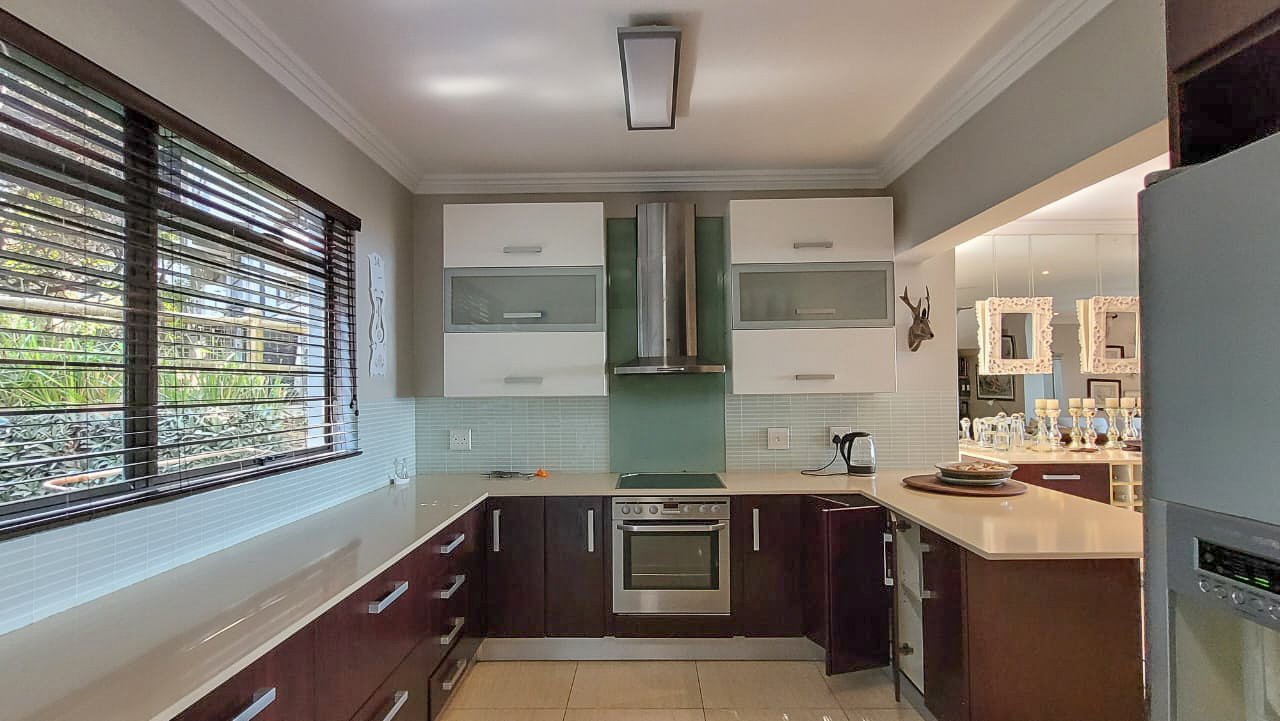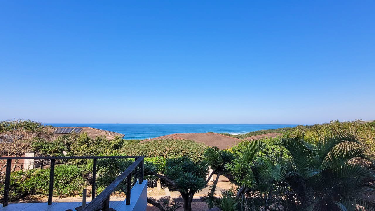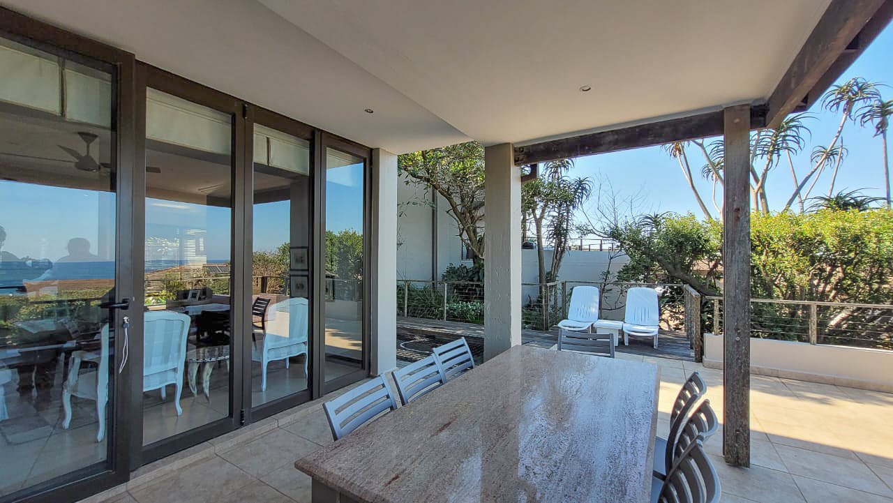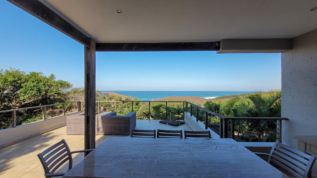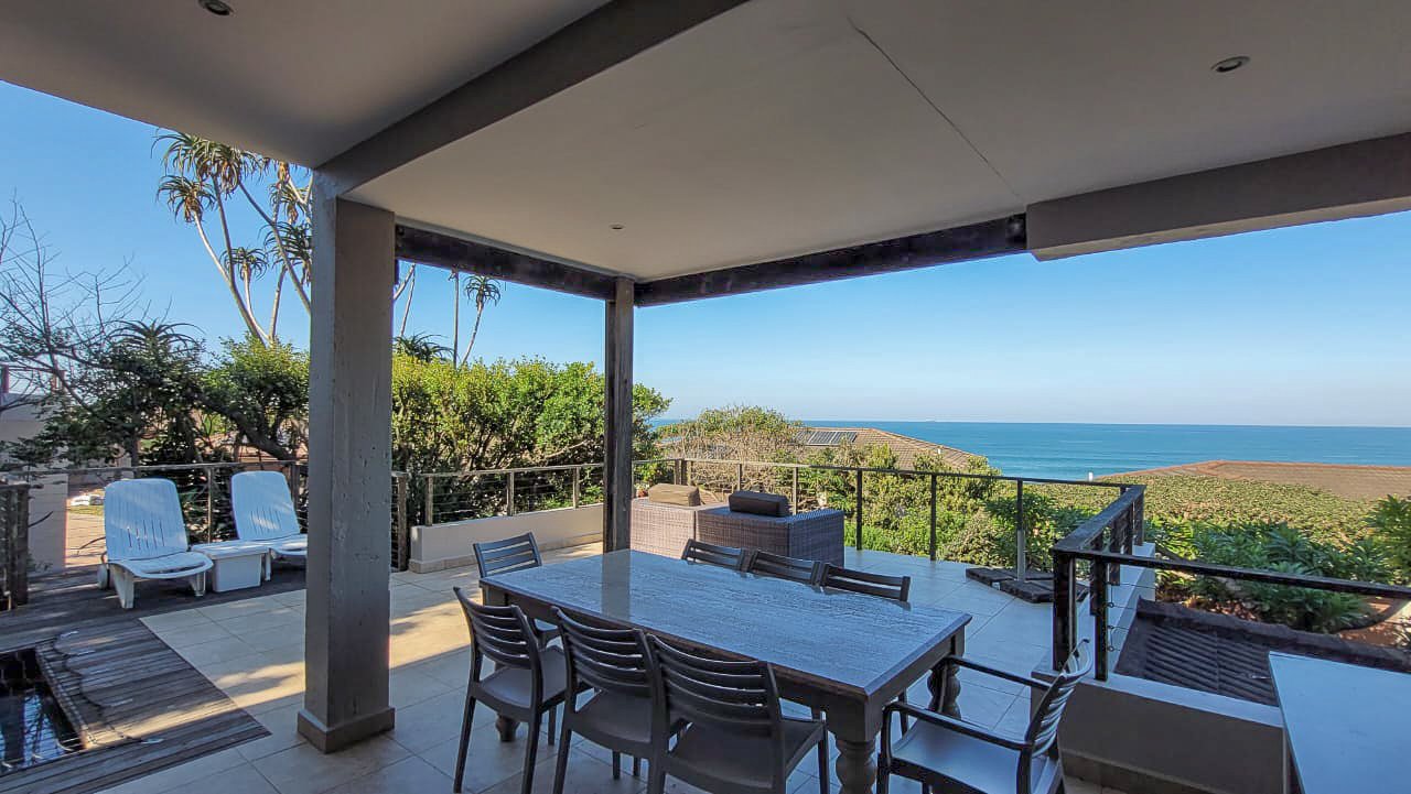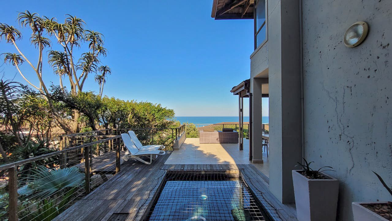 This beautiful Duplex is located in the North Coast Town of Blythedale within a secure Estate called Sovereign Sands. This Secure Complex has direct access to the Beach. Double garage at the bottom with extra storage space and laundry space. The Duplex has the Living space on the 1st floor, with neat as a pin Kitchen , Dinning and the Living room opening up onto the Deck with the most beautiful Seaview's. There is also a build in swimming pool in the Deck. The trees across the street are regularly cut down to allow a magnificent view. The unit feels very spacious, yet private, as there is plenty of space between the neighbor. The outside entertainment area easily seats 40 guests for dinner, and is all on one level. One can braai in the sheltered back yard when the wind blows. Designer kitchen with built-in microwave and Blum grocery cupboard, lift-up horizontal cupboard doors, mosaic tiles and glass backsplash