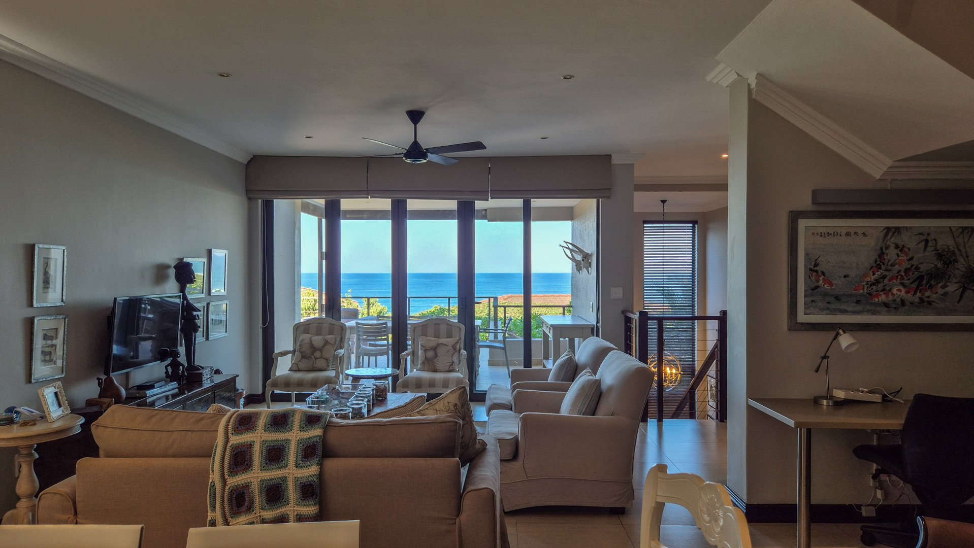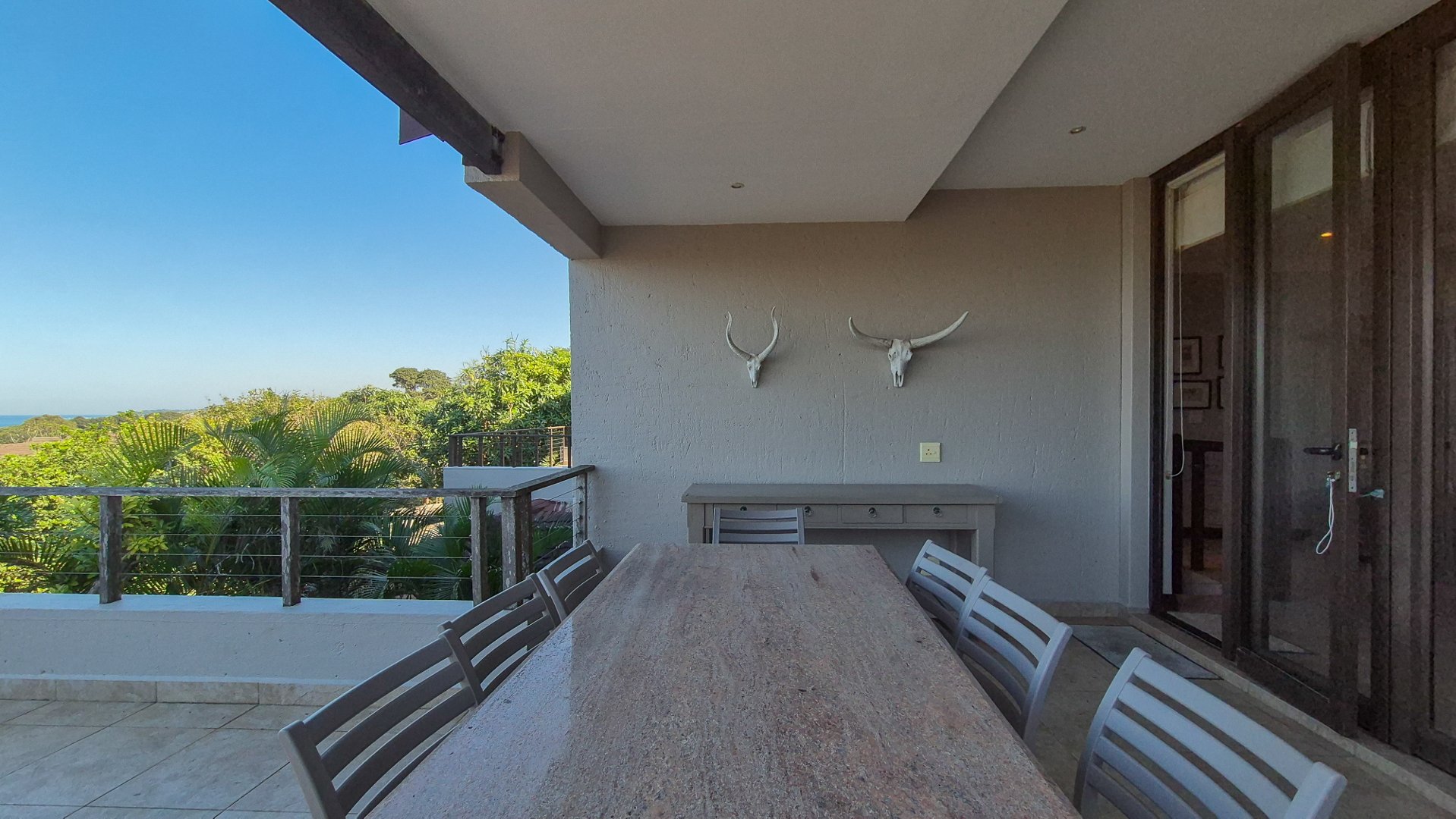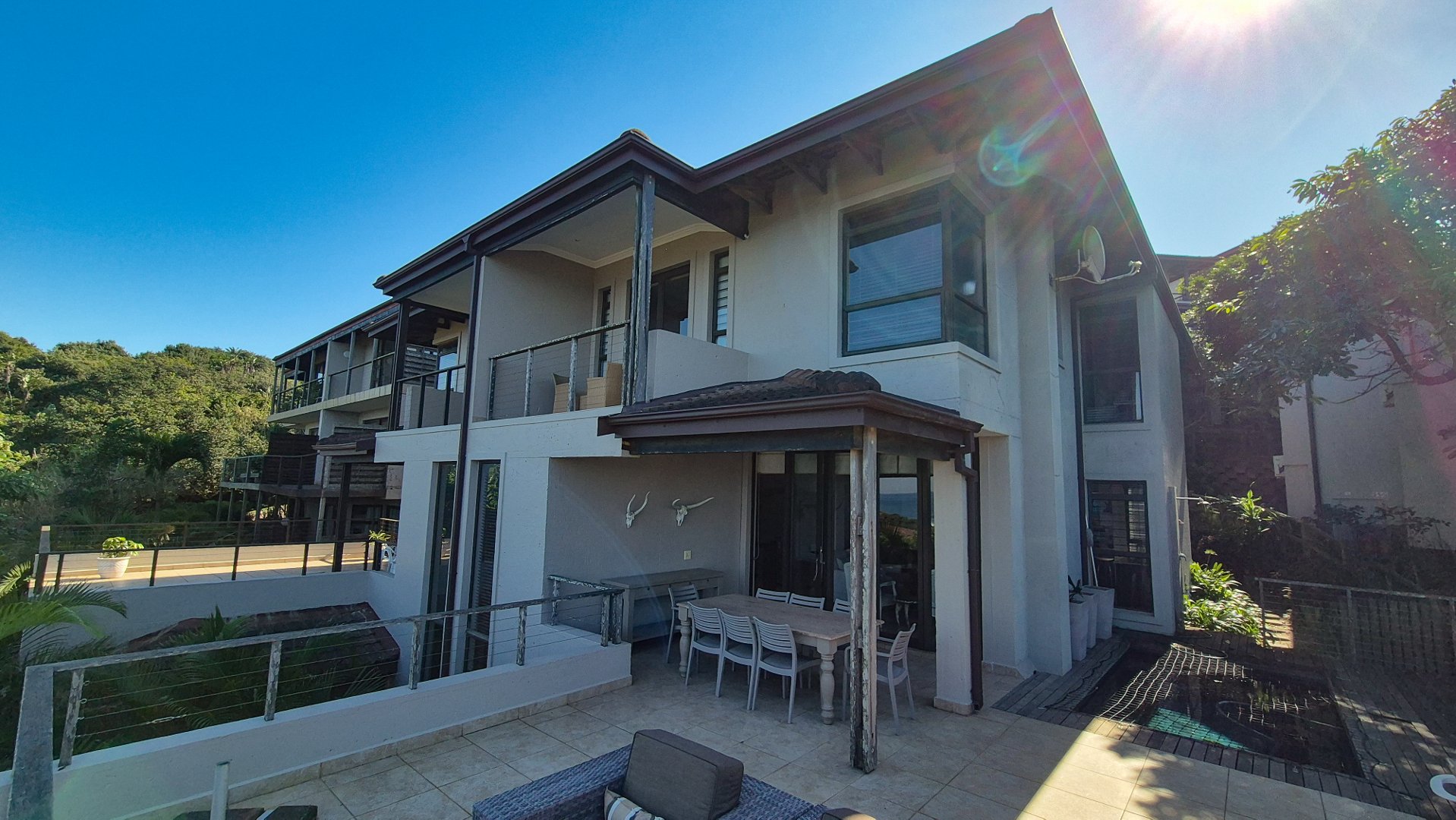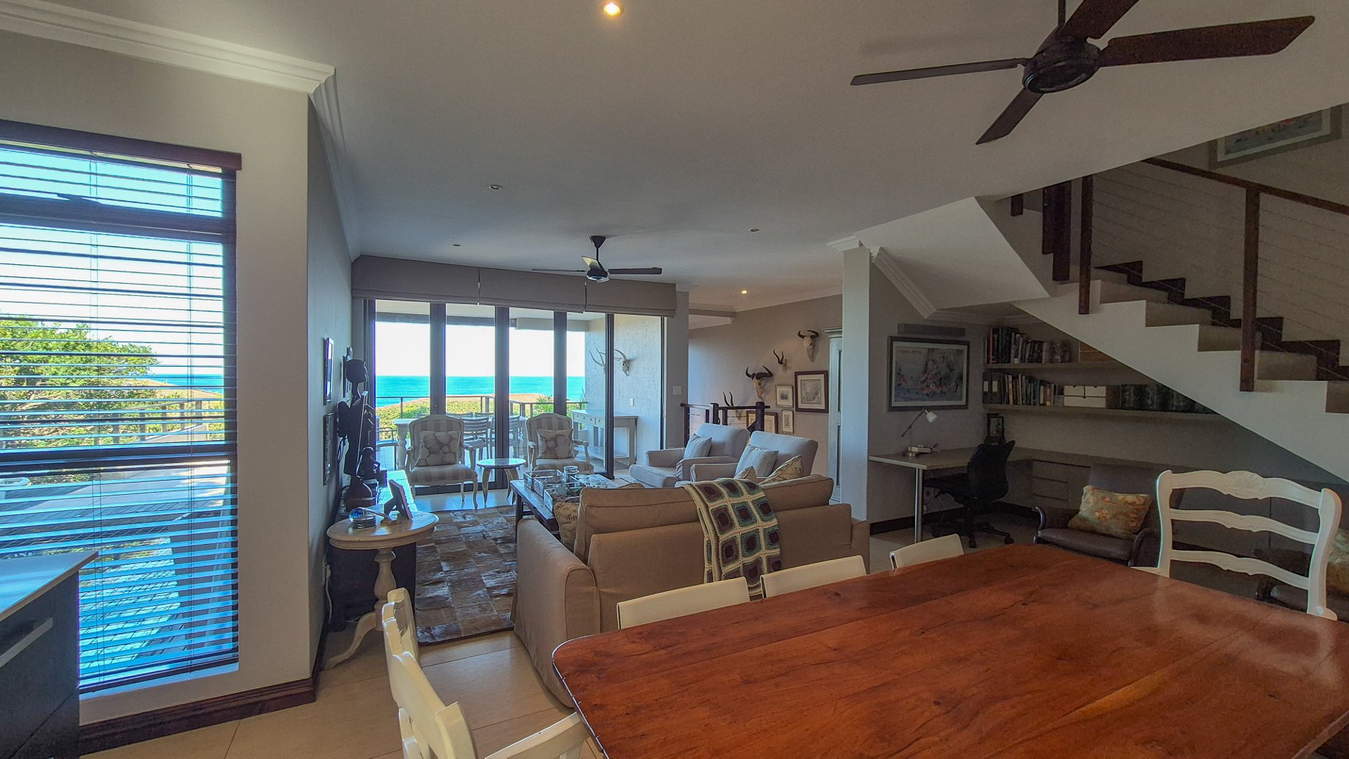 This beautiful Duplex is located in the North Coast Town of Blythedale within a secure Estate called Sovereign Sands. This Secure Complex has direct access to the Beach. Double garage at the bottom with extra storage space and laundry space. The Duplex has the Living space on the 1st floor, with neat as a pin Kitchen , Dinning and the Living room opening up onto the Deck with the most beautiful Seaview's. There is also a build in swimming pool in the Deck. The trees across the street are regularly cut down to allow a magnificent view. The unit feels very spacious, yet private, as there is plenty of space between the neighbor. The outside entertainment area easily seats 40 guests for dinner, and is all on one level. One can braai in the sheltered back yard when the wind blows. Designer kitchen with built-in microwave and Blum grocery cupboard, lift-up horizontal cupboard doors, mosaic tiles and glass backsplash