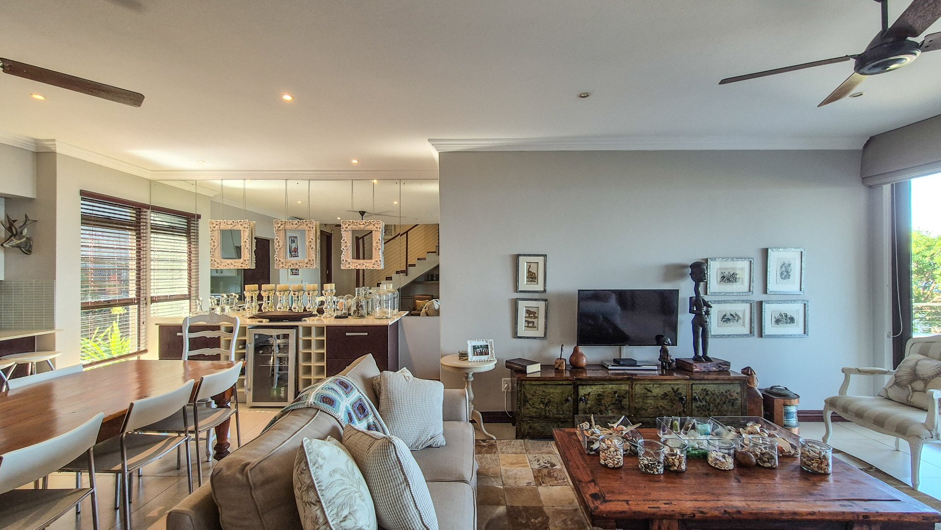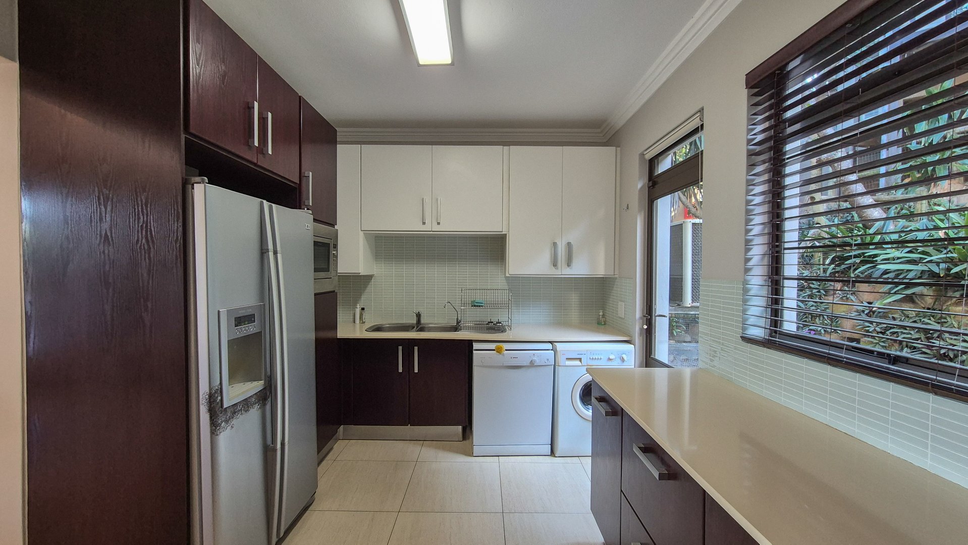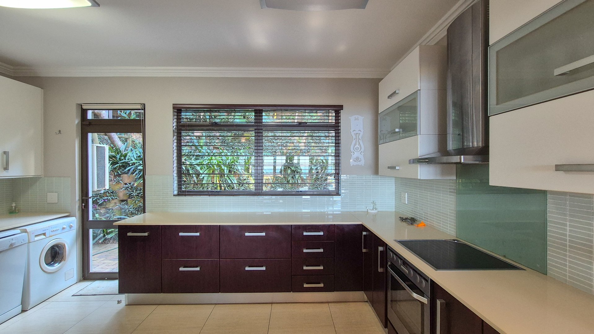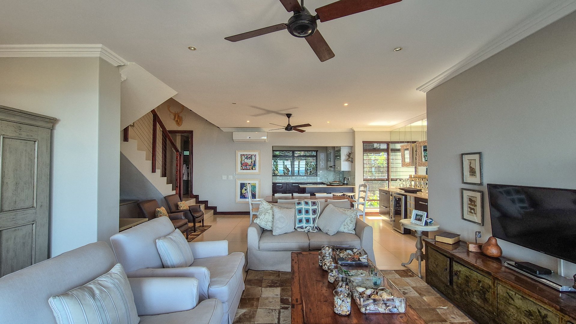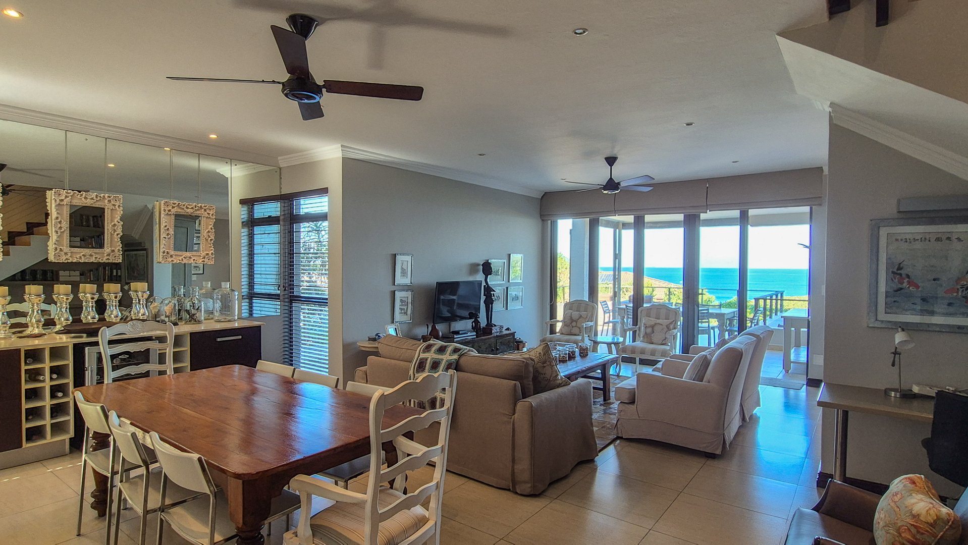 This beautiful Duplex is located in the North Coast Town of Blythedale within a secure Estate called Sovereign Sands. This Secure Complex has direct access to the Beach. Double garage at the bottom with extra storage space and laundry space. The Duplex has the Living space on the 1st floor, with neat as a pin Kitchen , Dinning and the Living room opening up onto the Deck with the most beautiful Seaview's. There is also a build in swimming pool in the Deck. The trees across the street are regularly cut down to allow a magnificent view. The unit feels very spacious, yet private, as there is plenty of space between the neighbor. The outside entertainment area easily seats 40 guests for dinner, and is all on one level. One can braai in the sheltered back yard when the wind blows. Designer kitchen with built-in microwave and Blum grocery cupboard, lift-up horizontal cupboard doors, mosaic tiles and glass backsplash