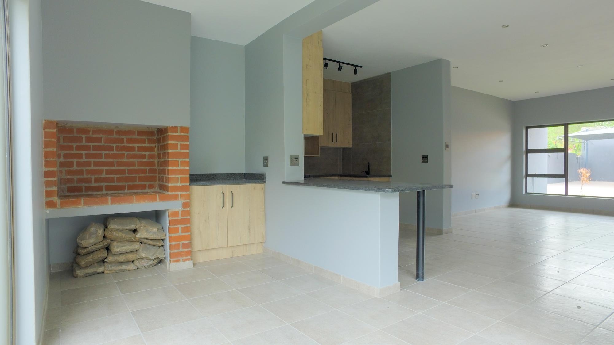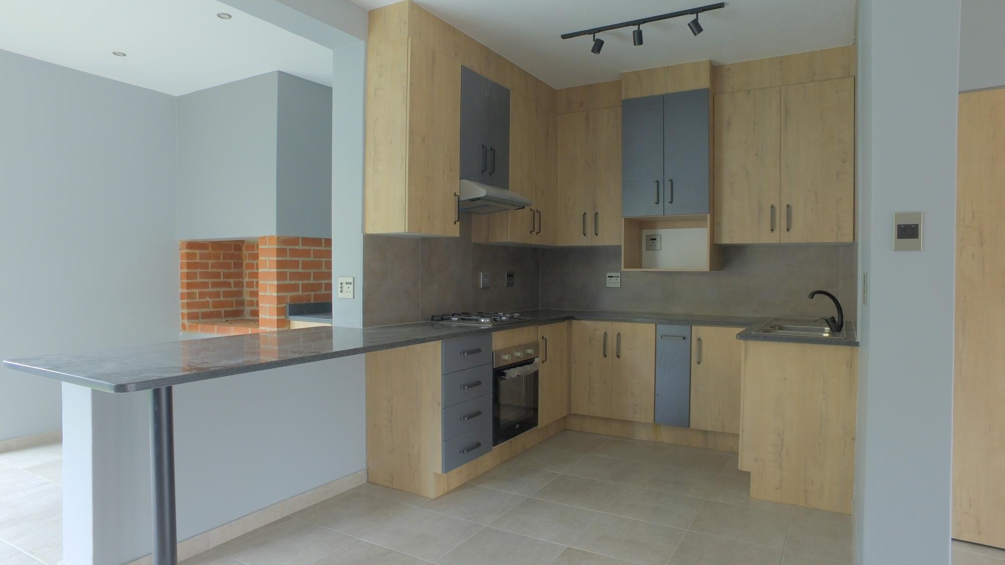 Enjoy the open-plan layout, which seamlessly connects the living area to a chic kitchen. Designed with ample cupboard and counter space, the kitchen features a gas hob, under-counter oven, extractor fan, and stylish finishes throughout. The dining area, with its built-in braai, is ideal for year-round entertaining.