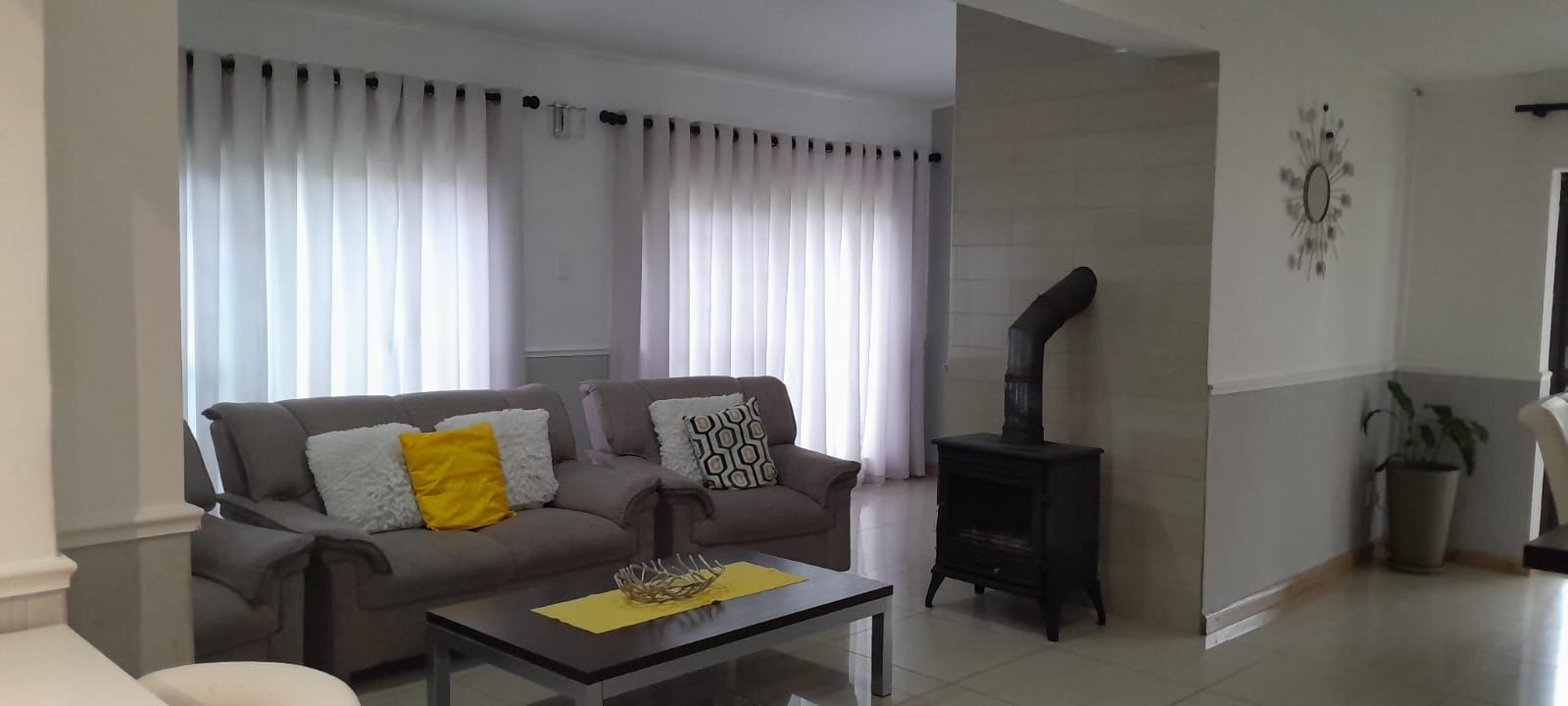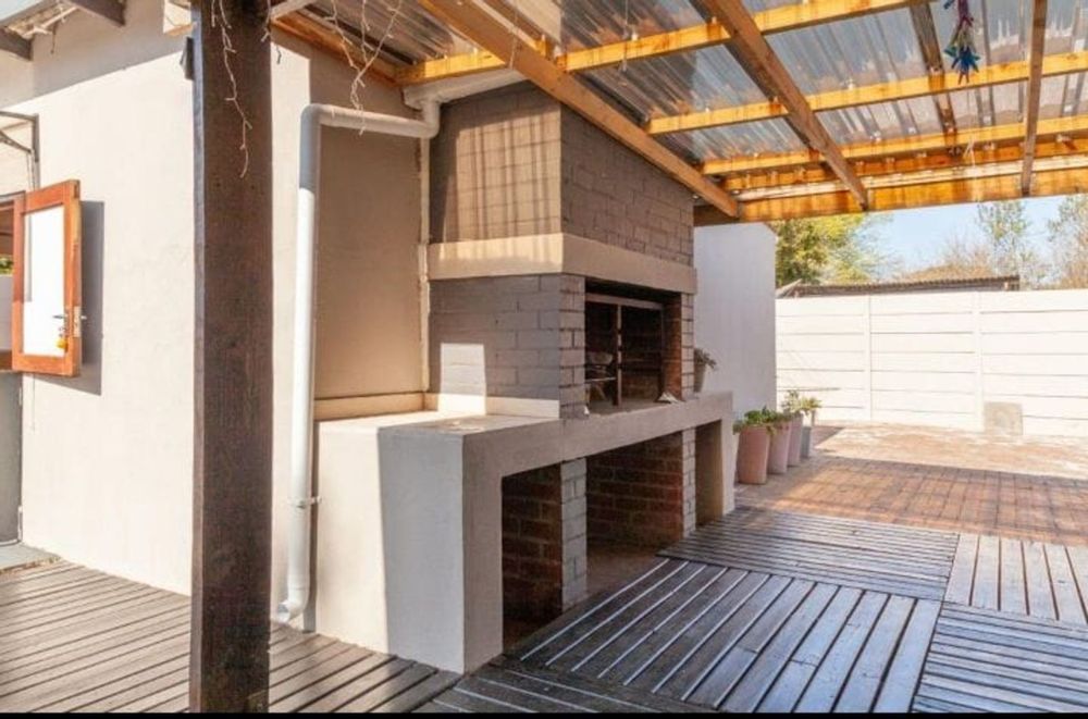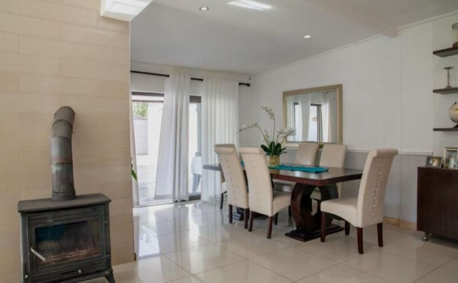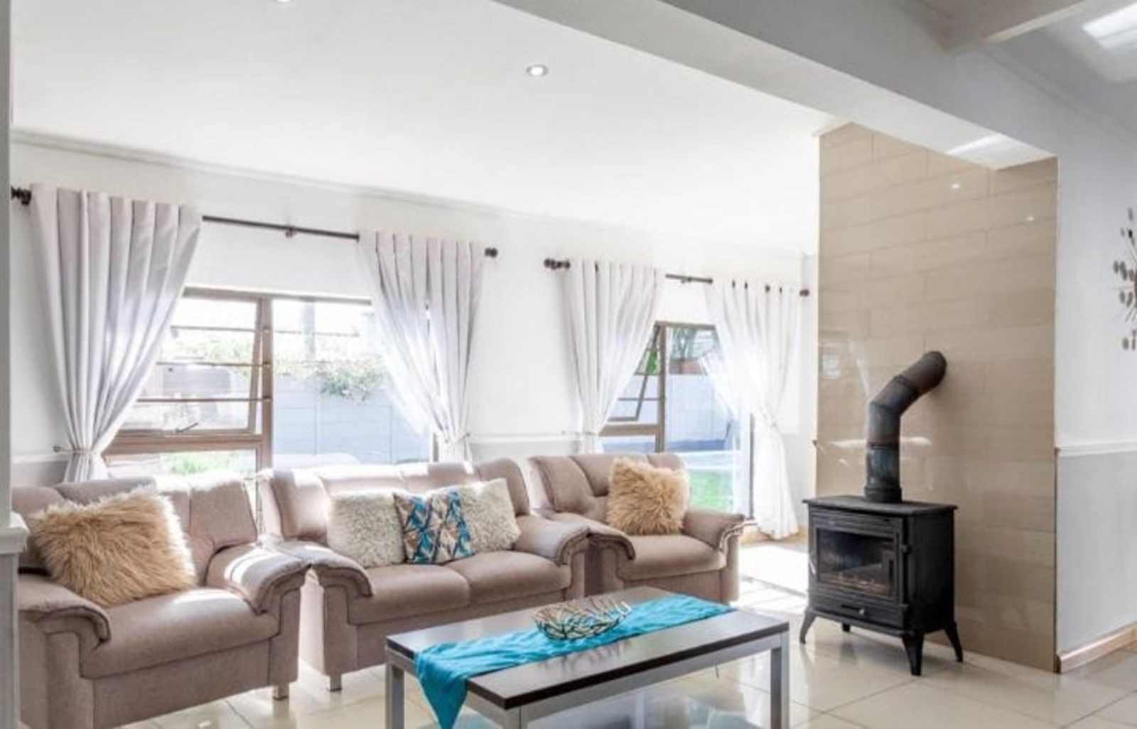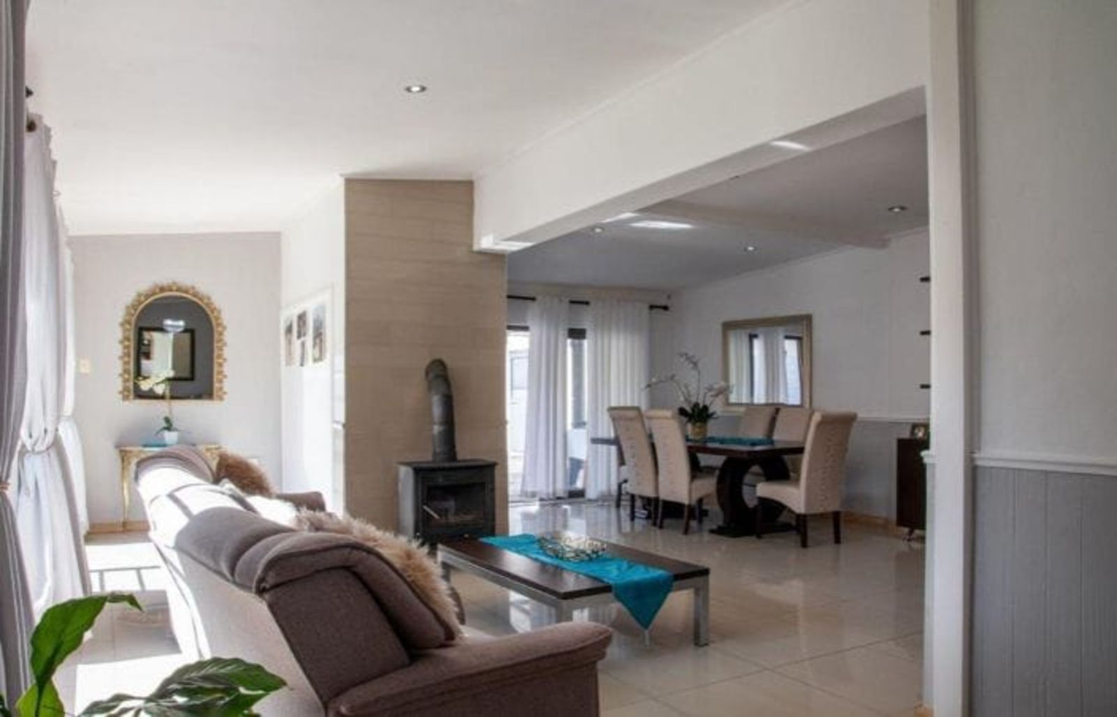 The living room boasts a cozy fireplace, perfect for those chilly winter nights. Sliding doors lead to an extended, covered deck with a built-in braai, offering stunning views of the pool and surrounding mountains.
